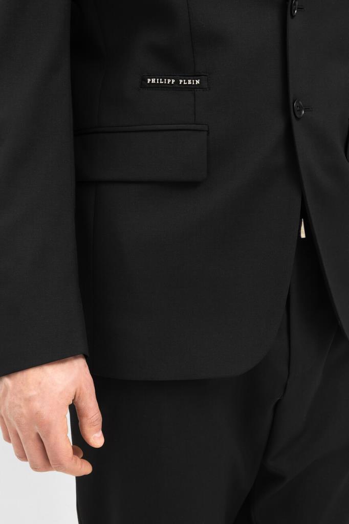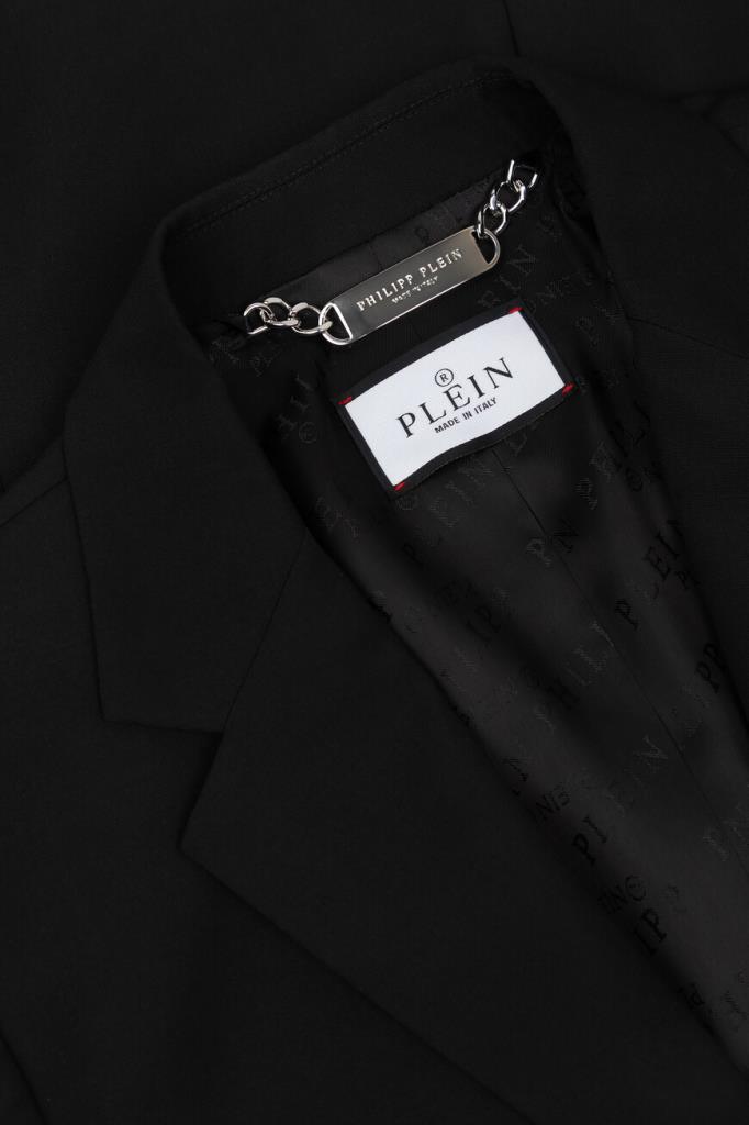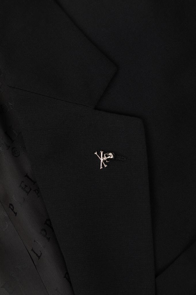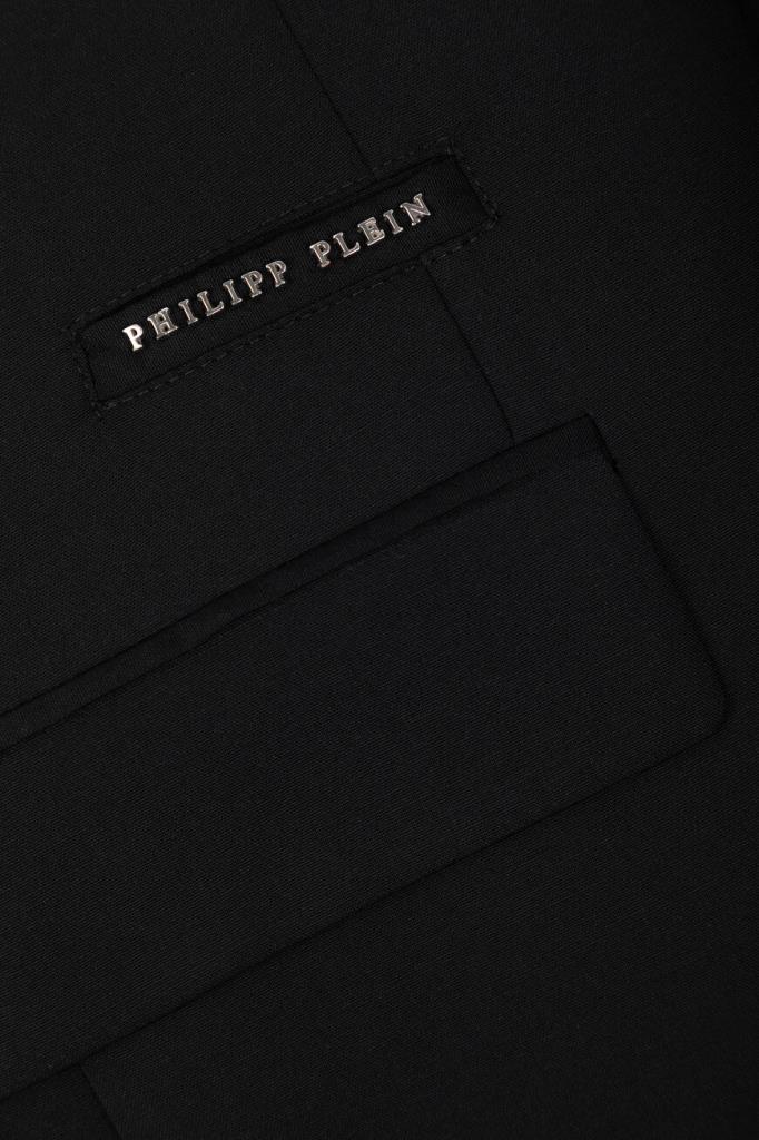 Лёгкий пиджак Jogger от бренда Philipp Plein с центральной шлицей сзади. Изделие выполнено из эластичного трикотажа на основе прочного полиэфира и мягкой вирджинской шерсти чёрного цвета. Декором выступают знаковые элементы, изготовленные из серебристого металла: череп на левом лацкане и надпись-лого Дома спереди справа. Модель можно комбинировать с джоггерами на кулиске из той же коллекции.