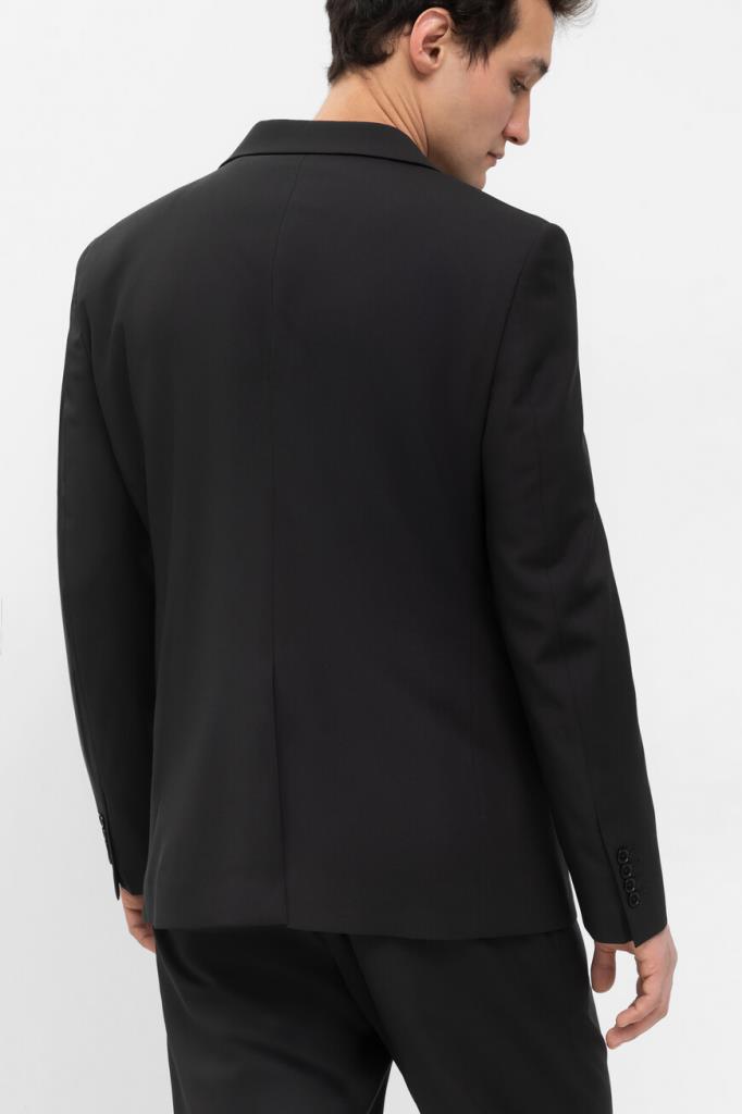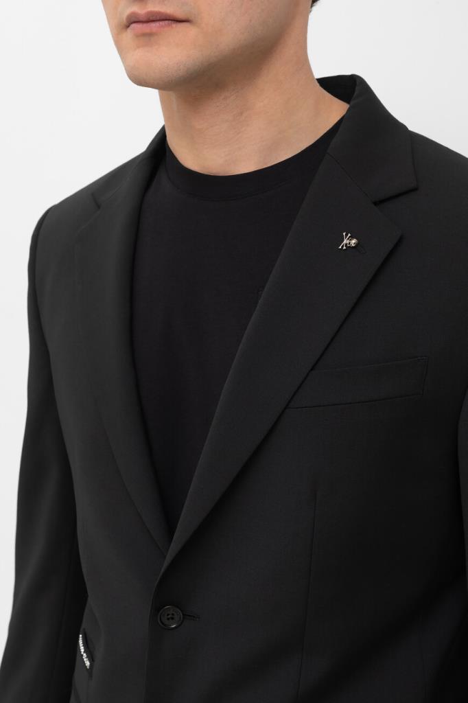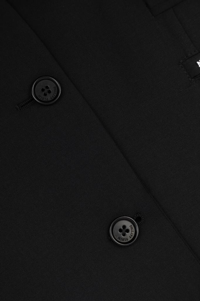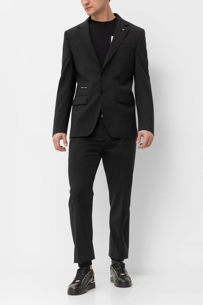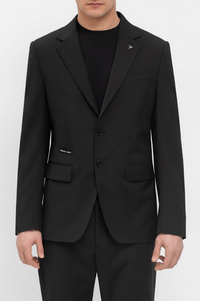 Лёгкий пиджак Jogger от бренда Philipp Plein с центральной шлицей сзади. Изделие выполнено из эластичного трикотажа на основе прочного полиэфира и мягкой вирджинской шерсти чёрного цвета. Декором выступают знаковые элементы, изготовленные из серебристого металла: череп на левом лацкане и надпись-лого Дома спереди справа. Модель можно комбинировать с джоггерами на кулиске из той же коллекции.