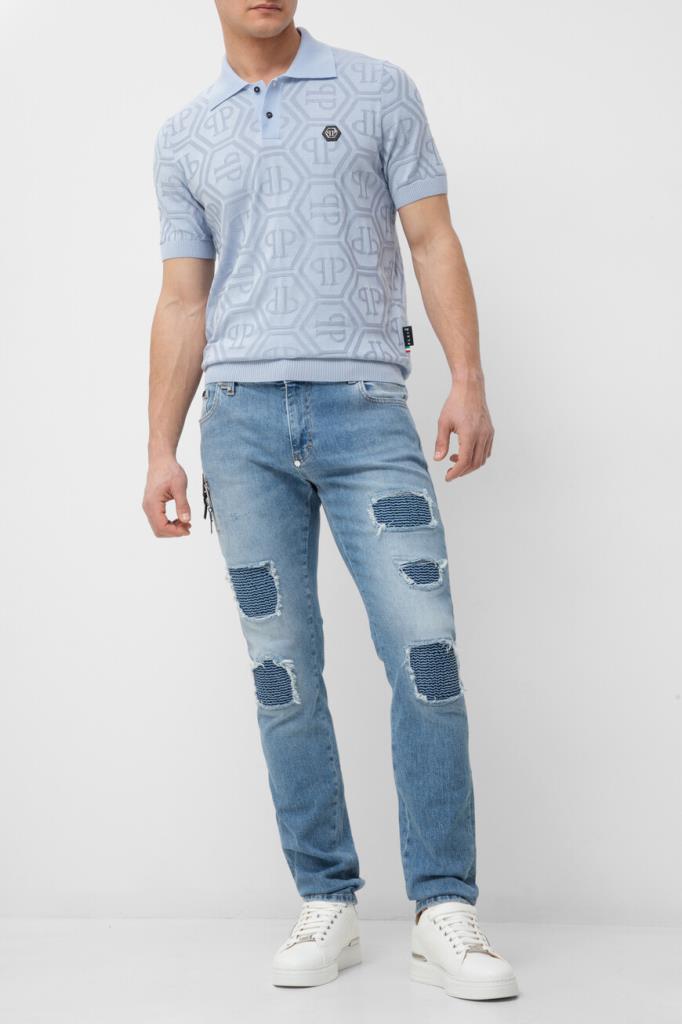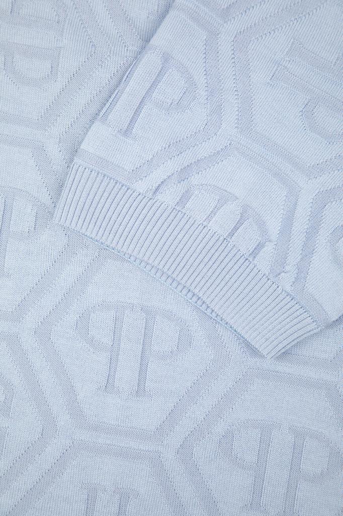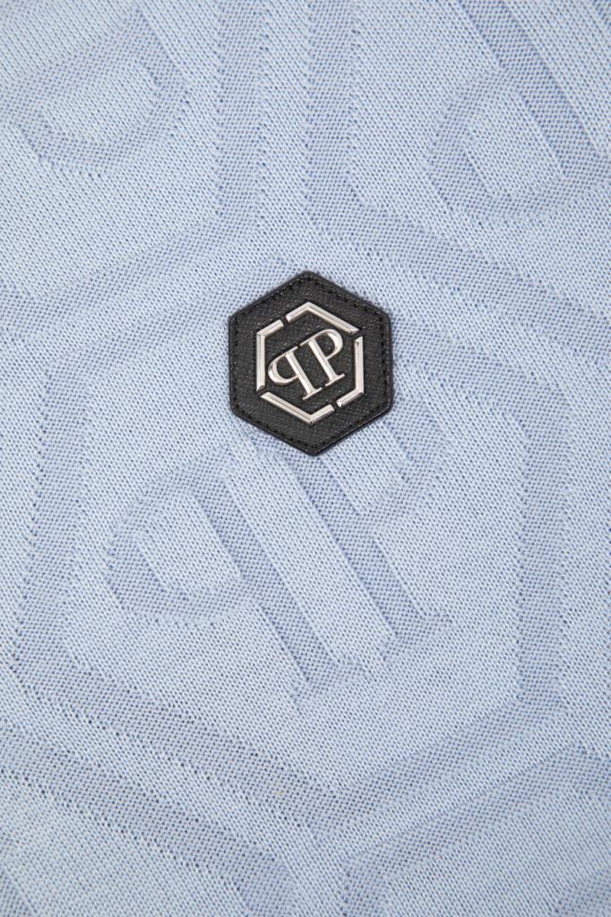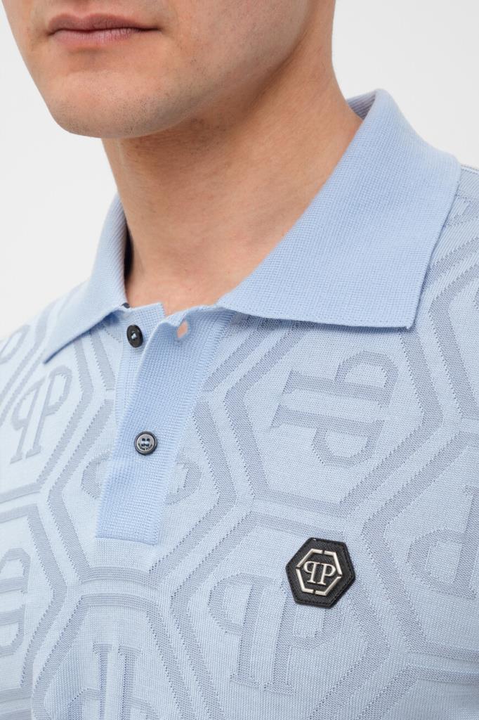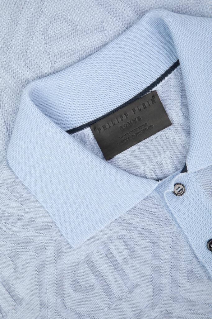 Голубое поло с культовой символикой бренда Philipp Plein. Изделие связано из мягкой мериносовой шерсти и тутового шёлка Mulberry и декорировано жаккардовым геометрическим мотивом в виде знакового шестигранника PP Hexagon. Принадлежность модели прямого силуэта Дому также обозначена чёрной нашивкой из сафьяновой кожи слева на груди, чёрно-белой прямоугольной накладкой с логотипом на кокетке и чёрной вставкой с белой надписью «PLEIN» и миниатюрным флагом Италии сбоку слева.
