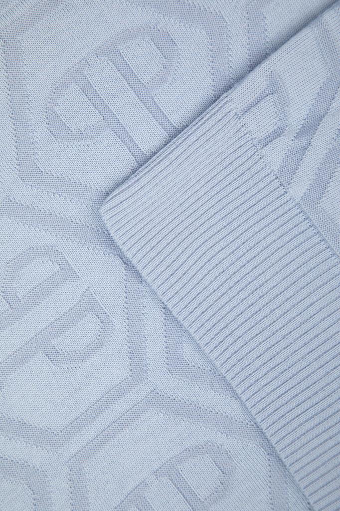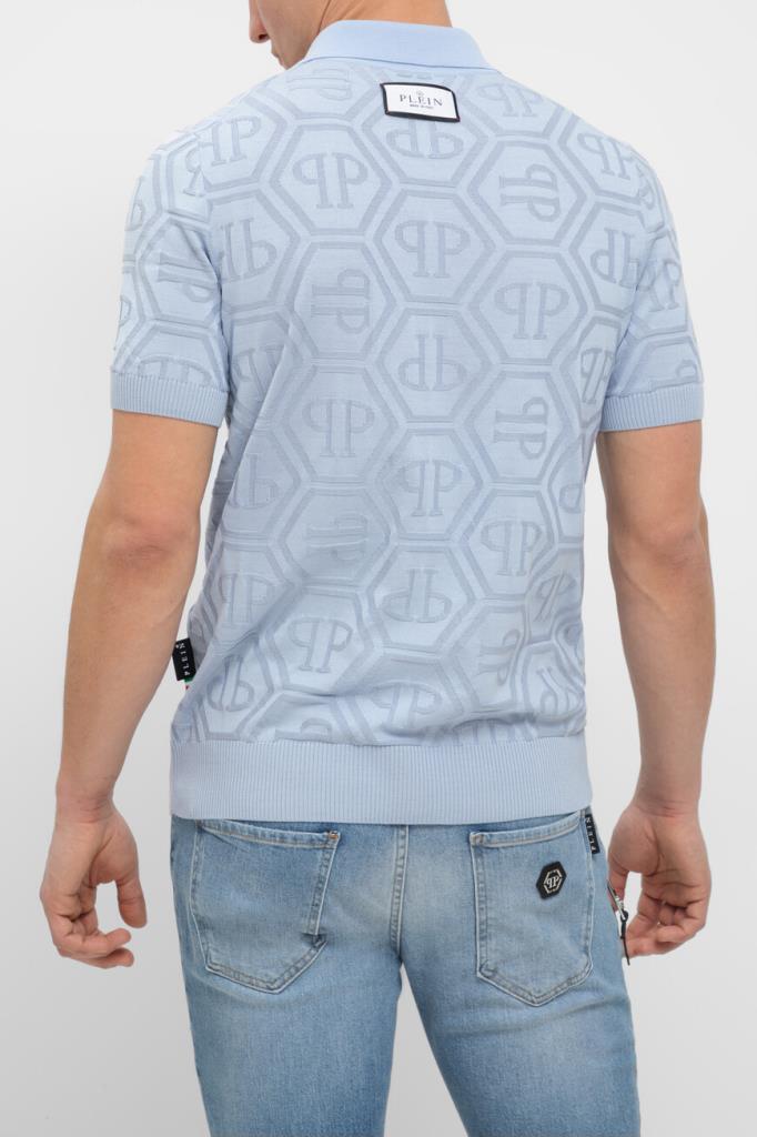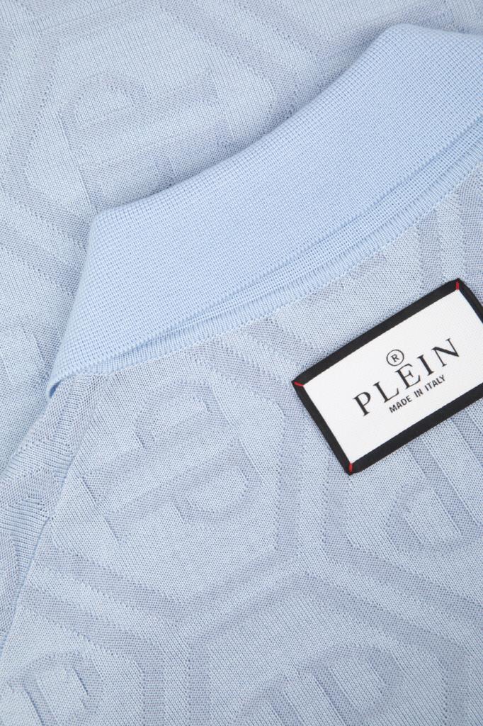 Голубое поло с культовой символикой бренда Philipp Plein. Изделие связано из мягкой мериносовой шерсти и тутового шёлка Mulberry и декорировано жаккардовым геометрическим мотивом в виде знакового шестигранника PP Hexagon. Принадлежность модели прямого силуэта Дому также обозначена чёрной нашивкой из сафьяновой кожи слева на груди, чёрно-белой прямоугольной накладкой с логотипом на кокетке и чёрной вставкой с белой надписью «PLEIN» и миниатюрным флагом Италии сбоку слева.
