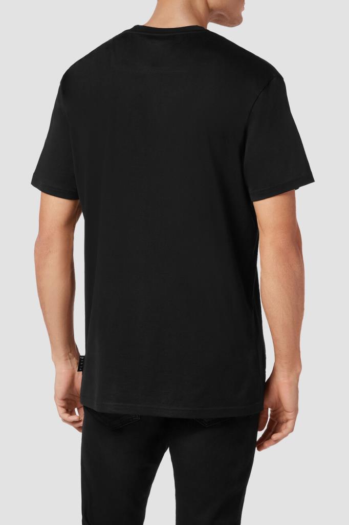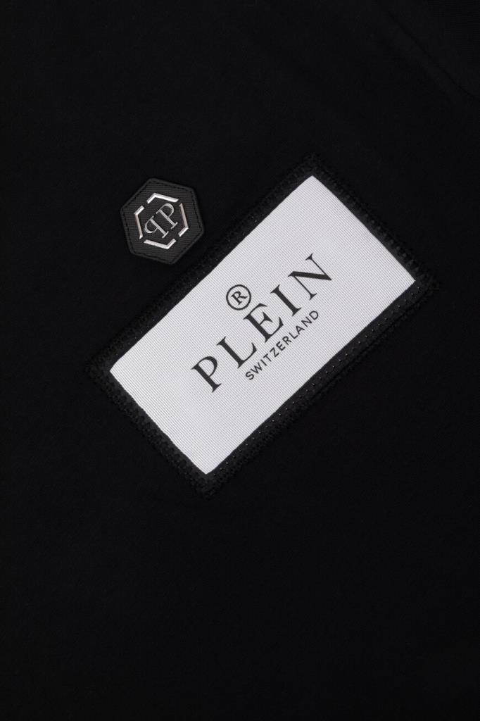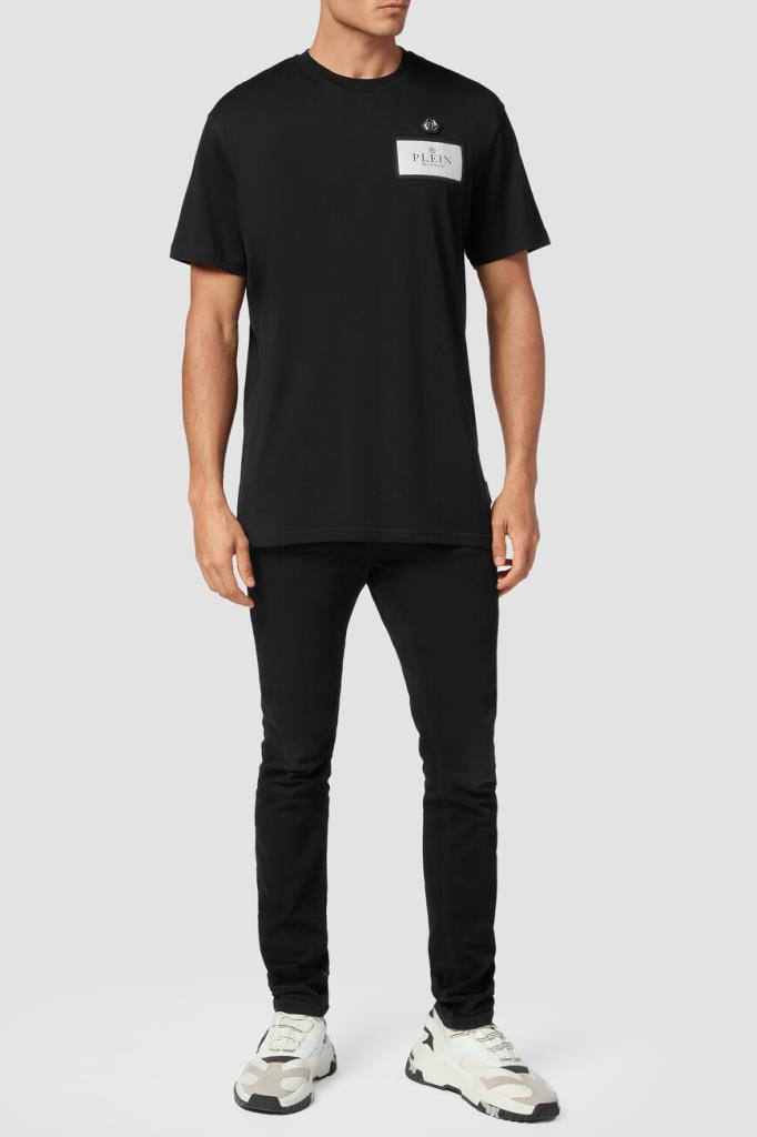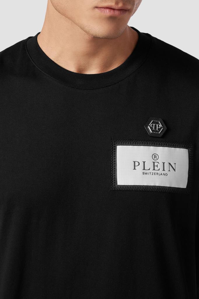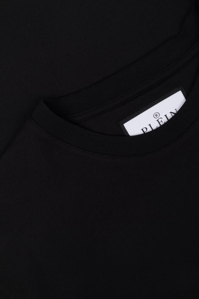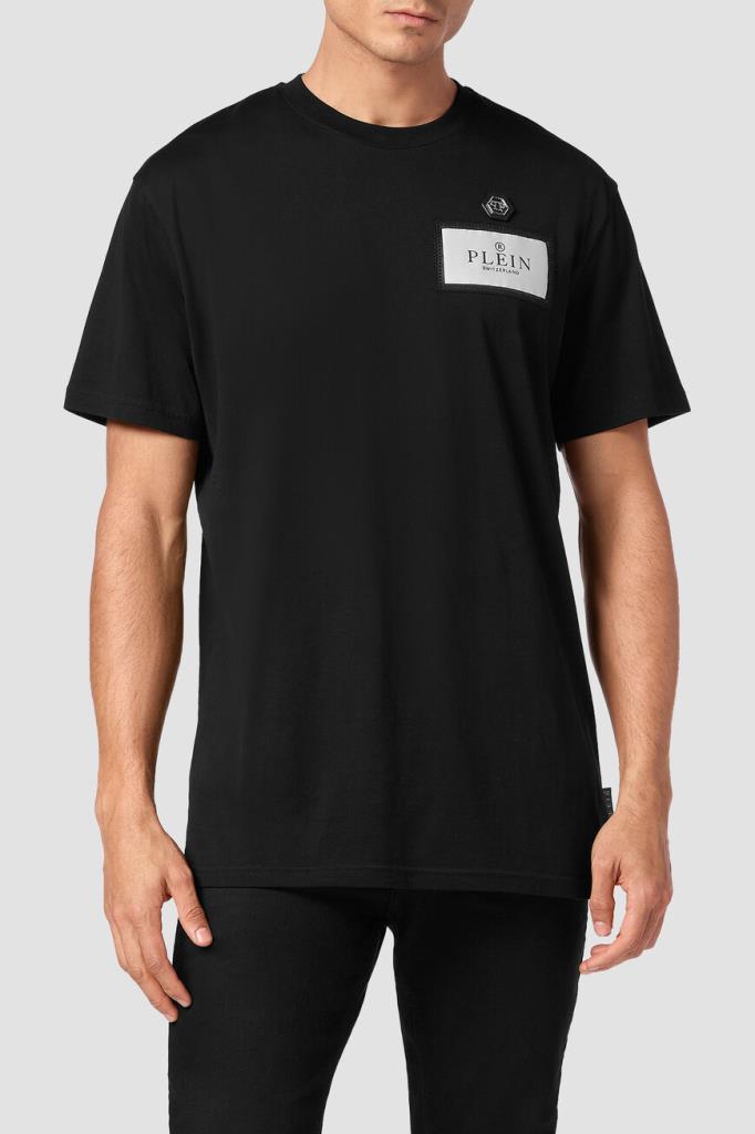Прямая футболка чёрного базового цвета от бренда Philipp Plein. Модель, сшитую из мягкого хлопкового трикотажа, украшают нашивка-шестигранник из сафьяновой кожи PP Hexagon и прямоугольный контрастный лейбл с надписью, размещённые слева на груди. Отделка краёв изделия выполнена двойной прострочкой.