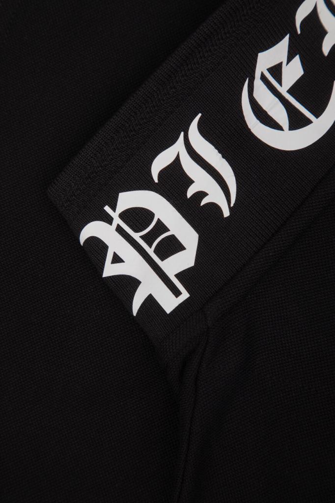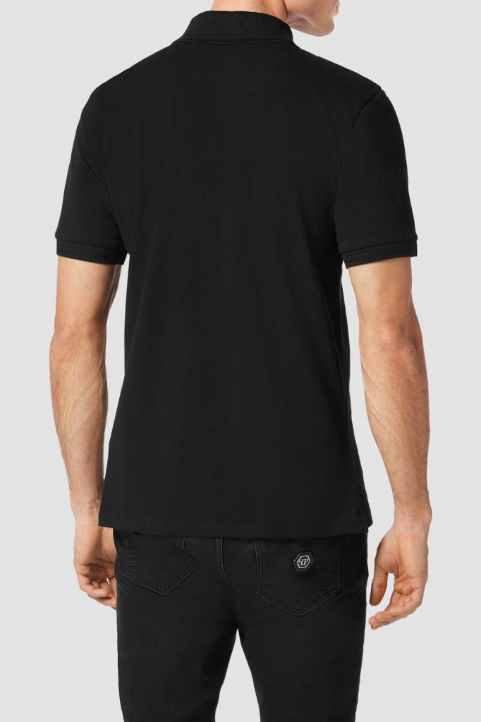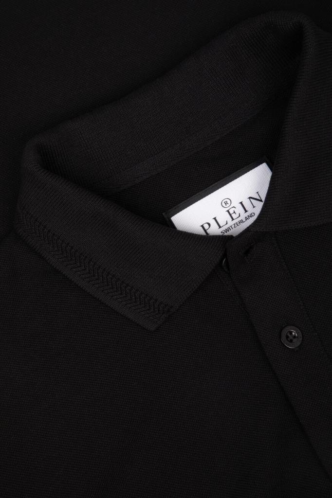 Прилегающее поло Gothic Plein с неглубокими боковыми разрезами. Повседневная модель изготовлена из чёрного хлопкового пике с характерной текстурой. Отличительными деталями являются нашивка-шестигранник из сафьяновой кожи PP Hexagon слева на груди, крупная контрастная надпись «PLEIN» в готическом стиле сзади, видимая при подъёме воротника, и фактурный узор-окантовка в «ёлочку» в тон на горловине и манжетах рукавов.