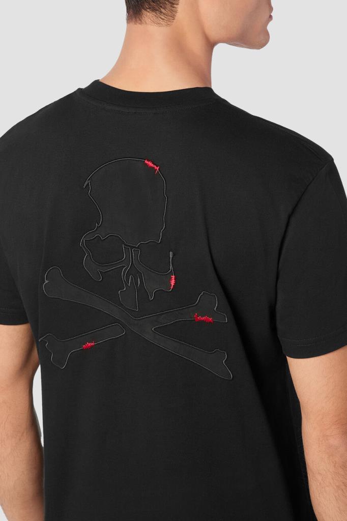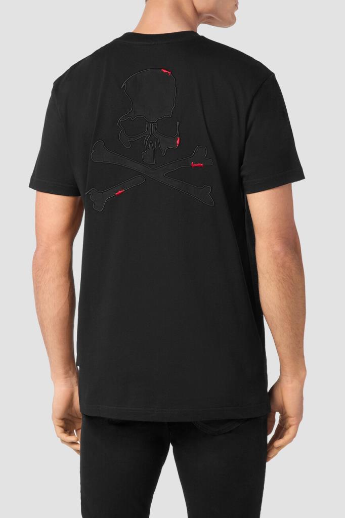 Брендированная футболка Philipp Plein станет основой Ваших повседневных образов. Для пошива модели Skull&Bones прямого силуэта выбран мягкий хлопковый трикотаж. Отличительными особенностями изделия являются отделка краёв двойной прострочкой и наличие знакового декора: нашивки-шестигранника из сафьяновой кожи PP Hexagon слева на груди и крупной вставки с черепом из искусственной замши с вышивкой и вкраплениями ярко-красной нити на спинке.