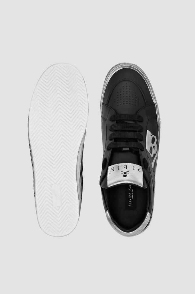 Кожаные сникеры LO-TOP Skull&Bones от бренда Philipp Plein. Современная спортивная модель чёрного цвета украшена серебристыми вставками с черепом и надписью «Plein» на язычке, чёрной надписью «Plein Megastar» сзади и в виде крупного культового черепа на боковинах. Изделие установлено на эргономичную амортизирующую подошву из высокотехнологичной резины с эффектом состаривания и рифлением для максимального сцепления с дорогой.