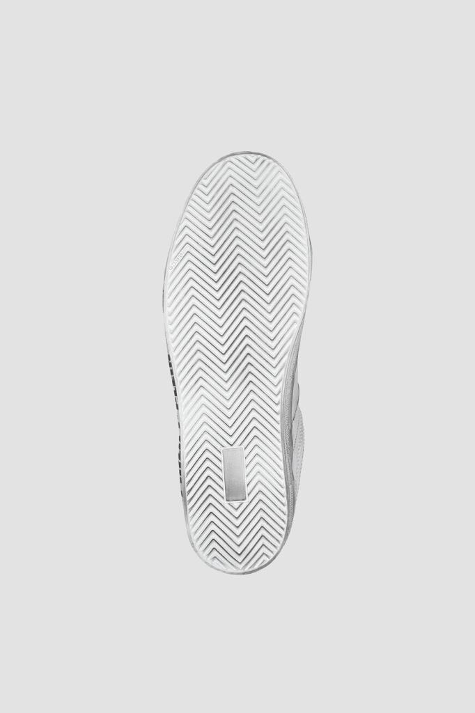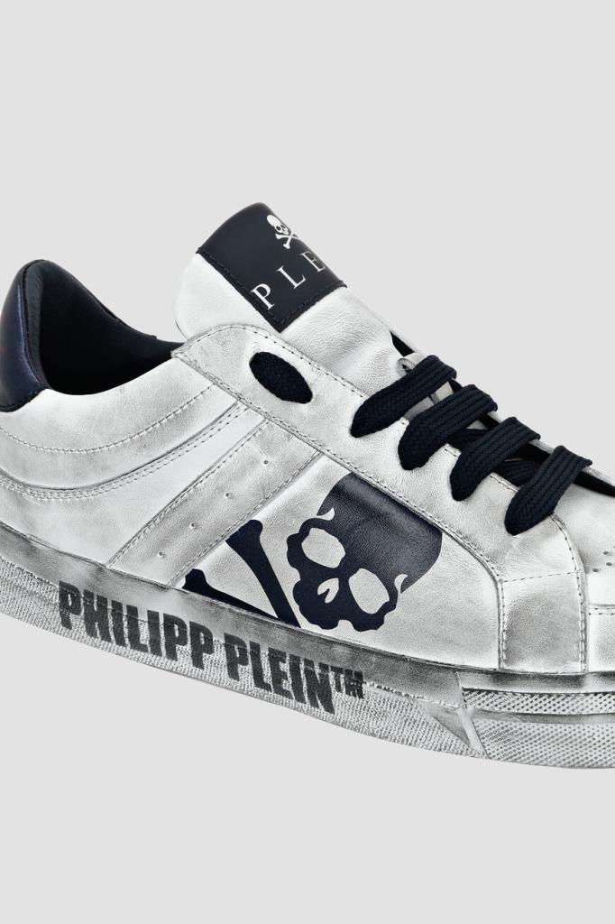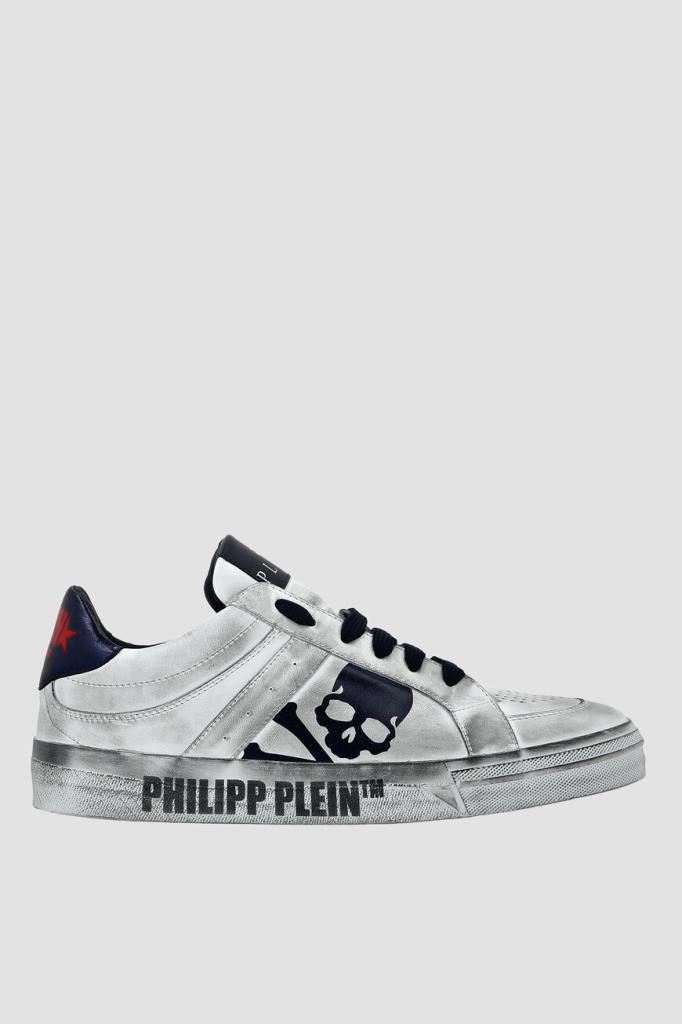 Сникеры LO-TOP Retrokickz ™ от бренда Philipp Plein. Изделие выполнено из мягкой кожи наппа белого цвета с эффектом состаривания. Модель отличается открытым типом шнуровки и перфорацией на носке и боковинах. Атрибутами Дома являются чёрная кожаная вставка с контрастными черепом и надписью «Plein» на язычке, тёмно-синяя вставка с красной надписью «Plein Megastar» сзади и крупный чёрный череп Skull&Bones на боковинах.