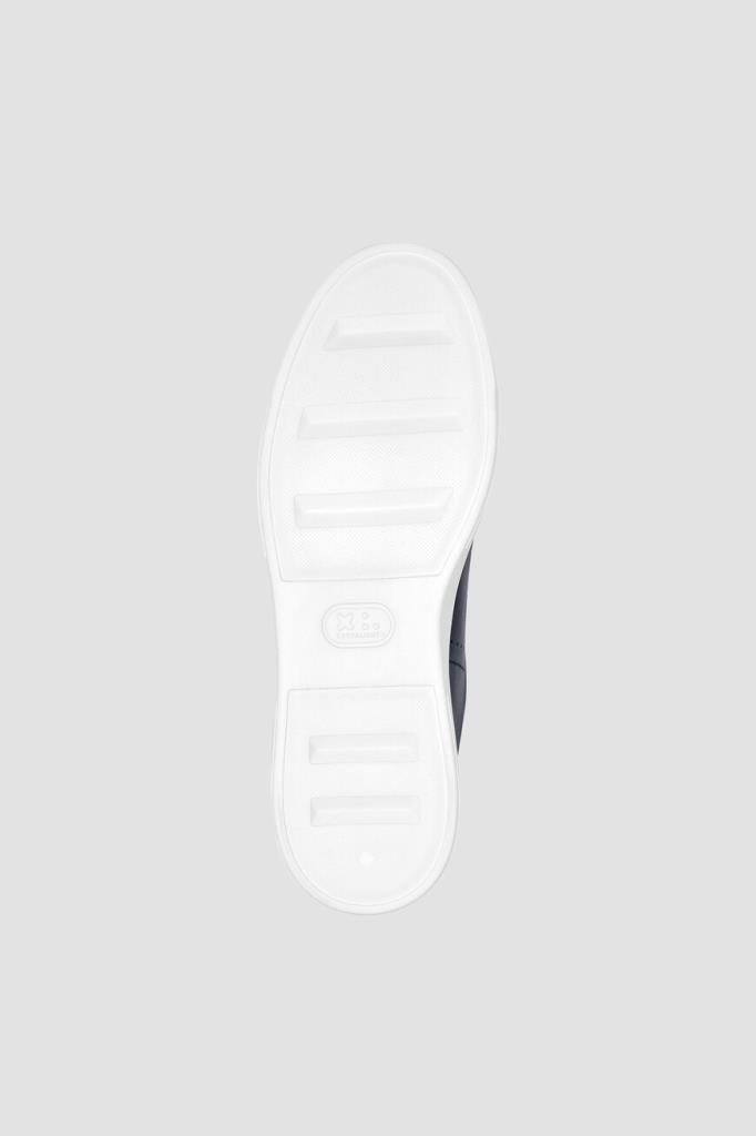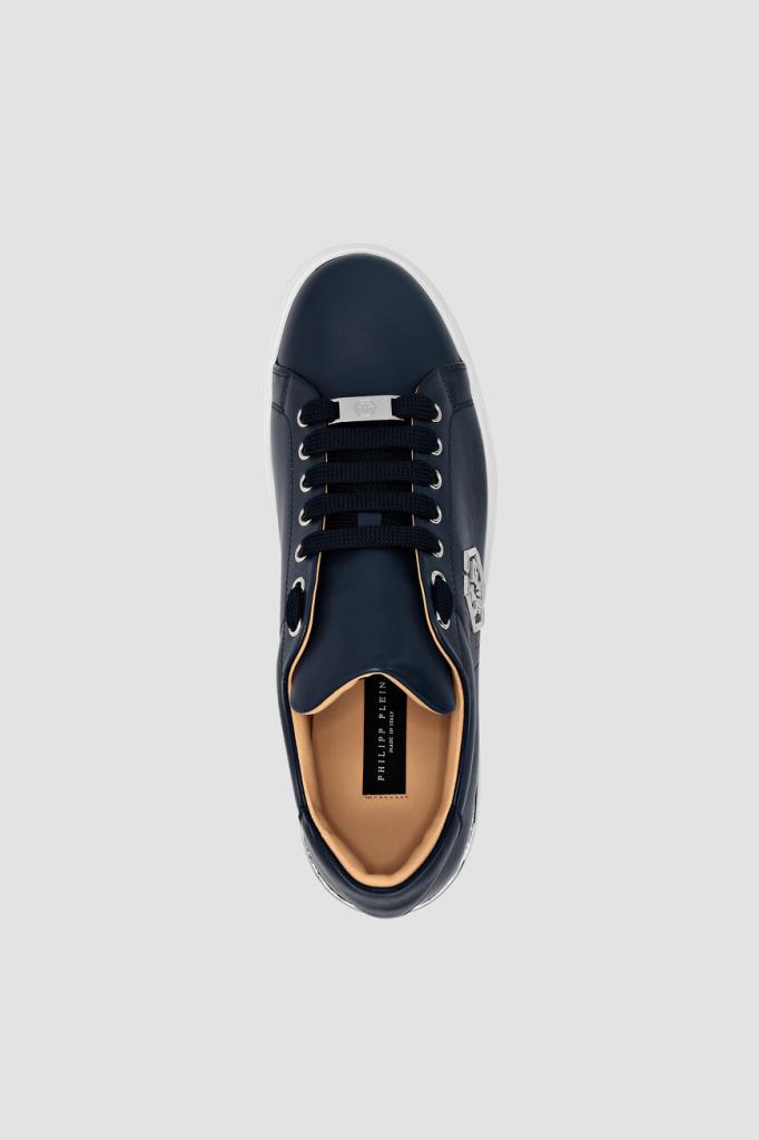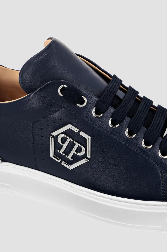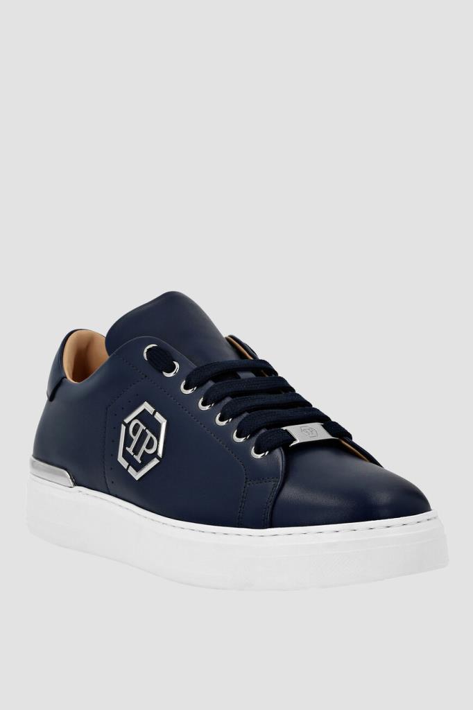 Кожаные сникеры LO-TOP от бренда Philipp Plein. Изделие выполнено в глубоком тёмно-синем оттенке и установлено на плоскую белую подошву из натуральной резины с серебристой металлической вставкой-стабилизатором пятки и рифлением снизу. О принадлежности модели с широкой колодкой Дому напоминают лейбл с выгравированным шестигранником PP Hexagon на шнуровке и крупный никелированный лого-монограмма сбоку.