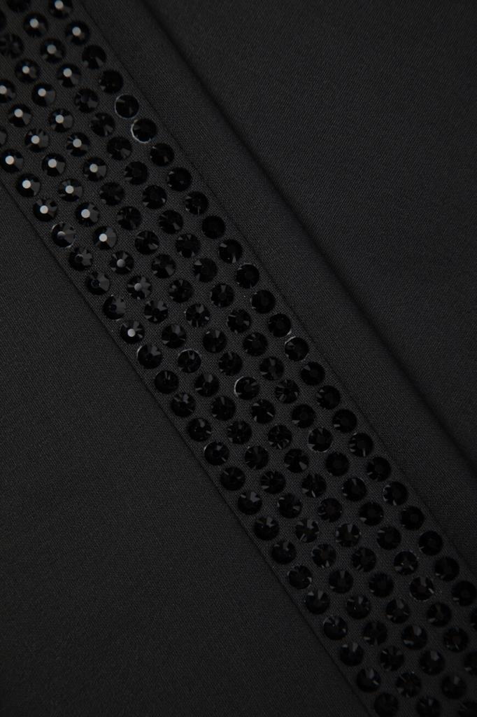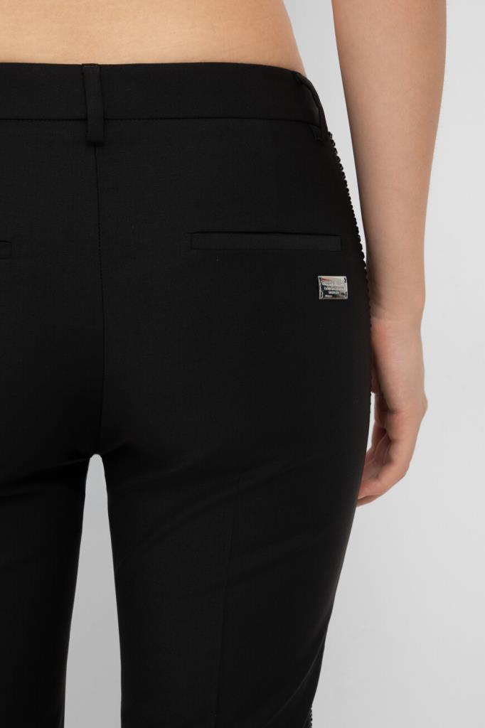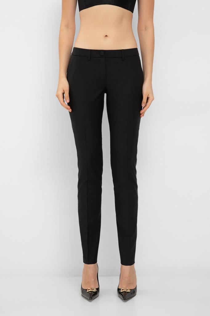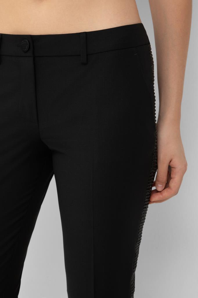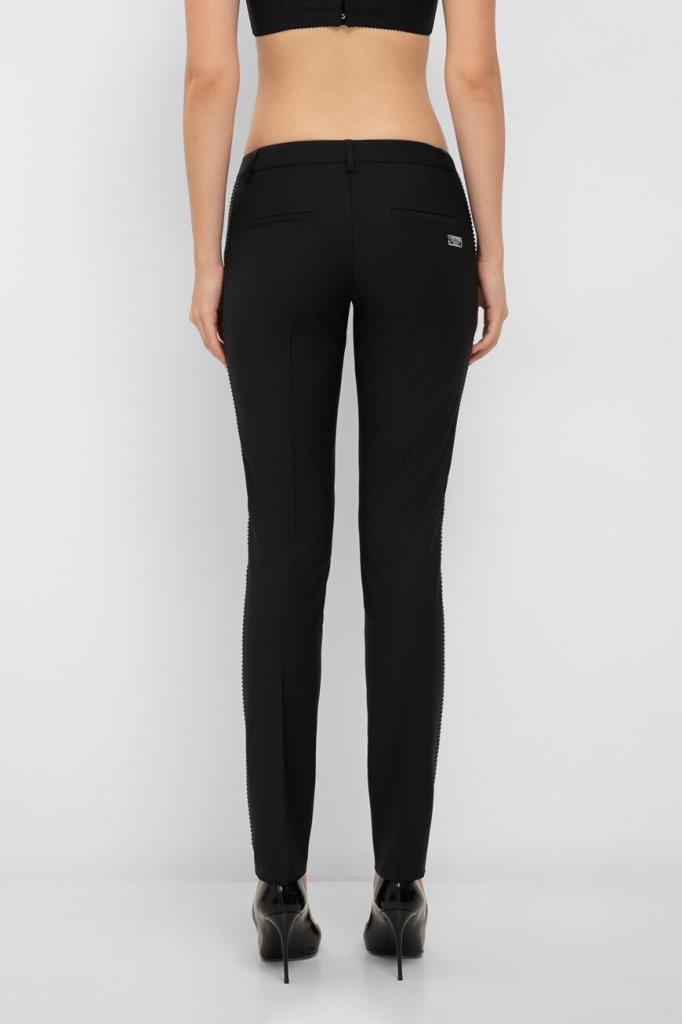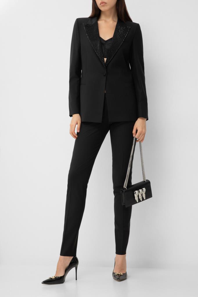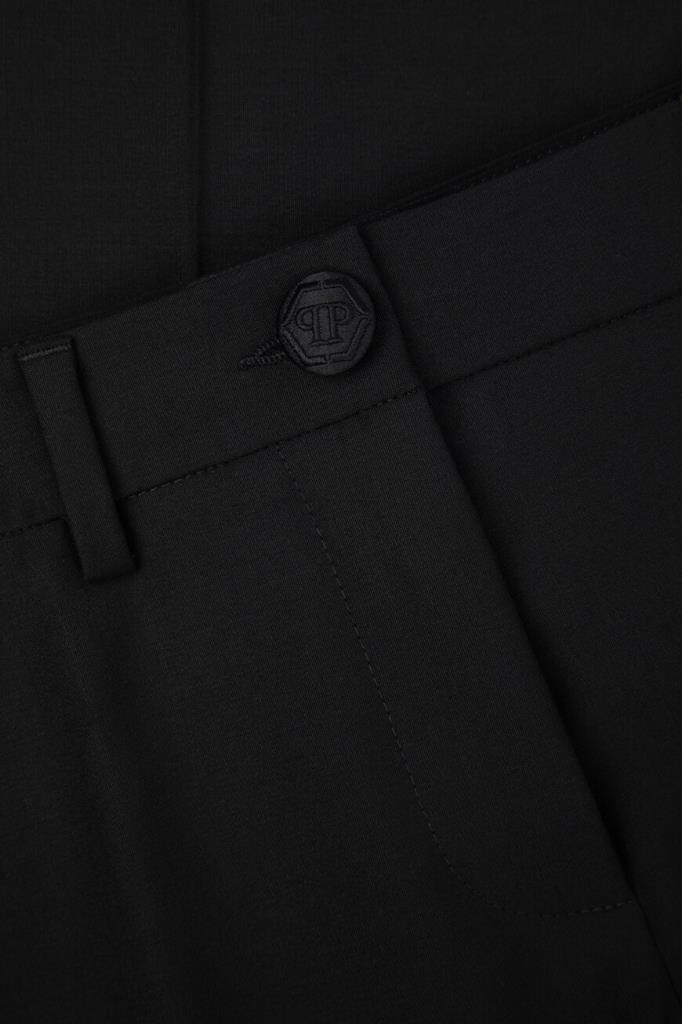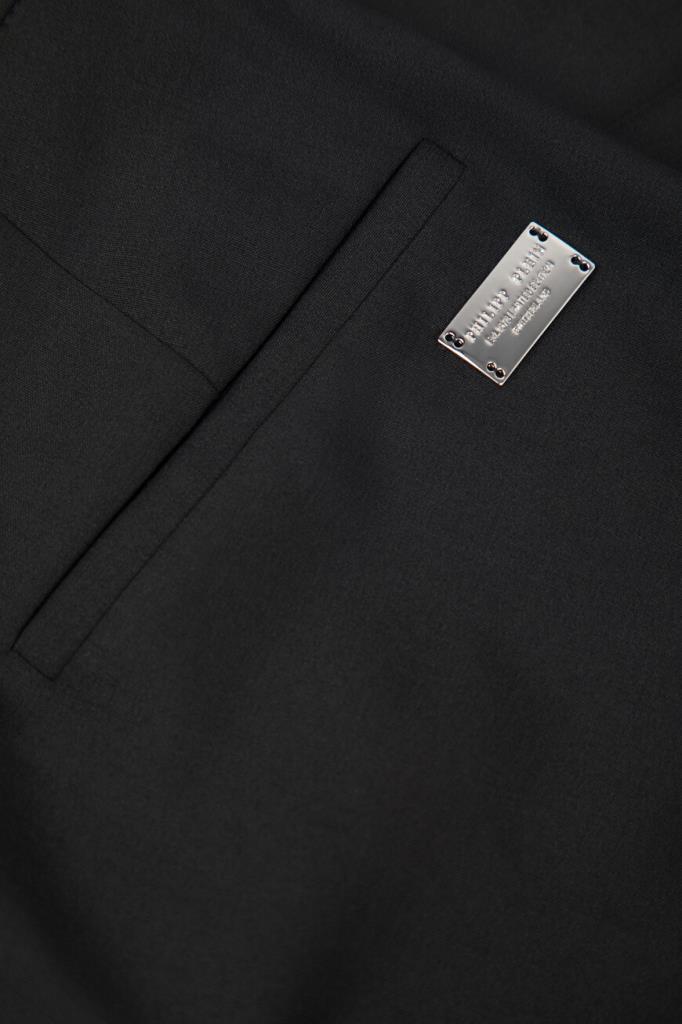 Лёгкие офисные брюки зауженного силуэта от бренда Philipp Plein. Модель выполнена из эластичного трикотажа на основе вирджинской шерсти и прочного полиэфира чёрного цвета. Декором выступают широкие полосы-лампасы из переливающихся на солнце страз в тон, а также металлический прямоугольный лейбл с гравировкой сзади. Для создания органичного комплекта сочетайте изделие с блейзером Skull с глубоким V-образным вырезом горловины из той же коллекции.