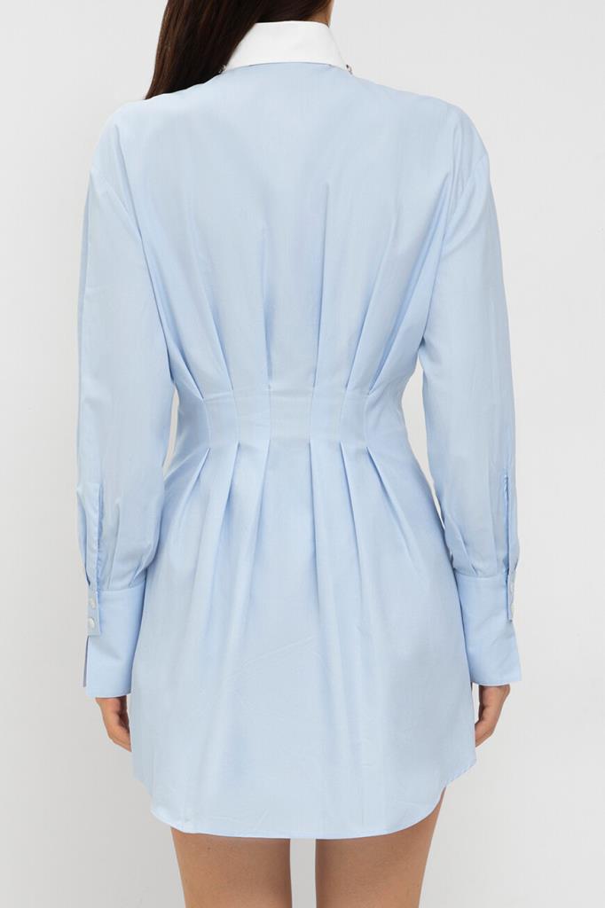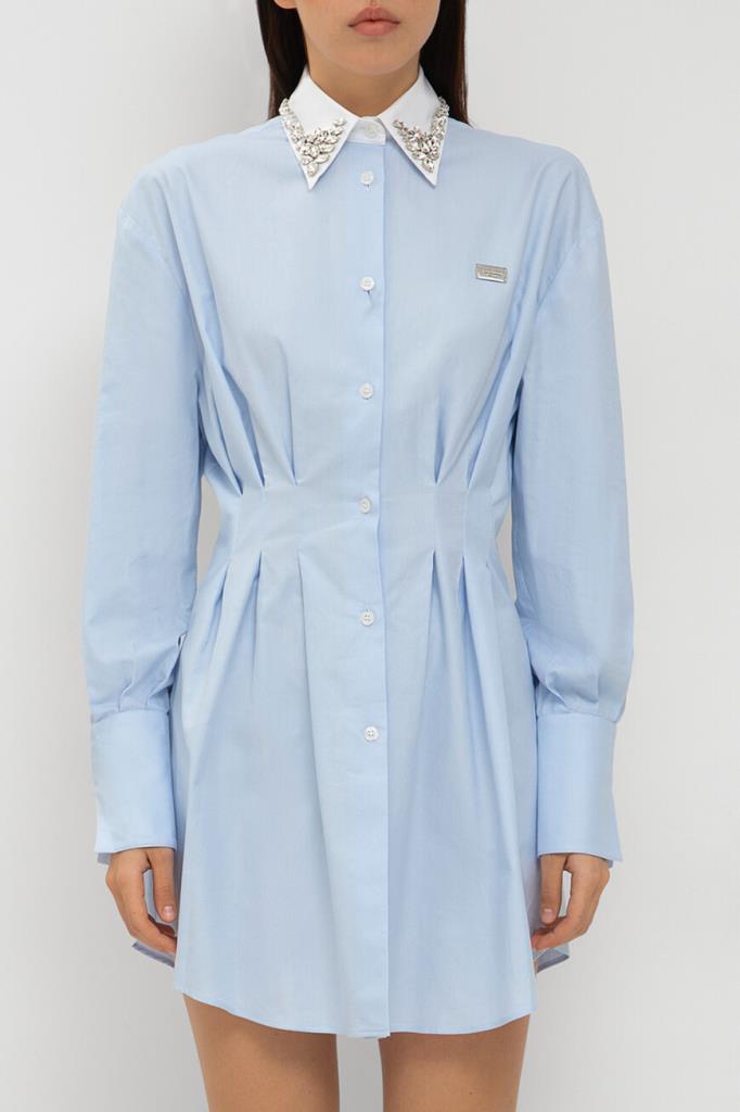Голубое платье-рубашка LS от бренда Philipp Plein. Изделие-мини сшито из мягкого хлопкового твила и дополнено складками на уровне талии, создающими прилегающий силуэт. Отличительными деталями стали белый отложной воротник с декором из крупных переливающихся на солнце страз-кристаллов и удлинённые манжеты рукавов с ассиметричной застёжкой на перламутровые пуговицы.