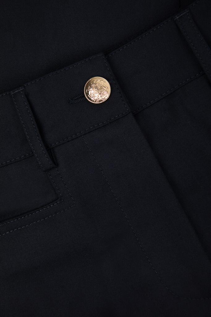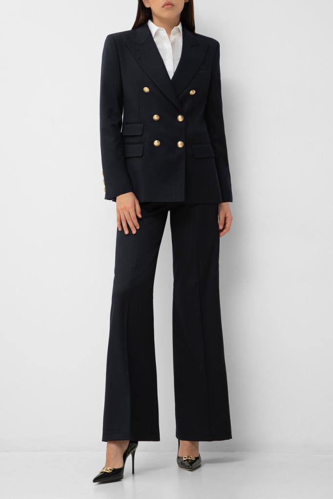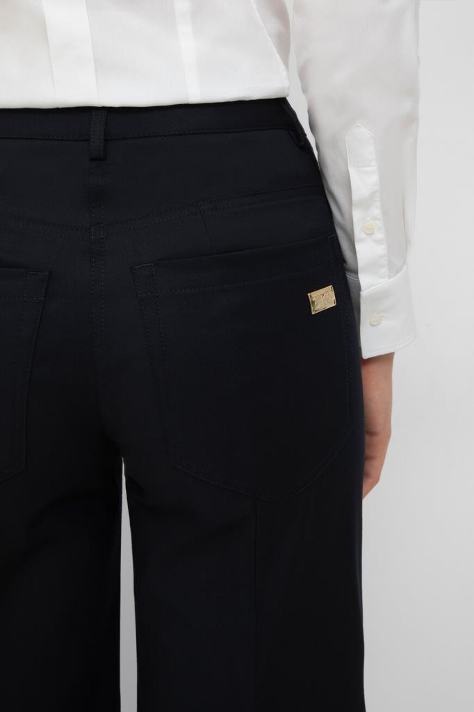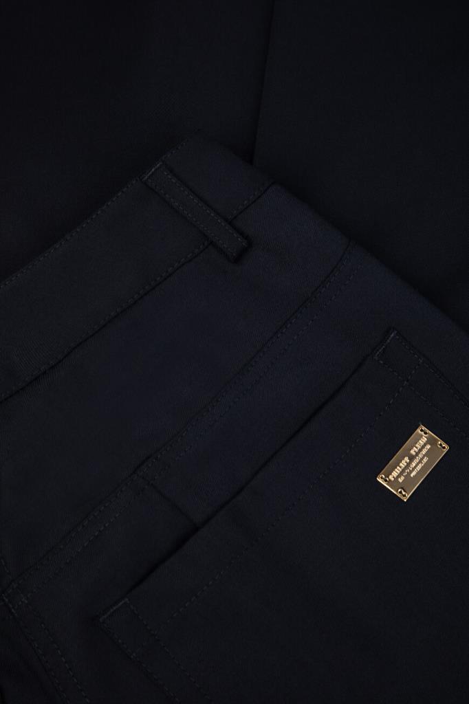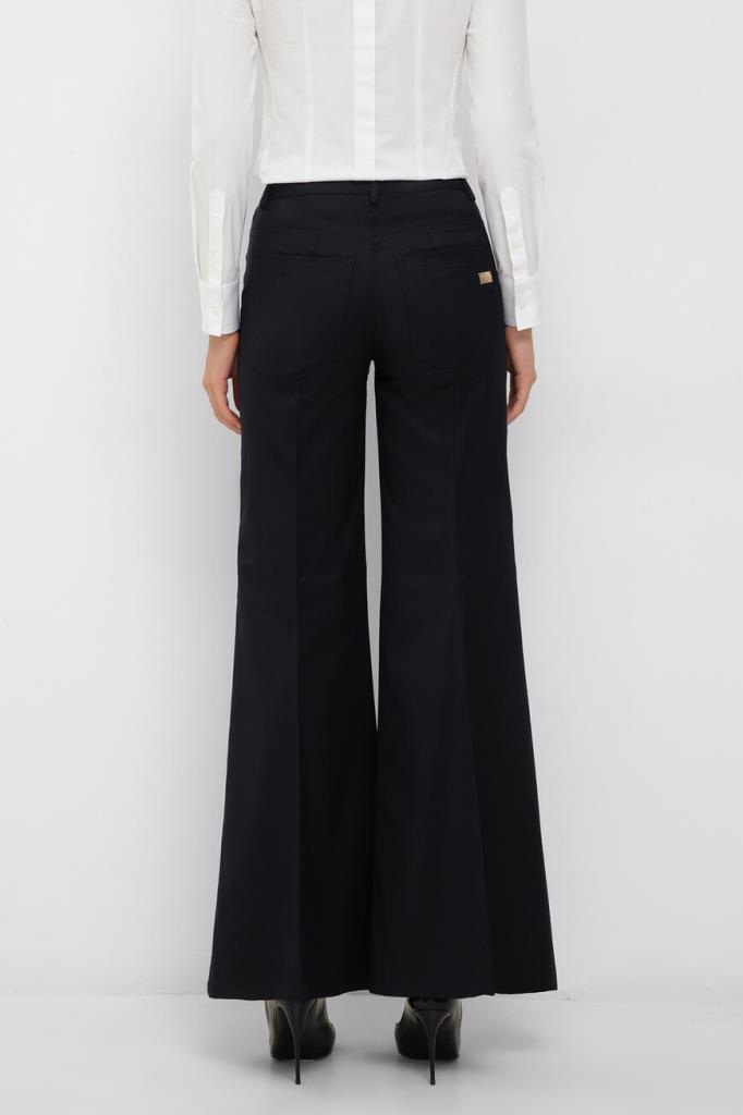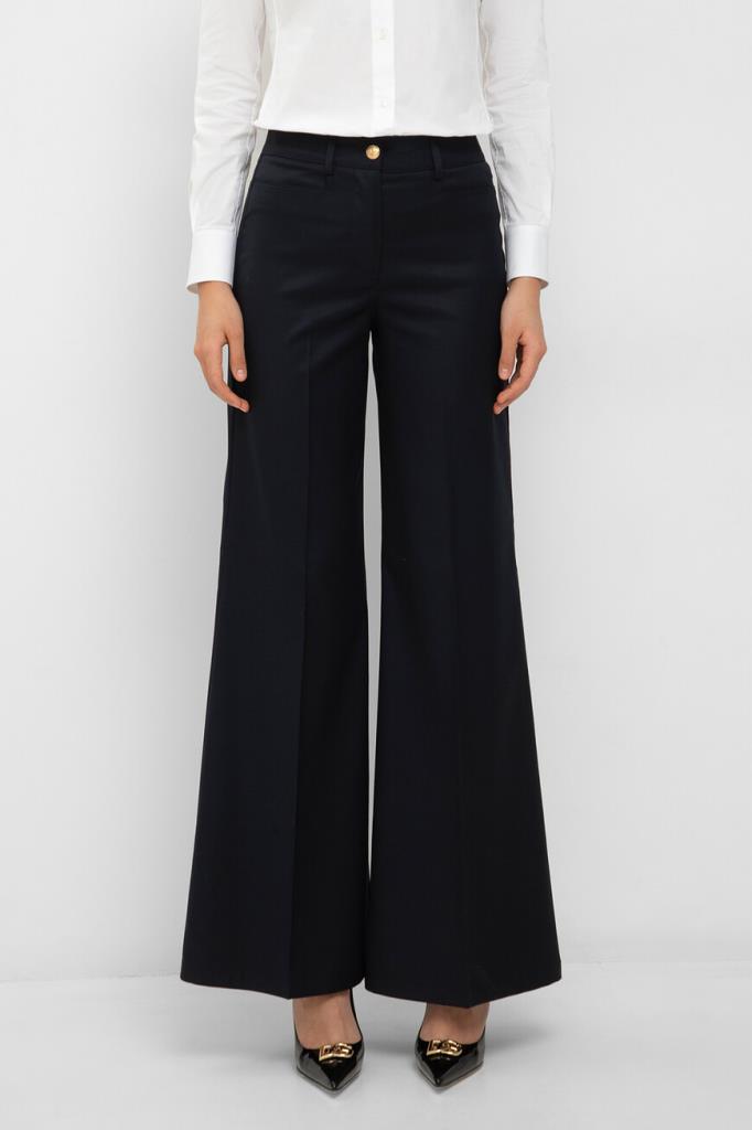 Брюки-палаццо Marine тёмно-синего цвета от бренда Philipp Plein. Модель изготовлена из габардина на основе мягкой шерсти и прочного полиэстера. Особенностями изделия являются заниженная линия талии и наличие классических стрелок. Брюки с четырьмя карманами можно сочетать с парным блейзером на крупных брендированных пуговицах золотого оттенка из той же коллекции.