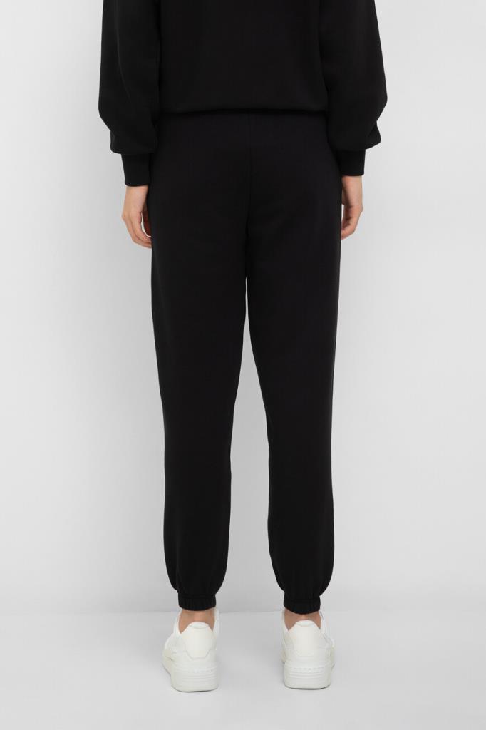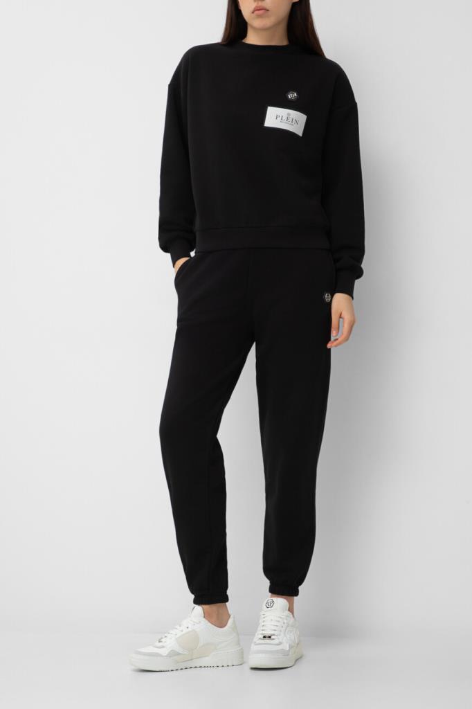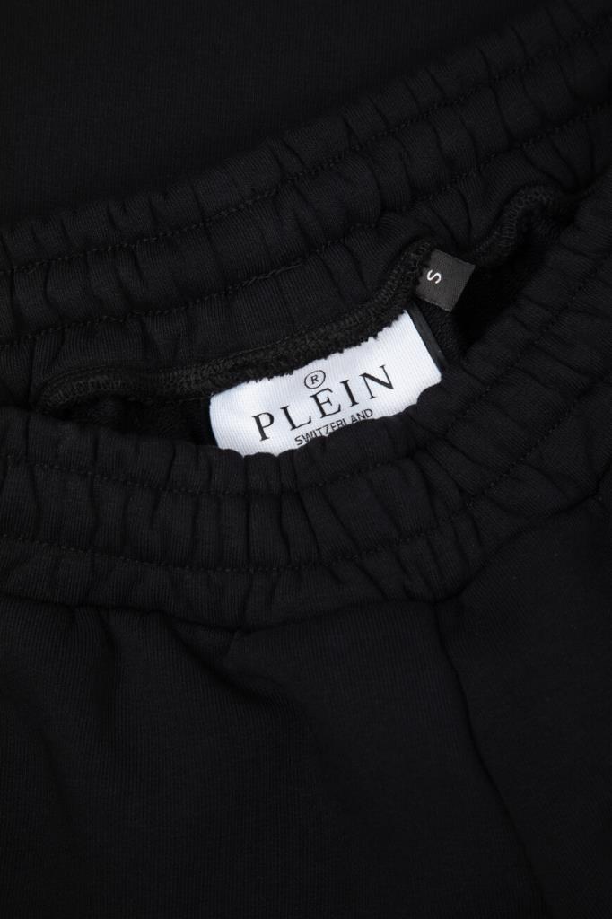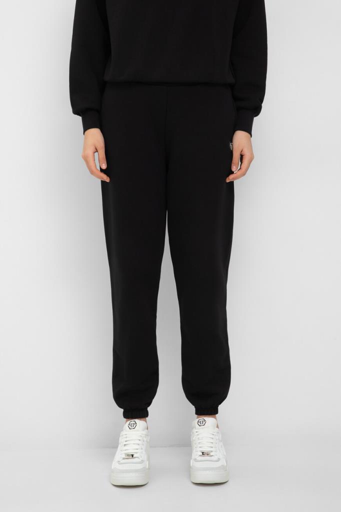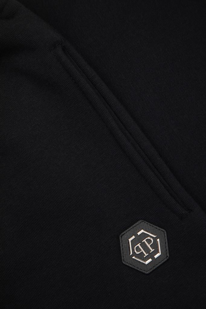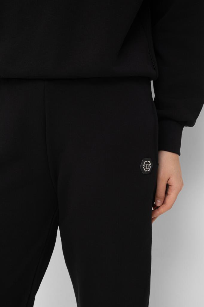 Джоггеры Pegasus с манжетами на резинке от бренда Philipp Plein. Для изготовления изделия выбрано мягкое джерси на основе хлопка и прочного полиэфира чёрного цвета. Линию талии подчёркивает широкий эластичный пояс, оформленный резинкой, а спереди слева расположена нашивка-шестигранник из сафьяновой кожи PP Hexagon.