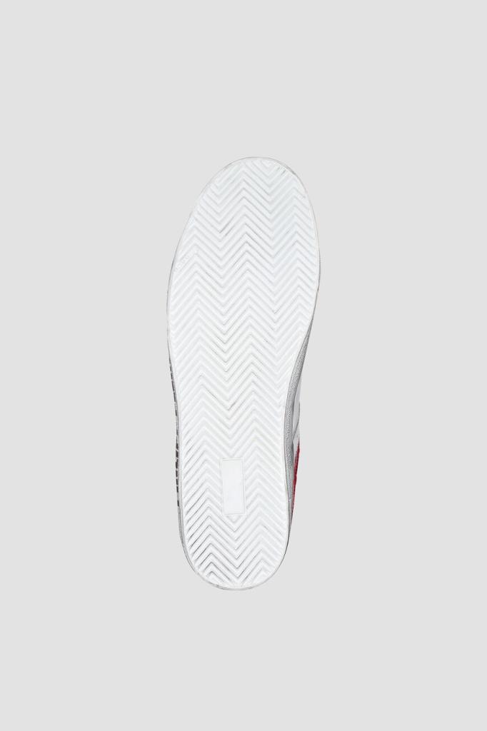 Двухцветные сникеры LO-TOP Retrokickz ™ от бренда Philipp Plein. Для изготовления удобной пары выбрана мягкая кожа наппа белого цвета с эффектом состаривания, ламинированными вставками ярко-красного оттенка на язычке, боковинах и заднике и вставками с тиснением под кожу крокодила спереди, по бокам и также сзади. Отличительными деталями являются перфорация на носке и боковинах и наличие знаковой символики: белых черепа и надписи «Plein» на язычке, надписи «Plein Megastar» сзади и крупного красного черепа сбоку.