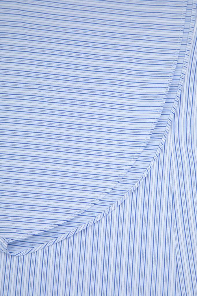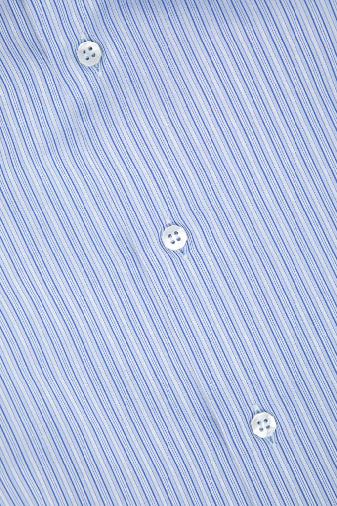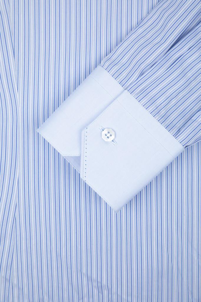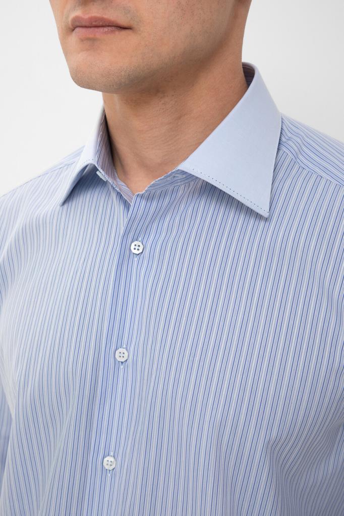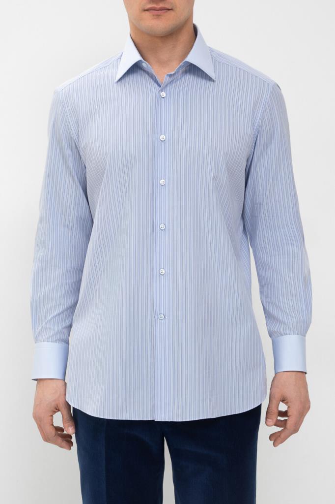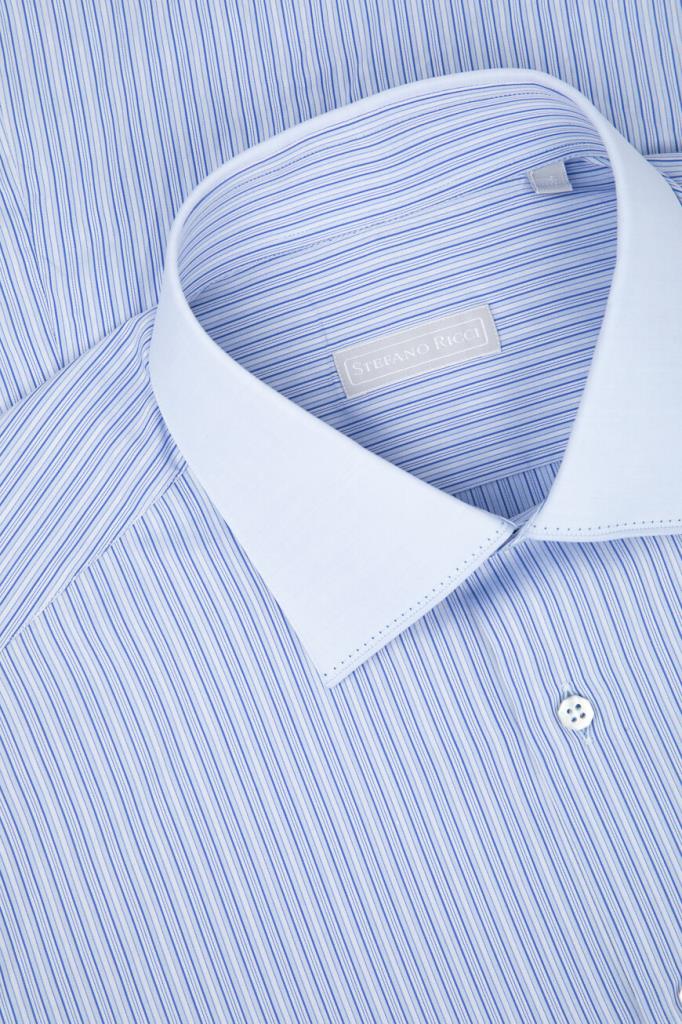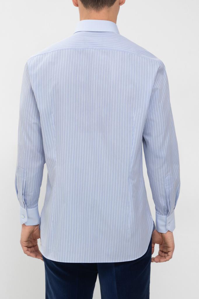 Хлопковая рубашка Stefano Ricci с отложным воротником Asti. Изделие классического кроя выполнено в светло-голубом оттенке и украшено геометрическим мотивом в виде синих вертикальных полос. Декором также выступают прошитые строчки-окантовка на однотонных отложном воротнике и скошенных манжетах рукавов.