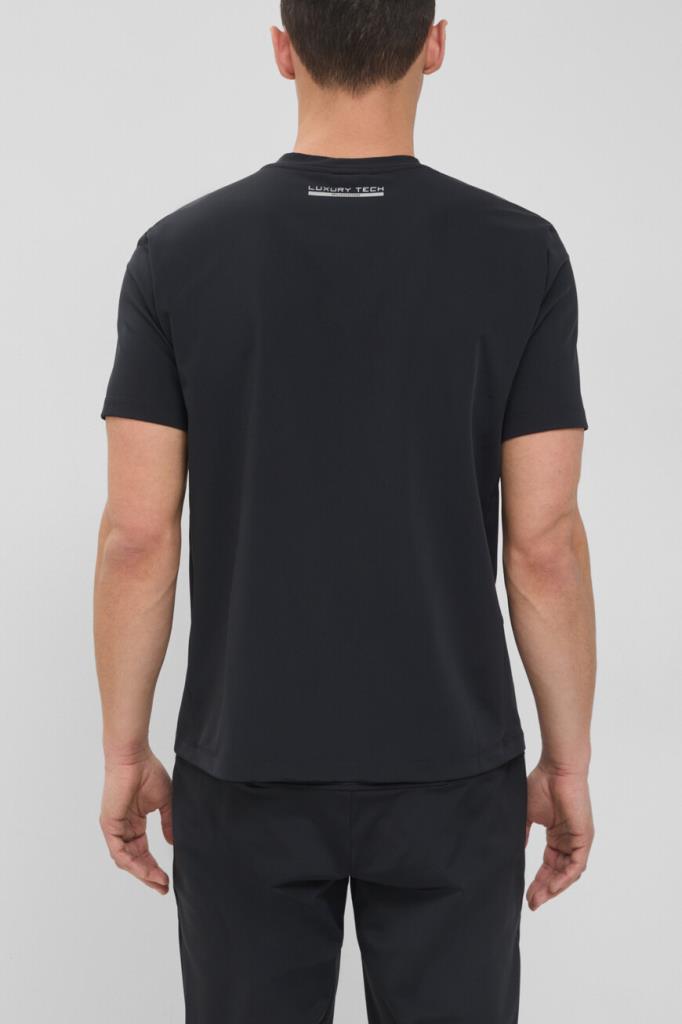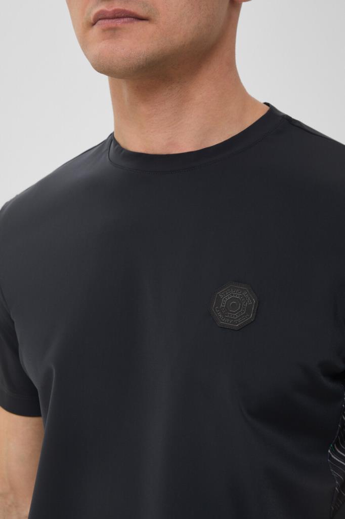 Футболка Stefano Ricci из прочного эластичного нейлона хорошо отводит влагу. Модель чёрного базового цвета, созданная специально для занятий бегом, оснащена дышащими вставками с перфорацией и принтом в полоску по бокам и украшена кожаной накладкой со знаковой символикой Дома - серебристыми логотипом, восьмигранниками и надписью-названием коллекции SR LUXURY TECH. Изделие прямого силуэта станет фаворитом любой коллекции спортивной одежды.