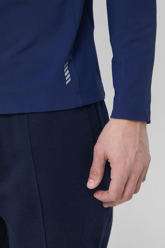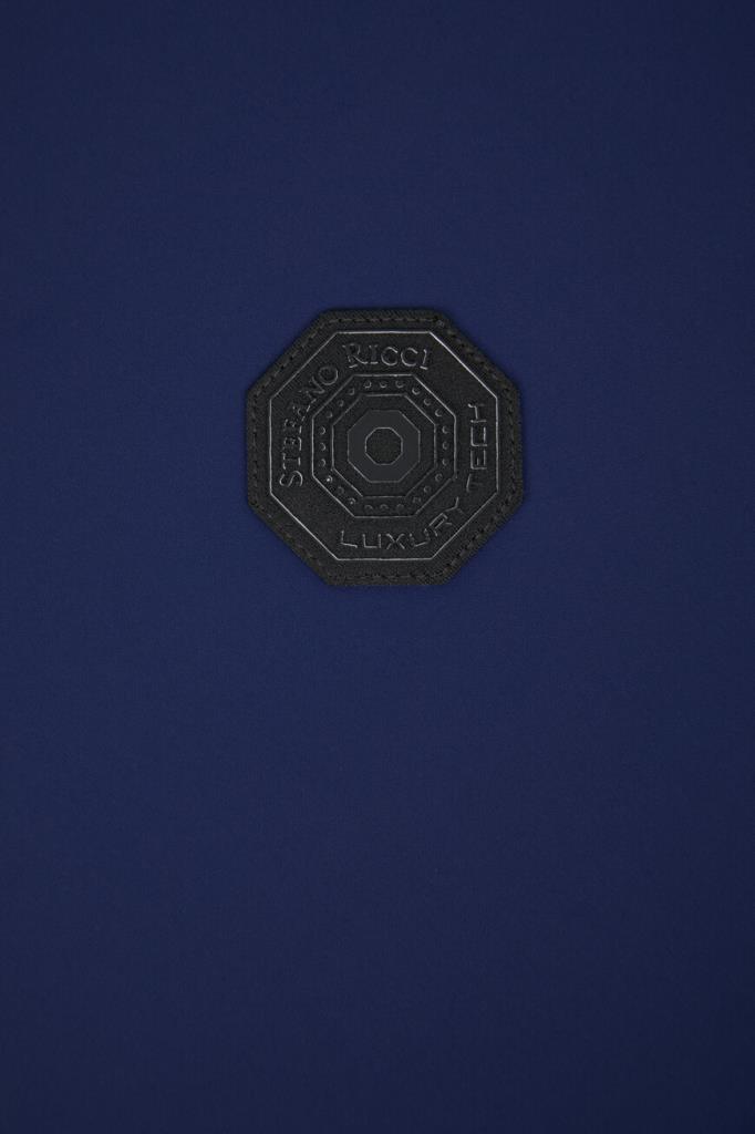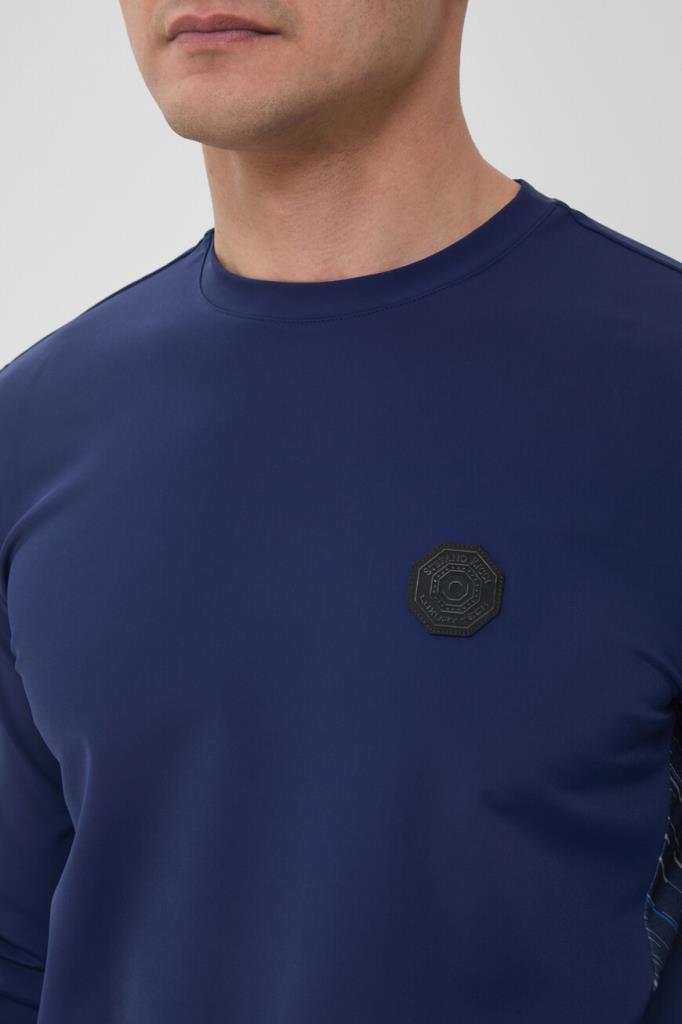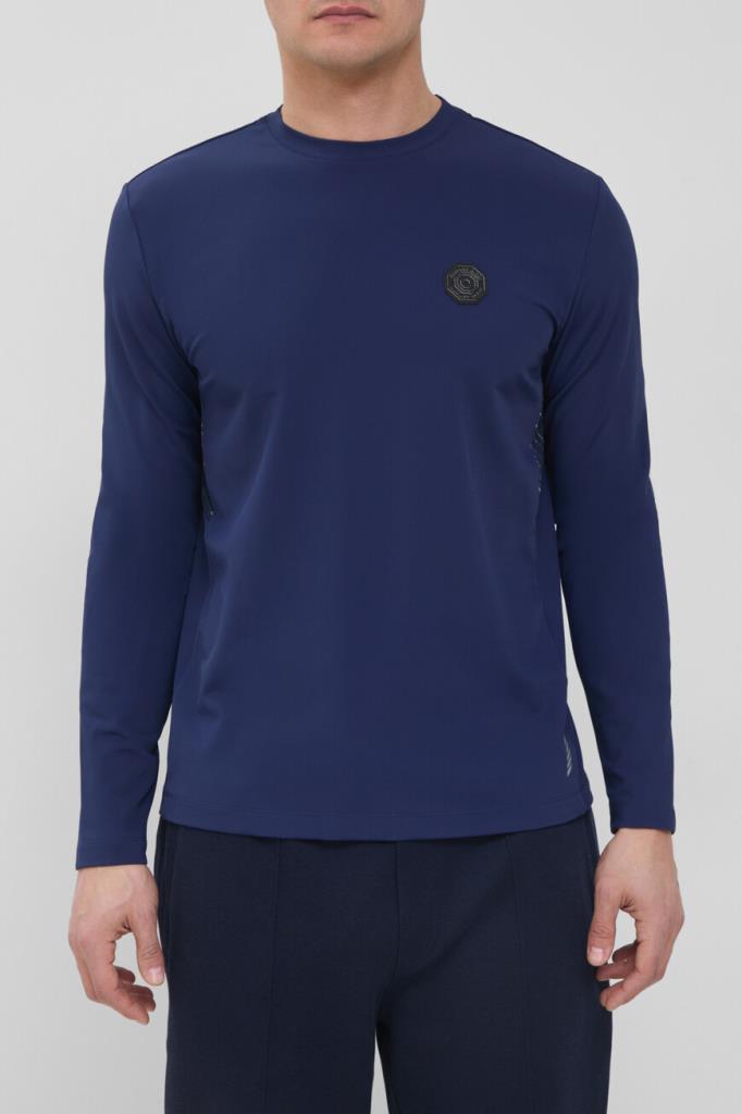 Лонгслив Stefano Ricci с боковыми вставками с перфорацией и принтом в полоску. Изделие выполнено из эксклюзивной технической ткани на основе прочного нейлона синего цвета с добавлением эластичных волокон. Декором выступают чёрная кожаная накладка со знаковой символикой Дома - серебристыми логотипом, восьмигранниками и надписью-названием коллекции SR LUXURY TECH слева на груди и белая надпись «LUXURY TECH RUNNING» на спинке. Модель с длинными рукавами составит органичный комплект с другими предметами спортивного гардероба мужчины.