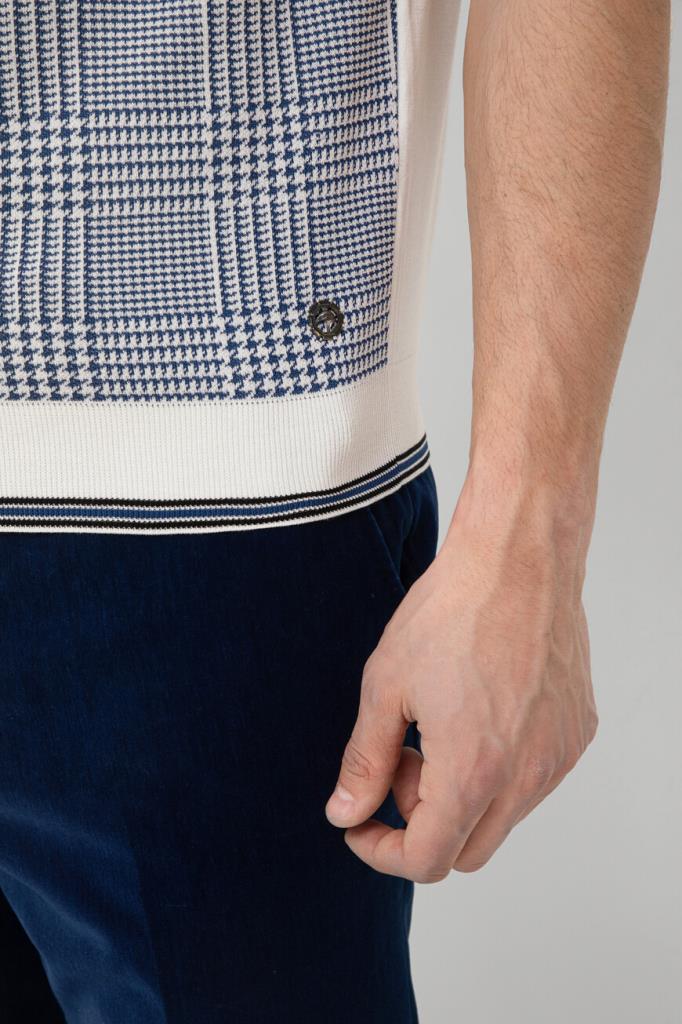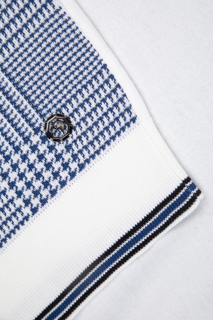 Поло Stefano Ricci выполнено в базовом белом и синем тонах. Для изготовления модели прямого силуэта используется мягкий трикотаж на основе хлопка и гладкого шёлка. Декором выступают геометрический мотив в крупную клетку «Принц Уэльский» и серебристая металлическая деталь-восьмигранник со вписанной в неё головой орла спереди снизу.