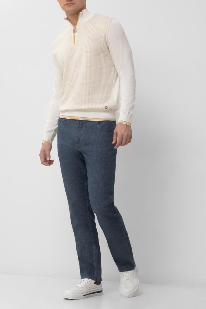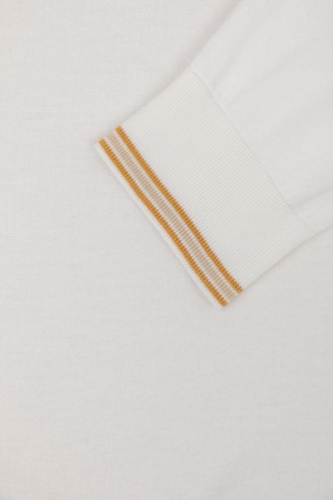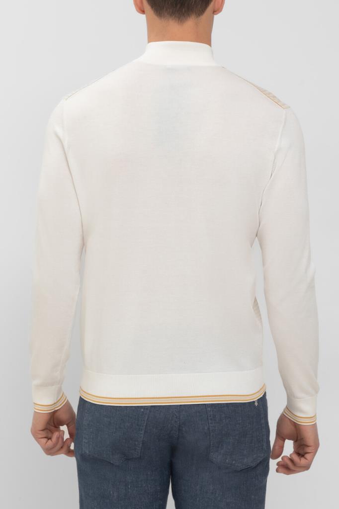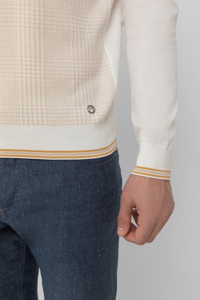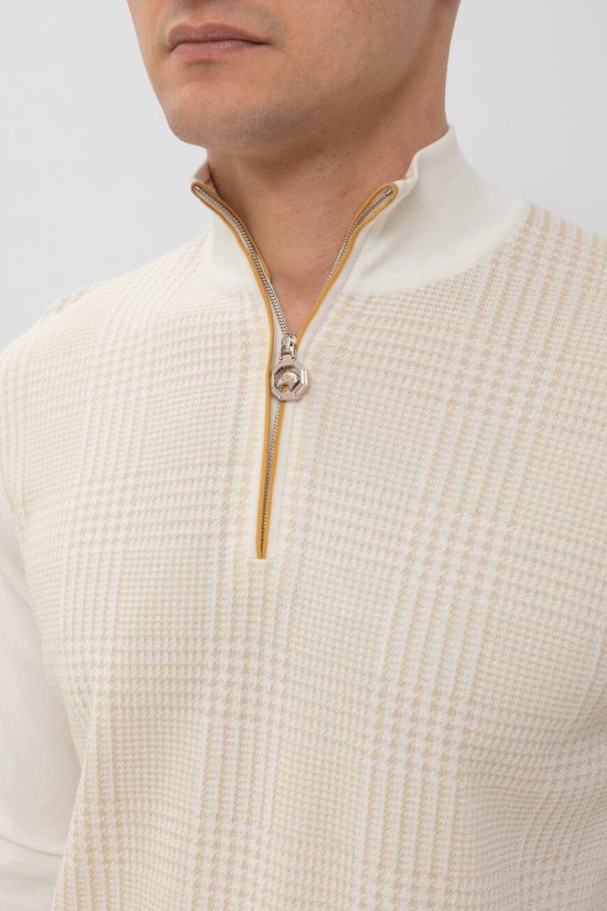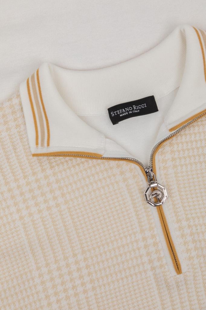 Свитер Stefano Ricci с геометрическим мотивом в крупную клетку Принц Уэльский. Изделие прямого силуэта выполнено из мягкого трикотажа на основе хлопка и гладкого шёлка белого цвета. Декором выступают полосы-кант на внутренней стороне высокого воротника-стойки, манжетах рукавов и широком поясе. Модель застёгивается на короткую молнию с брендированным металлическим пуллером сверху и отличается наличием знаковой символики Дома - детали-восьмигранника с головой орла в центре.