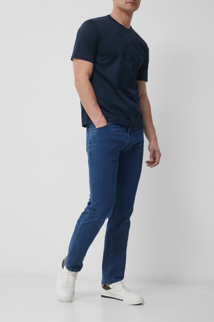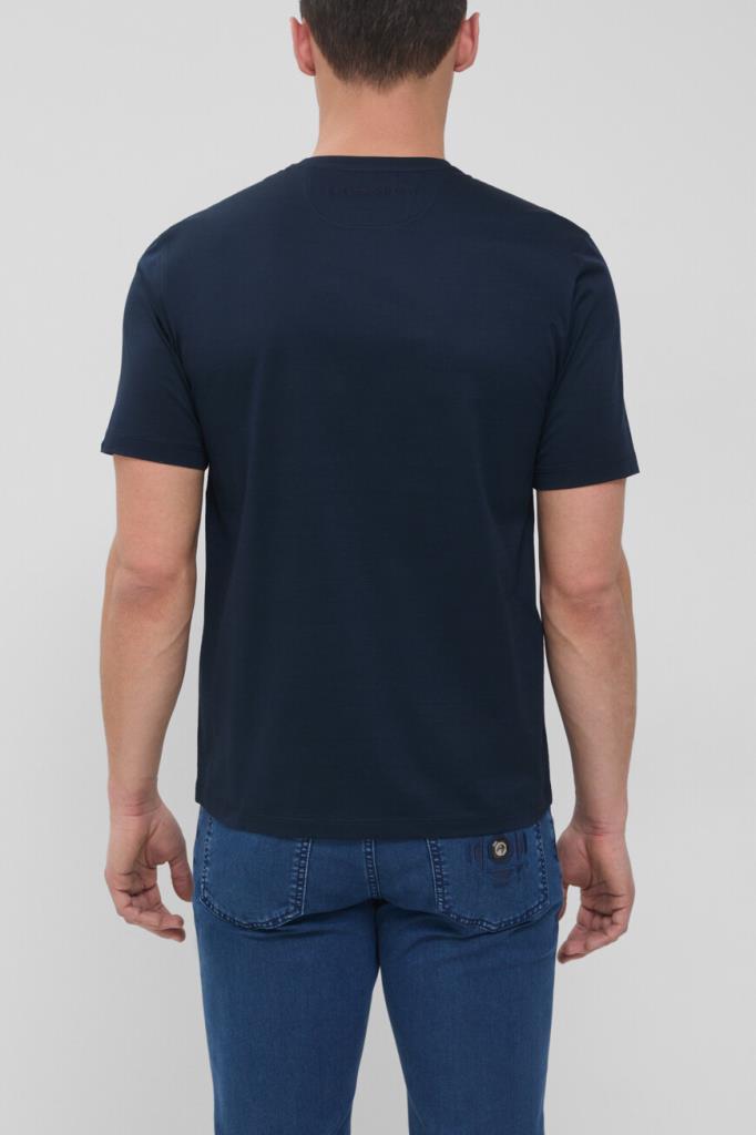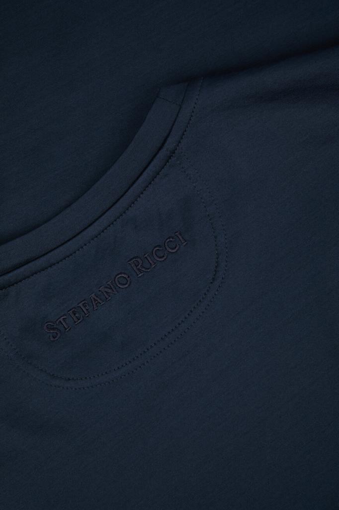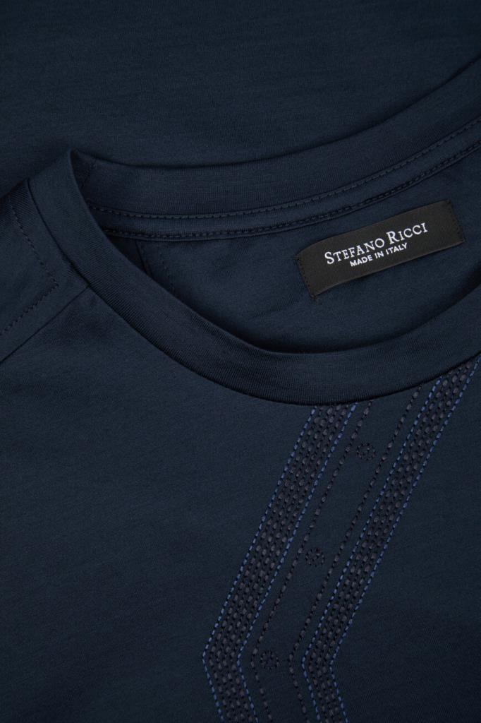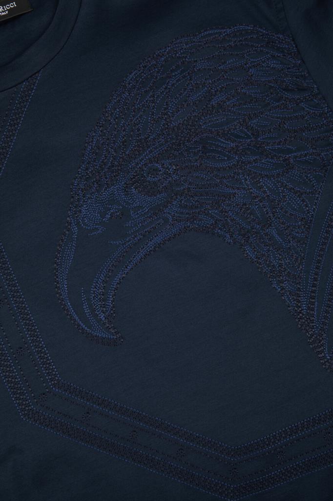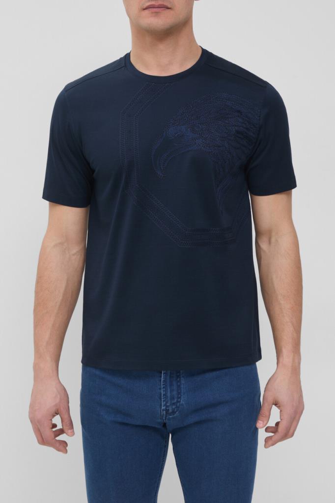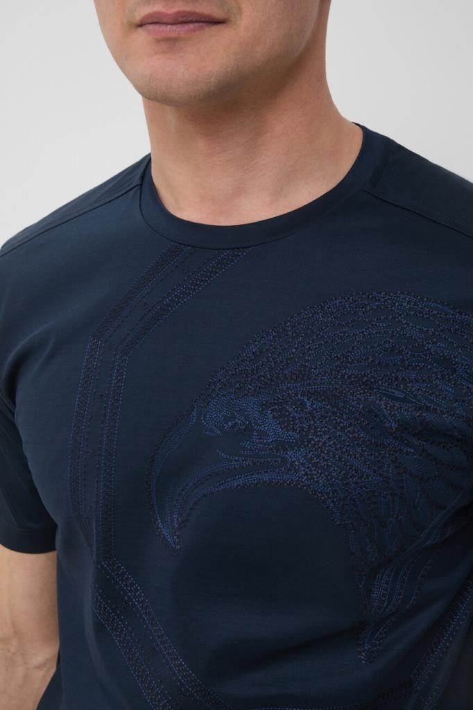 Хлопковая футболка Stefano Ricci выполнена со вниманием к деталям. Изделие прямого силуэта украшают крупная двухцветная вышивка в виде головы орла в культовом восьмиграннике спереди и вышитая надпись-логотип на кокетке. Модель тёмно-синего цвета, изготовленная из мягкого джерси премиального качества, удачно дополнит образ в любой цветовой палитре.
