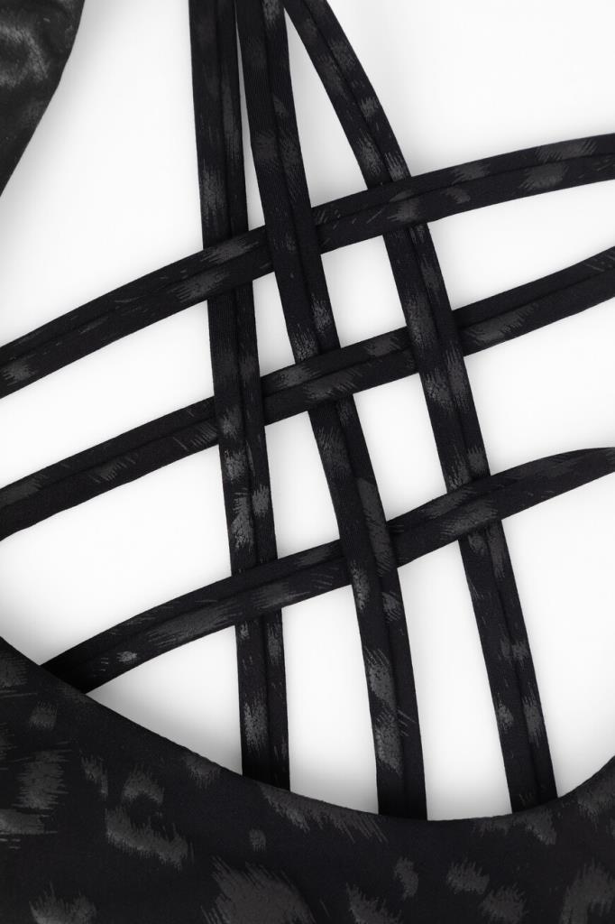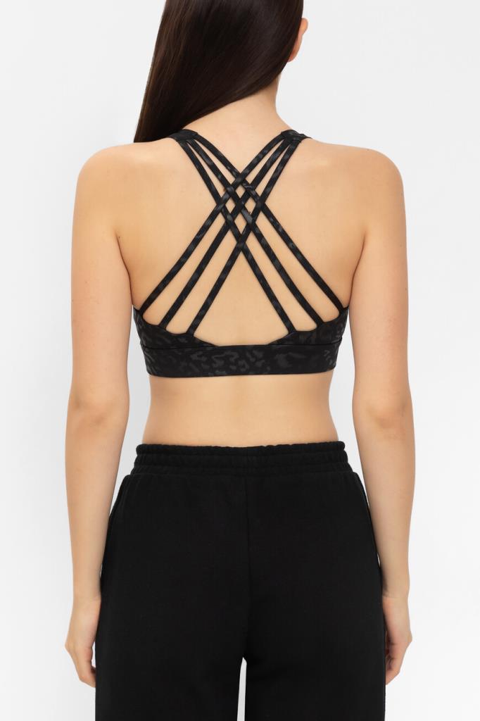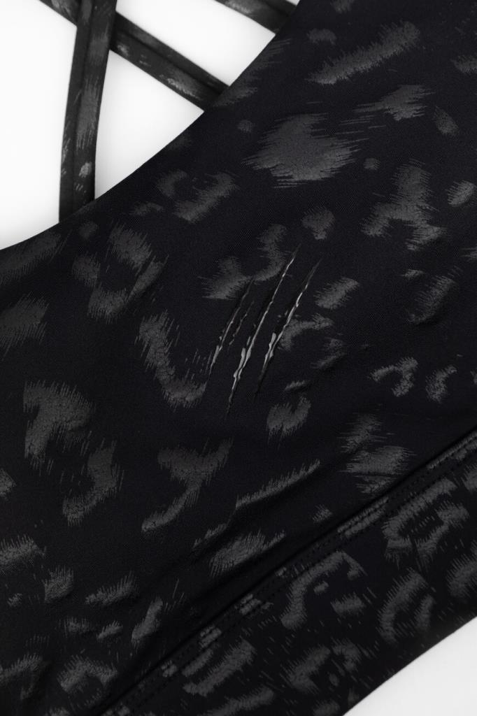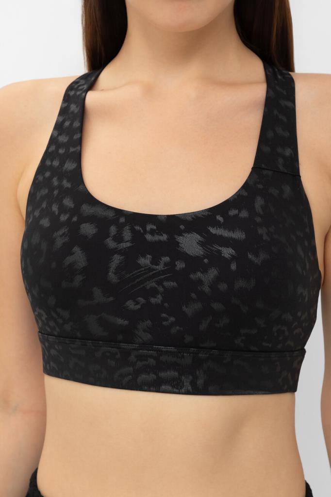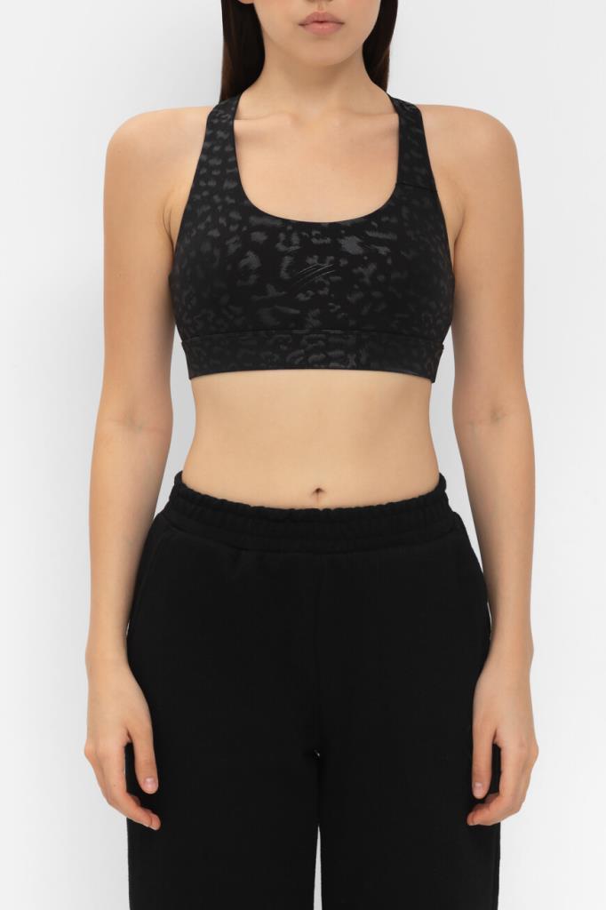 Леопардовый топ-бра в чёрном и сером оттенках от PLEIN Sport. Фасон спортивной модели, сшитой из прочного эластичного нейлона, предполагает наличие глубокого U-образного выреза горловины и тройных перекрещивающихся бретелей сзади. Дизайн лёгкого и удобного изделия завершает знаковая символика Дома - принт Tiger Scratch спереди.