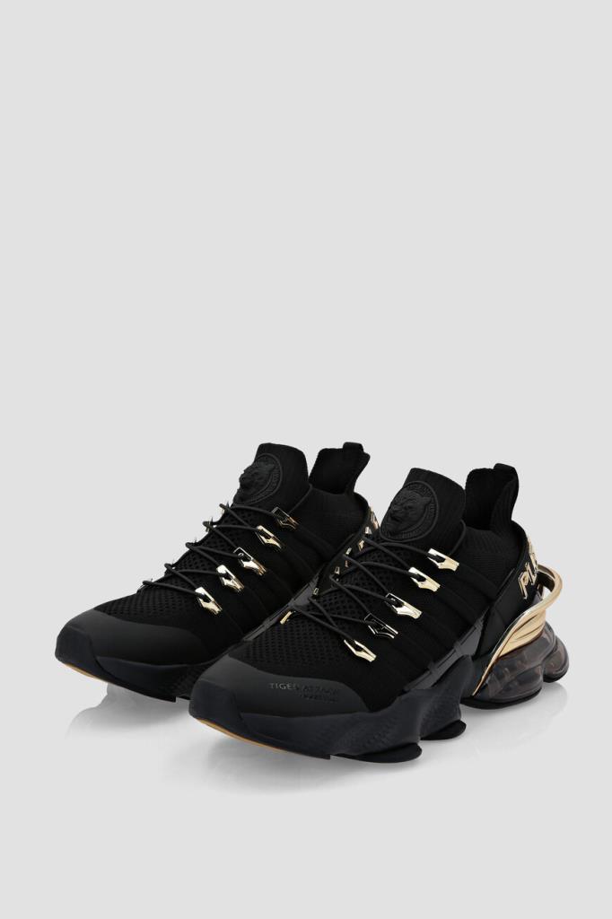 Беговые кроссовки Tiger Attack Gen. X.04 чёрного цвета от PLEIN Sport. Для создания модели с перекрёстной дизайнерской шнуровкой используется высокотехнологичный дышащий материал - сетка из полиэфира с разными текстурами. Принадлежность удобной пары Дому подчёркивается патчем с рельефными надписями-лого и головой льва в круге на язычке, а также кожаной вставкой с крупным рельефным логотипом из металла золотого оттенка на заднике. Задняя часть изделия укреплена фигурным стабилизатором пятки с гальваническим покрытием.