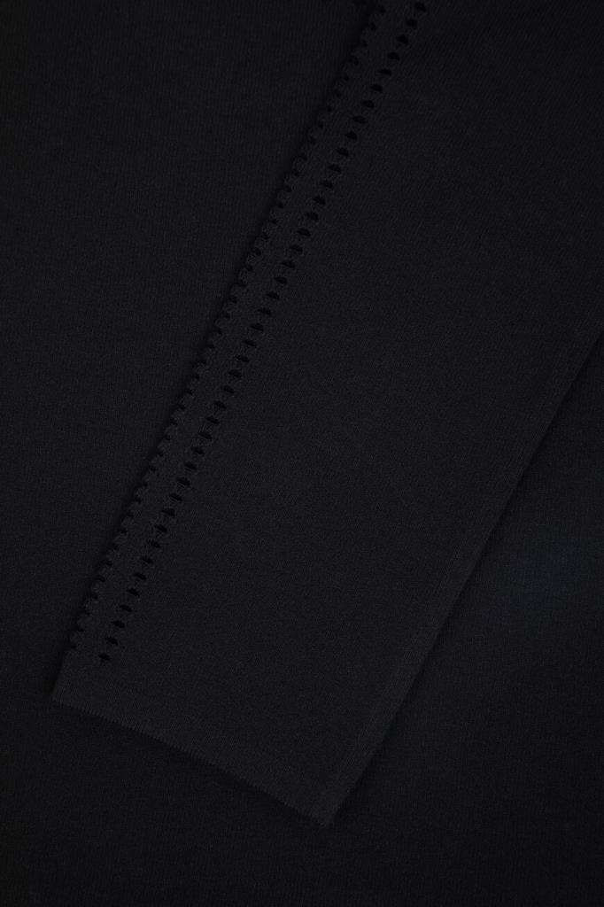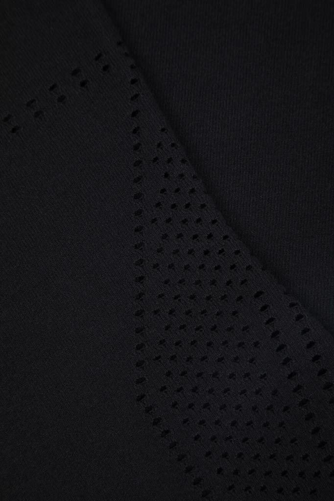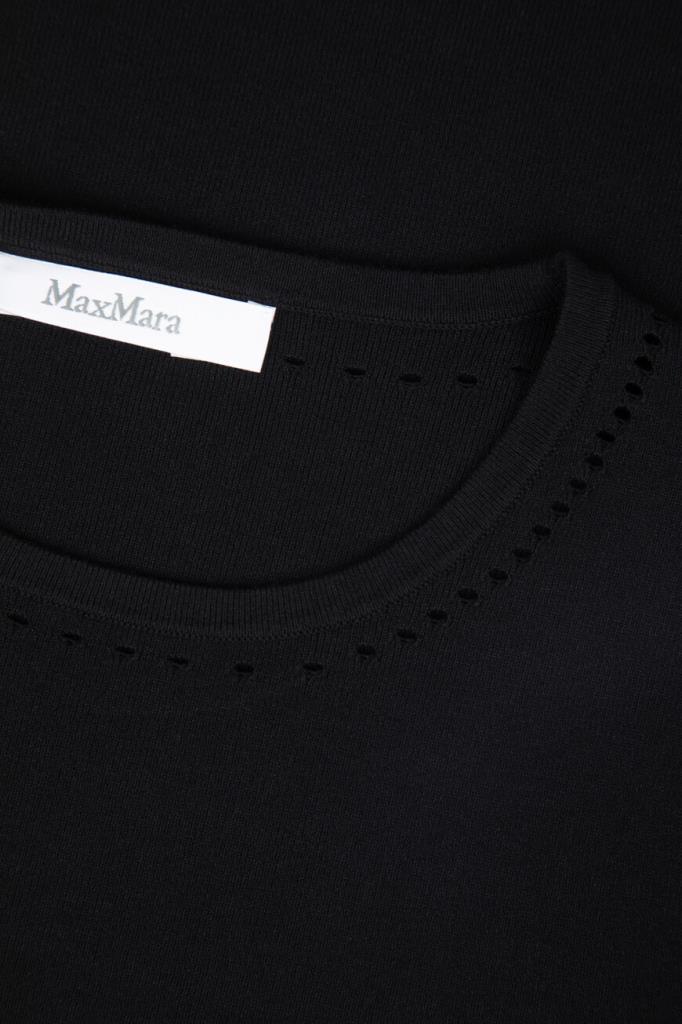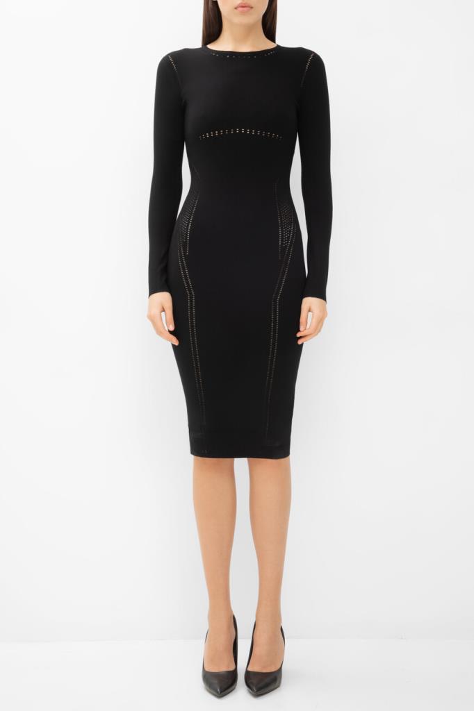 Облегающее платье-миди чёрного цвета от Max Mara. Модель изготовлена из мягкого крепа на основе прочного полиэфира и вискозного волокна. Поверхность изделия с длинными рукавами покрыта дизайнерским узором с микроперфорацией. Платье с круглым вырезом горловины станет основой элегантного наряда для любого случая.
