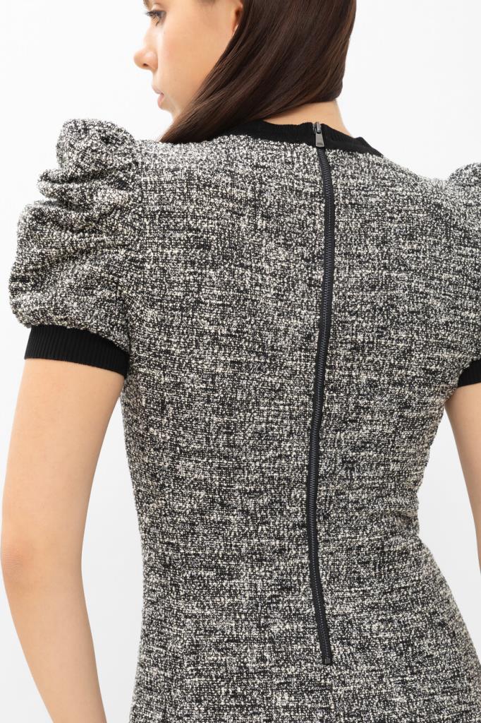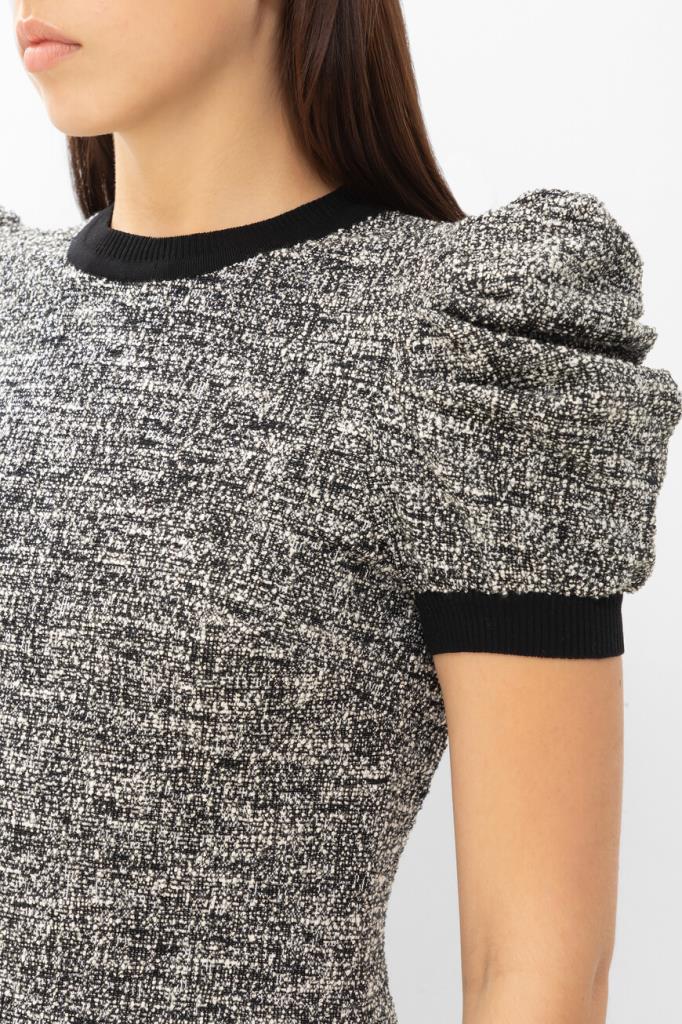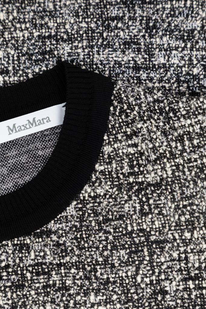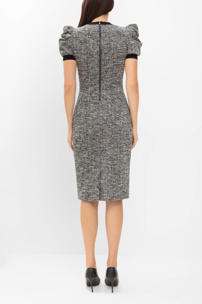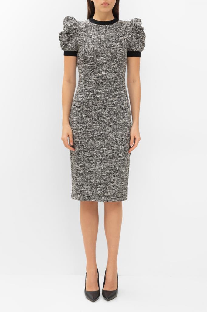 Чёрно-белое платье-футляр от Max Mara. Для изготовления модели-миди используется мягкий трикотаж на основе хлопка стрейч, полиэфира и прочного нейлона. Конструкция изделия предполагает прилегающий силуэт и наличие коротких рукавов-фонариков с драпировкой, придающих объём. Платье застёгивается на глубокую молнию сзади и отличается однотонными чёрными круглым вырезом горловины и манжетами рукавов, а также центральной шлицей сзади. Дополните образ функциональной сумкой с тиснением под крокодила из той же коллекции.