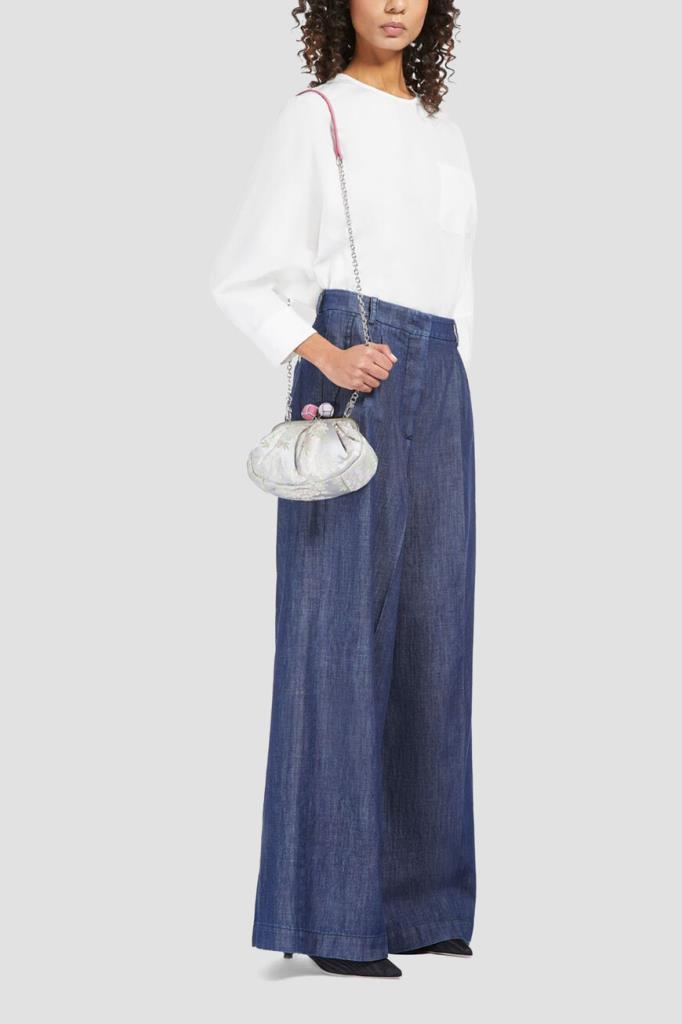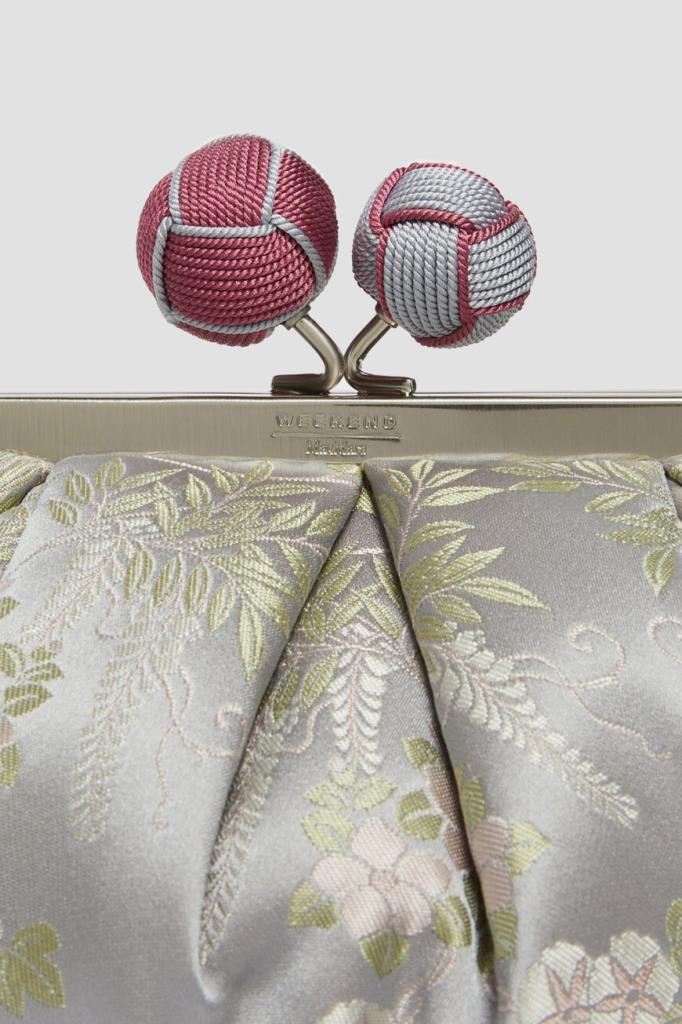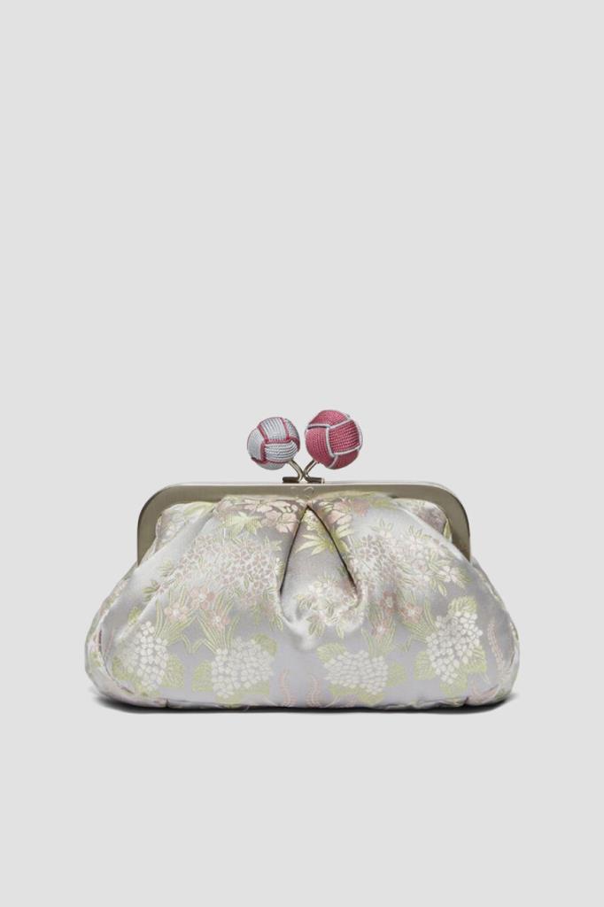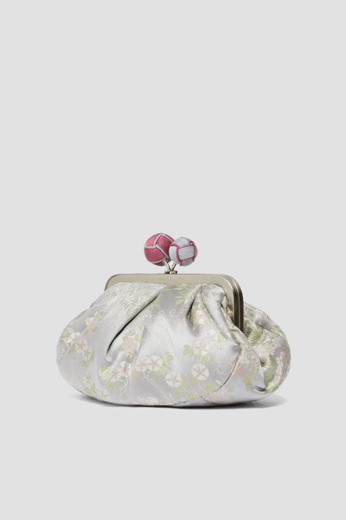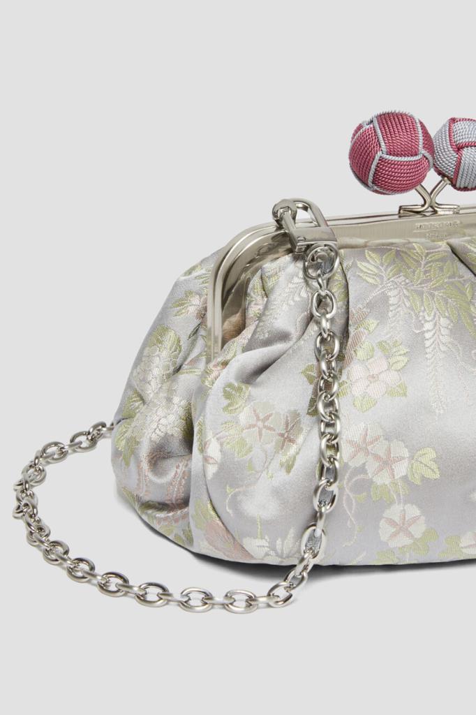 Жаккардовая сумка-мешок Pasticcino от MaxMara. Модель из ограниченного выпуска, изготовленная из чистого шелкового атласа светло-серого цвета, украшена цветочным узором в японском стиле. Крупная культовая застёжка покрыта вручную обтянутой верёвкой двух оттенков, а металлическая рама декорирована выгравированными логотипом и надписью-названием линейки одежды и аксессуаров.