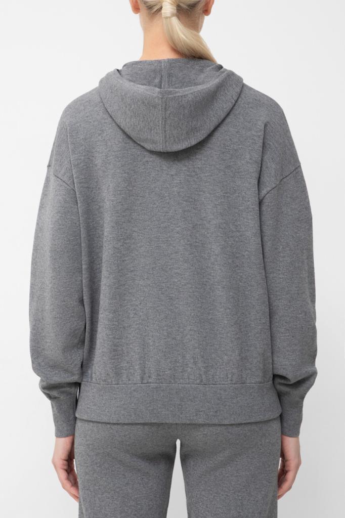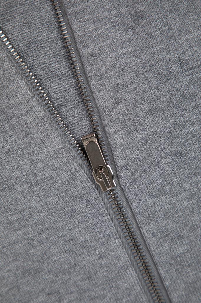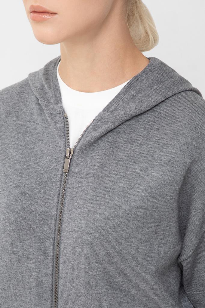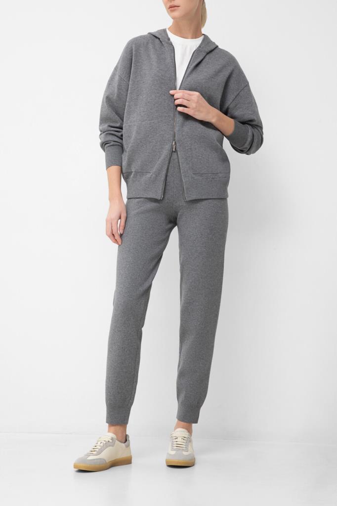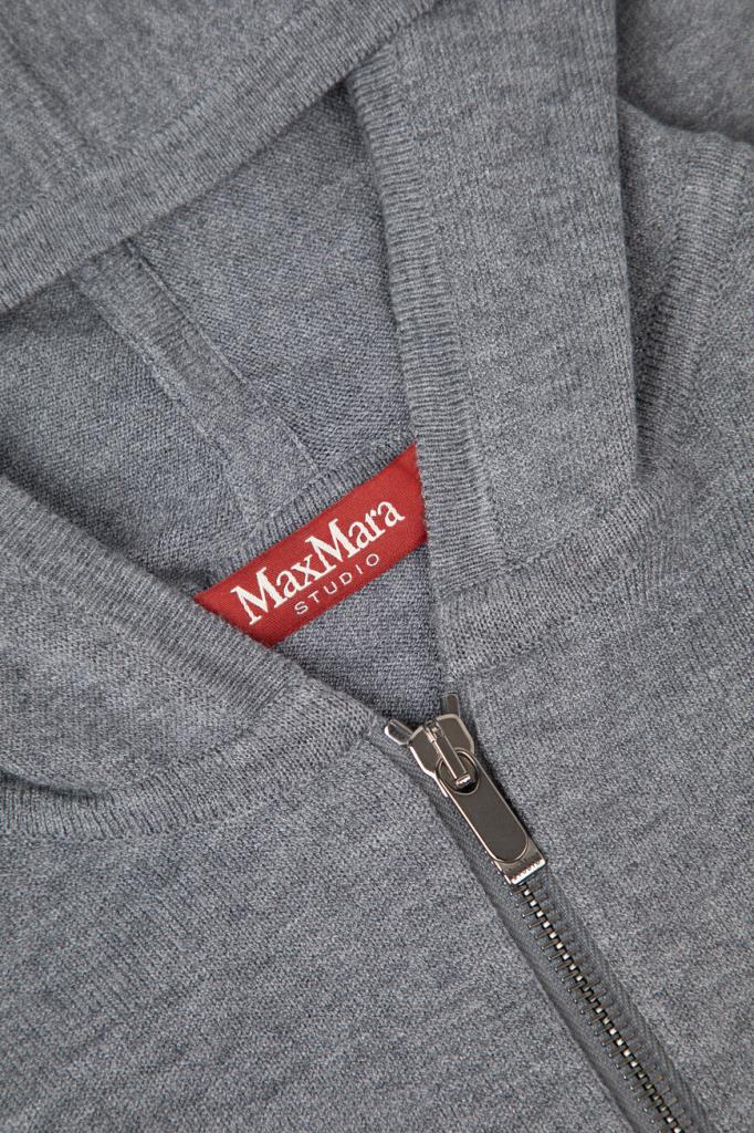 Трикотажный кардиган Max Mara на серебристой молнии с двумя бегунками. Для создания повседневной модели используются мягкая шерсть, нейлон и прочное вискозное волокно серого цвета. Отличительными особенностями изделия стали глубокий капюшон и крупные накладные карманы, расположенные по бокам. Образ можно дополнить джоггерами на резинке из той же коллекции.