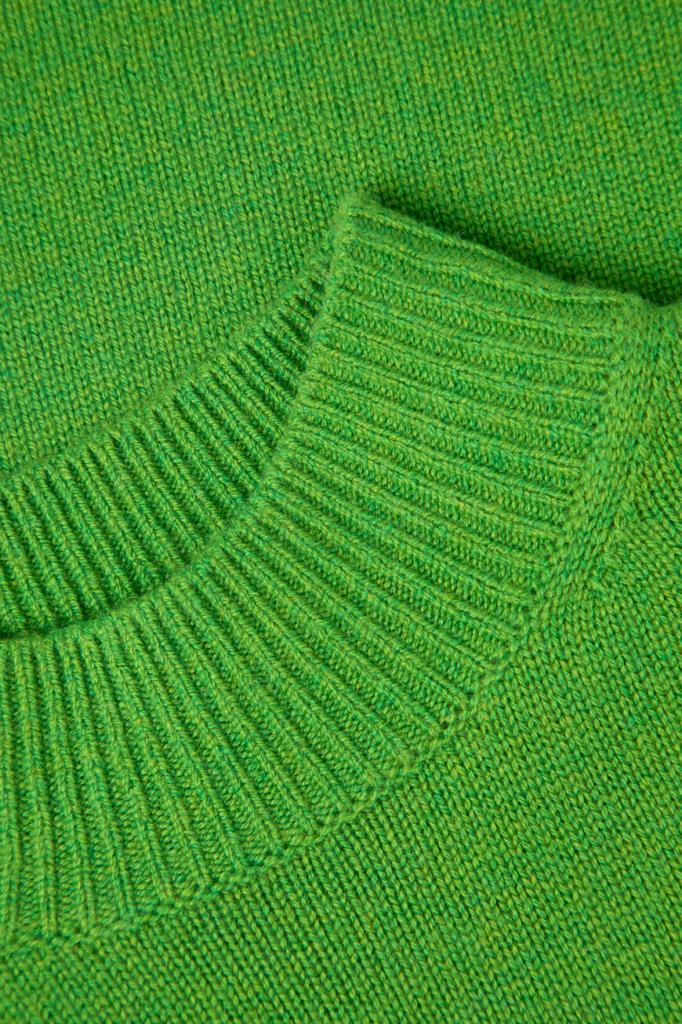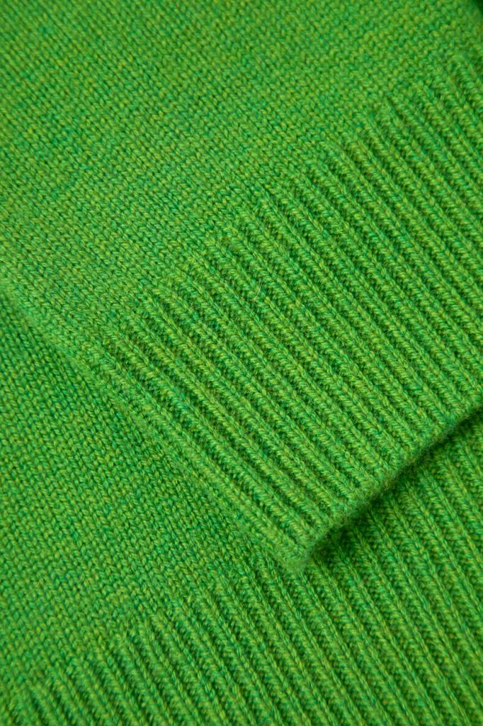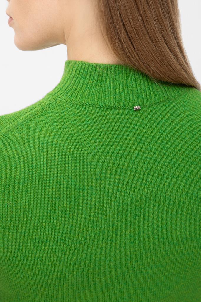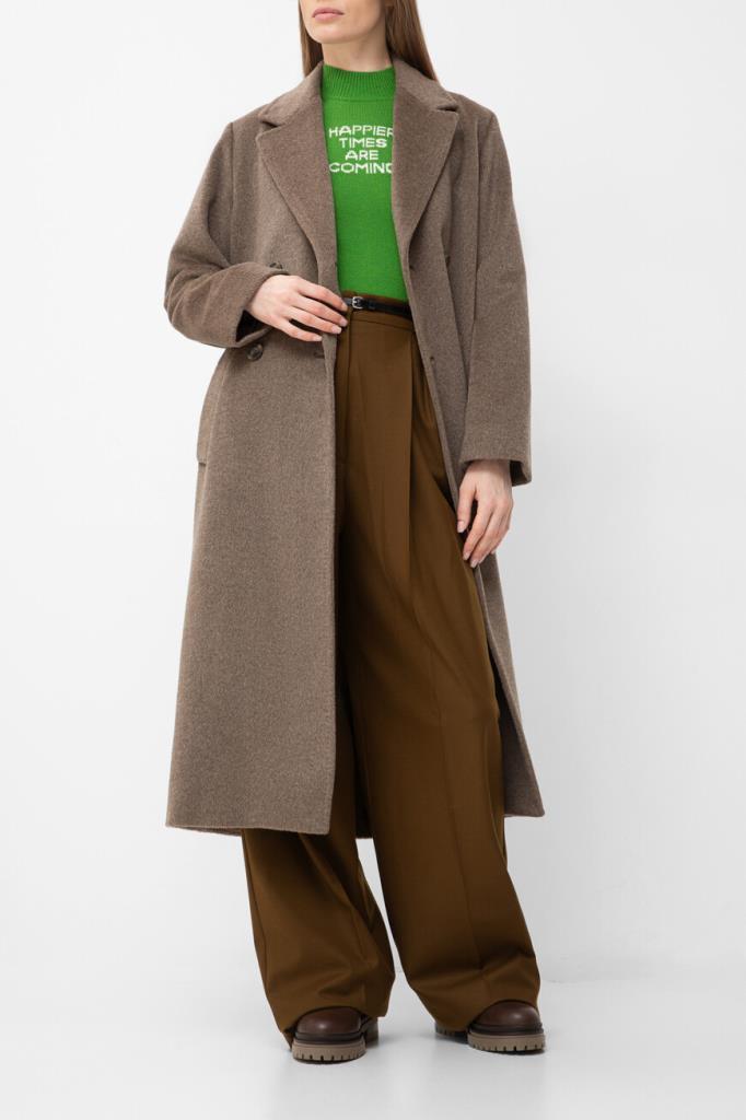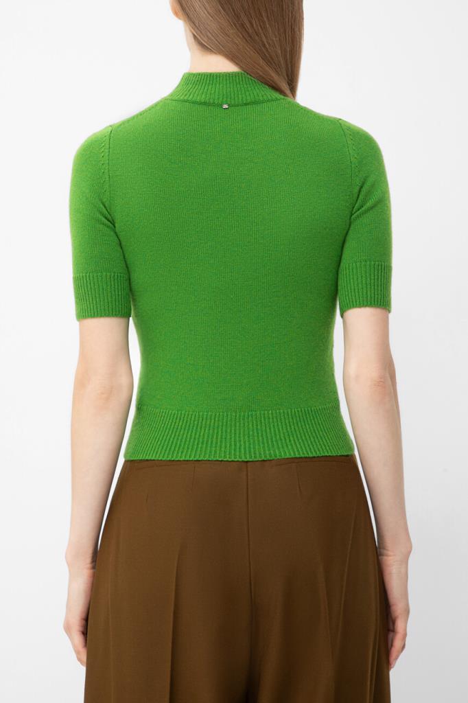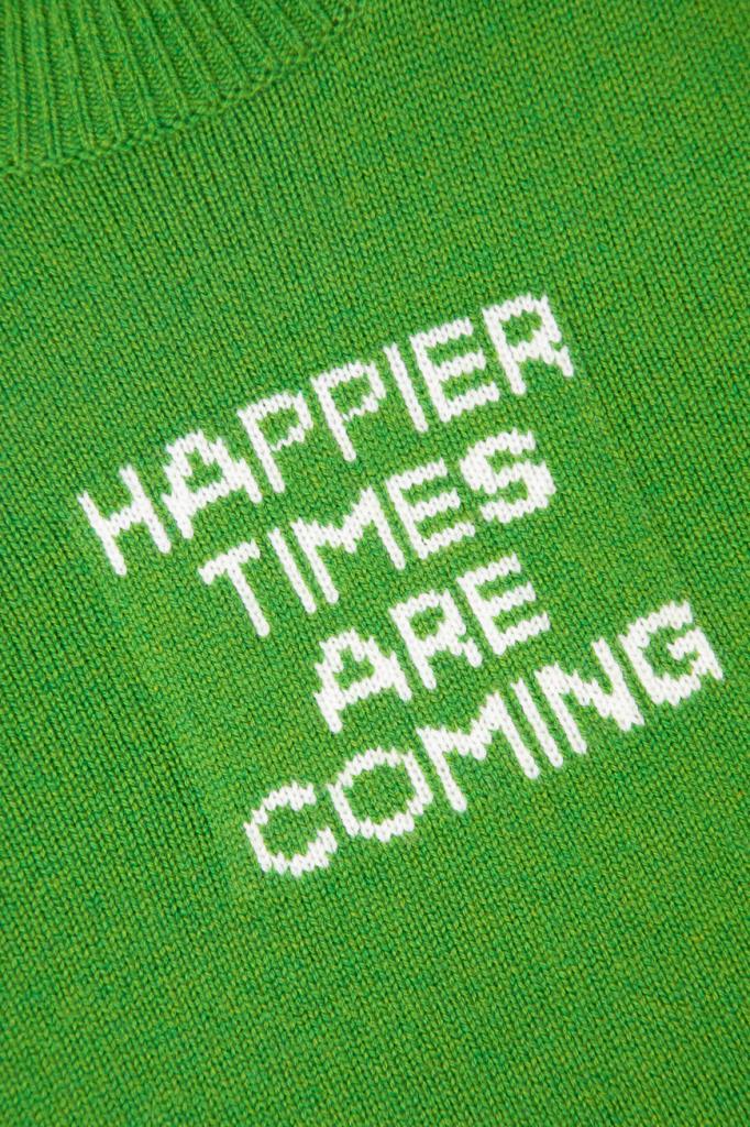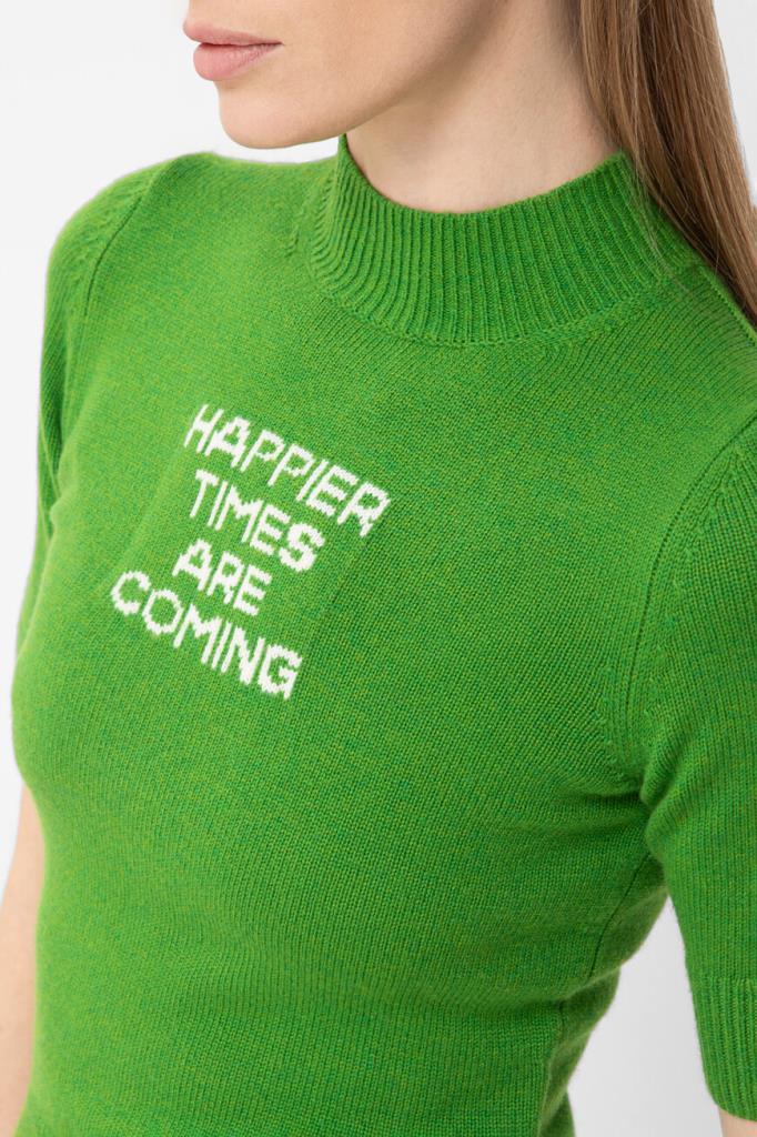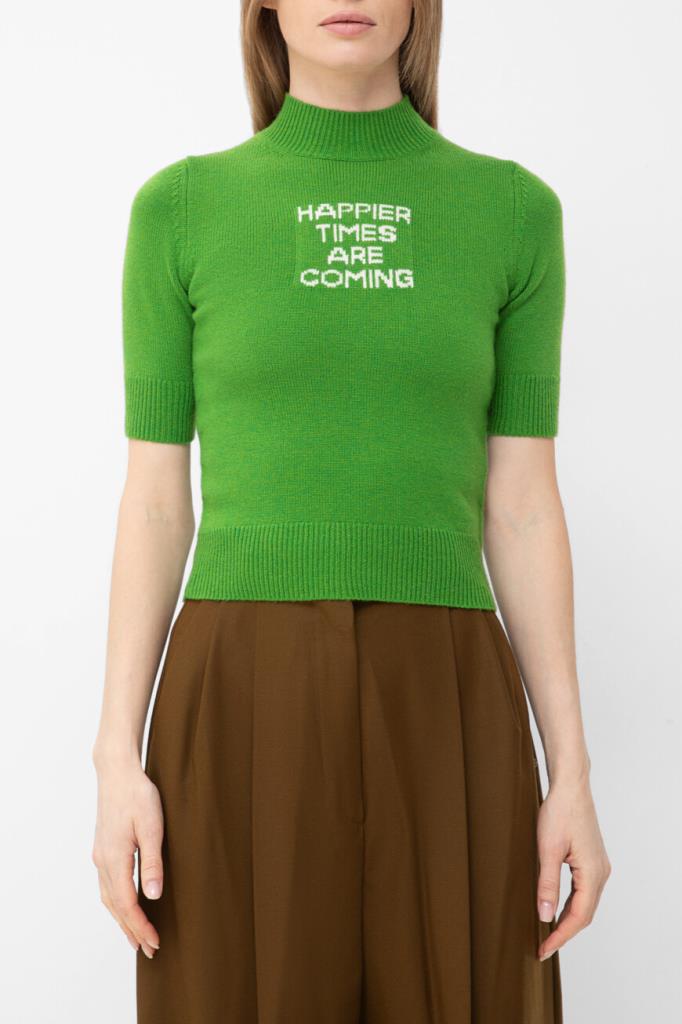 Зелёный джемпер с коротким рукавом от Max Mara. Для создания модели прилегающего силуэта выбран мягкий трикотаж на основе шерсти и кашемира. Изделие отличается чулочной вязкой и вставкой с крупной белой надписью «Счастливые времена наступают» спереди. Образ можно дополнить шерстяными брюками оверсайз из той же коллекции.
