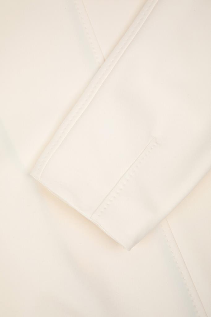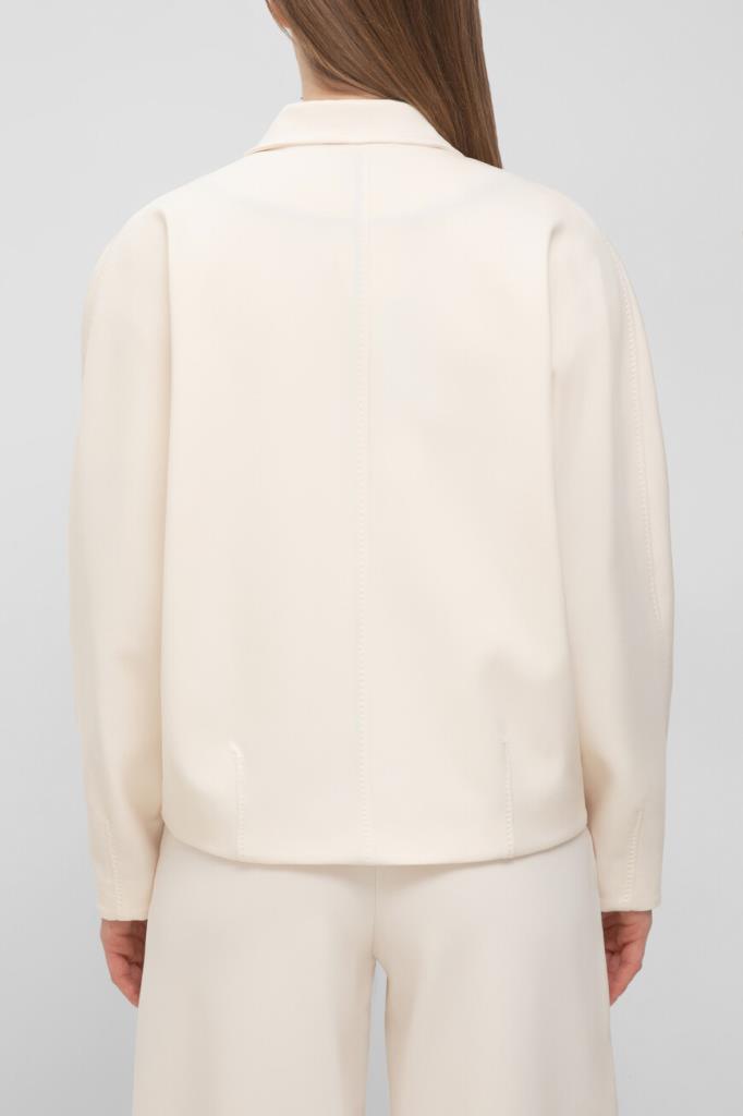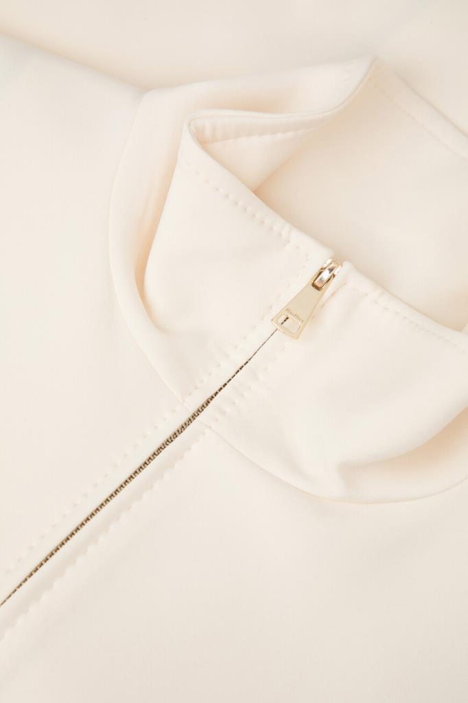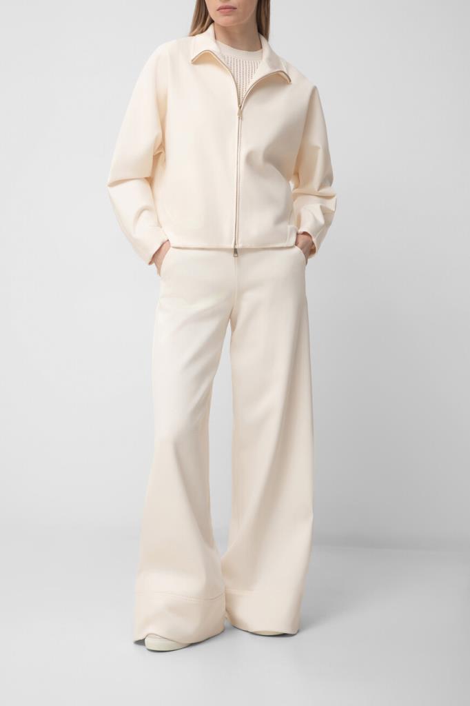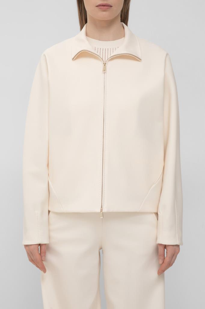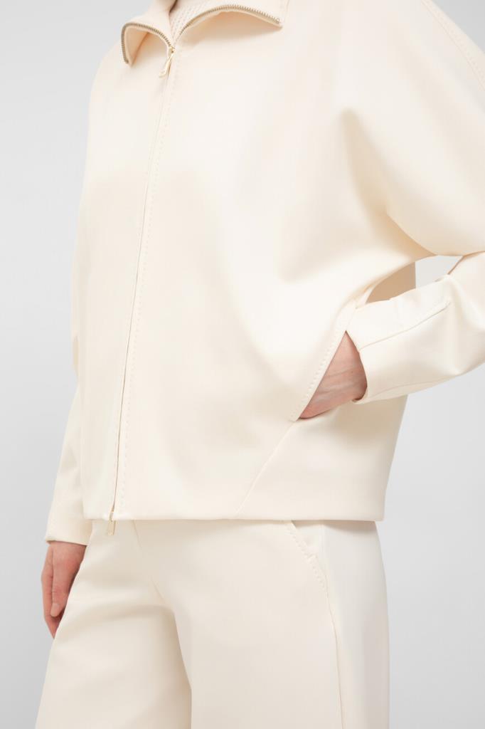 Олимпийка Max Mara цвета слоновой кости. Модель выполнена из мягкого джерси с боковыми вытачками, идущими по всей длине, рукавами-кимоно и высоким воротником. Имеет боковые карманы и вытачки на манжетах, которые придают объема рукавам. Отличным дополнением к олимпийке станут брюки из той же коллекции.
