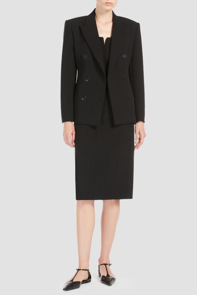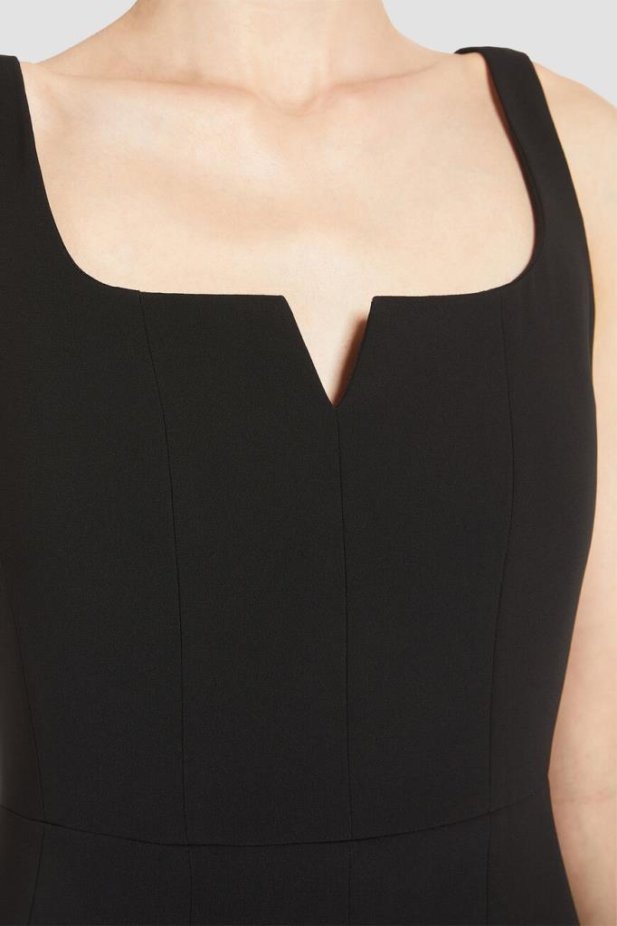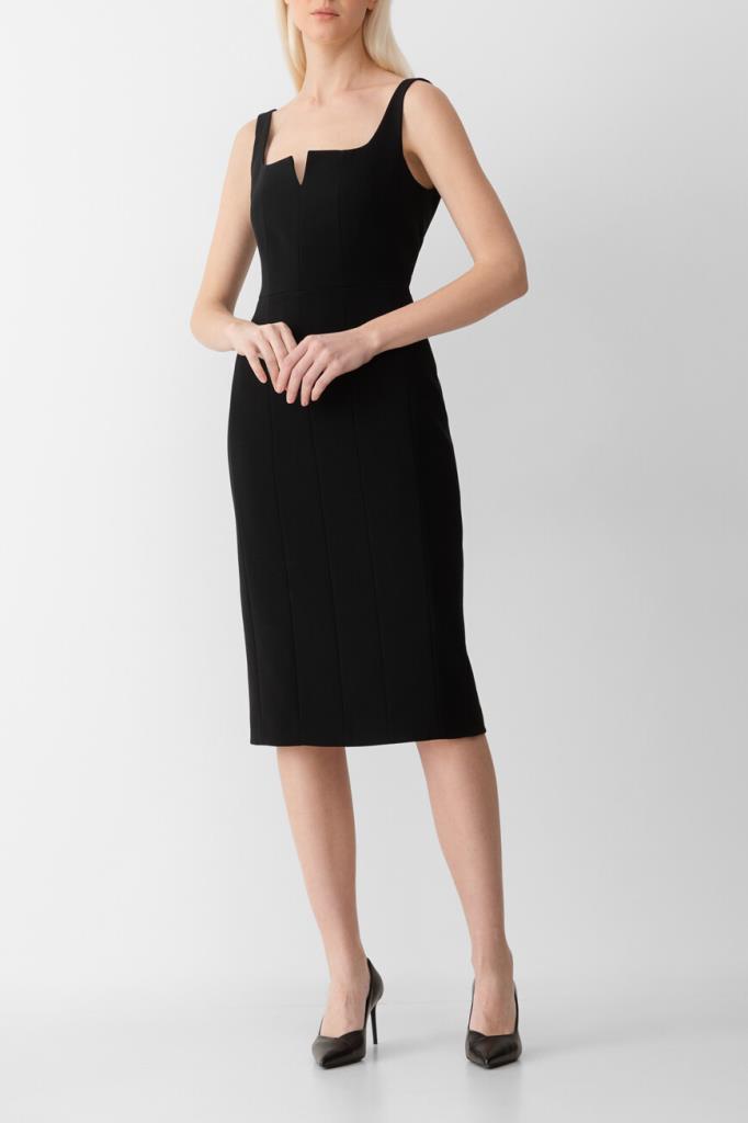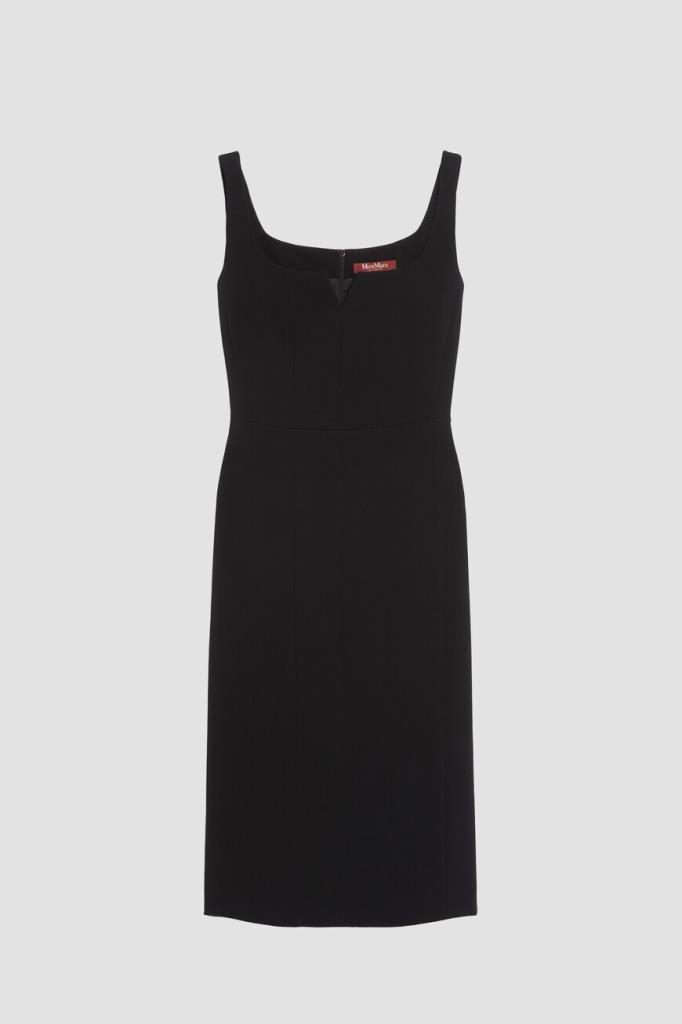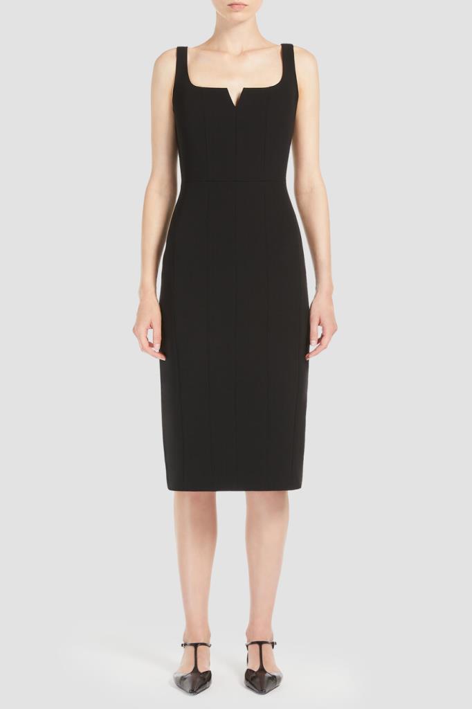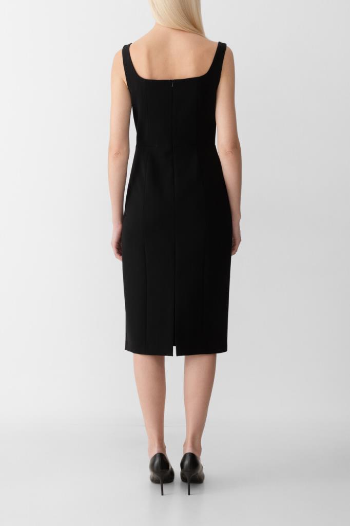 Платье миди от Max Mara без рукавов выполнено из ткани кади премиум-класса. Глубокий квадратный вырез геометрической формы и небольшой разрез спереди – детали, которые делают это изделие особенным. В роли декора: вертикальная строчка по всей поверхности, вытягивающая силуэт.