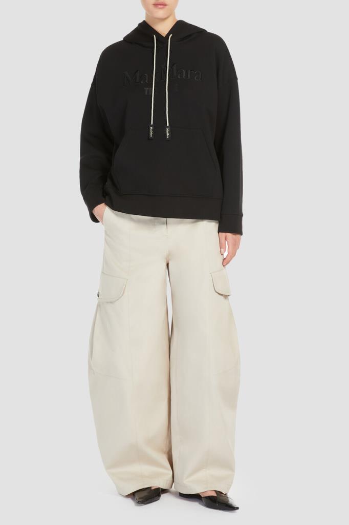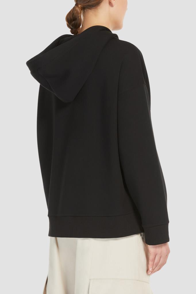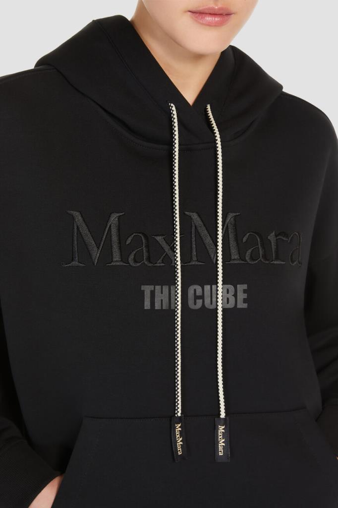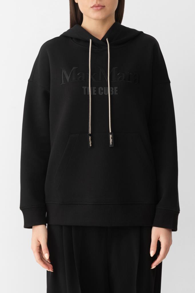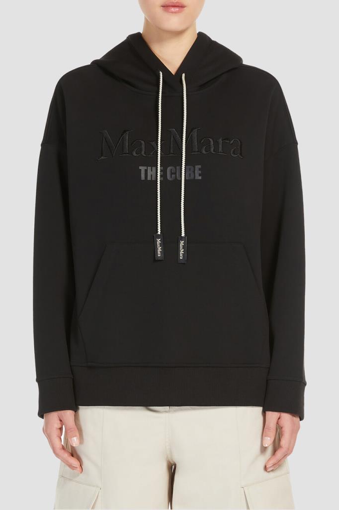 Черное худи Max Mara из мягкого джерси – идеальный выбор для тех, кто ценит комфорт. Свободный крой и спущенные плечи создают расслабленный силуэт, идеально подходящий для повседневной носки. Дизайнеры бренда дополнили модель капюшоном на кулиске с двухцветным шнуром, а также фирменным логотипом Max Mara The Cube. Карман-кенгуру у модели обеспечивает удобство и практичность.