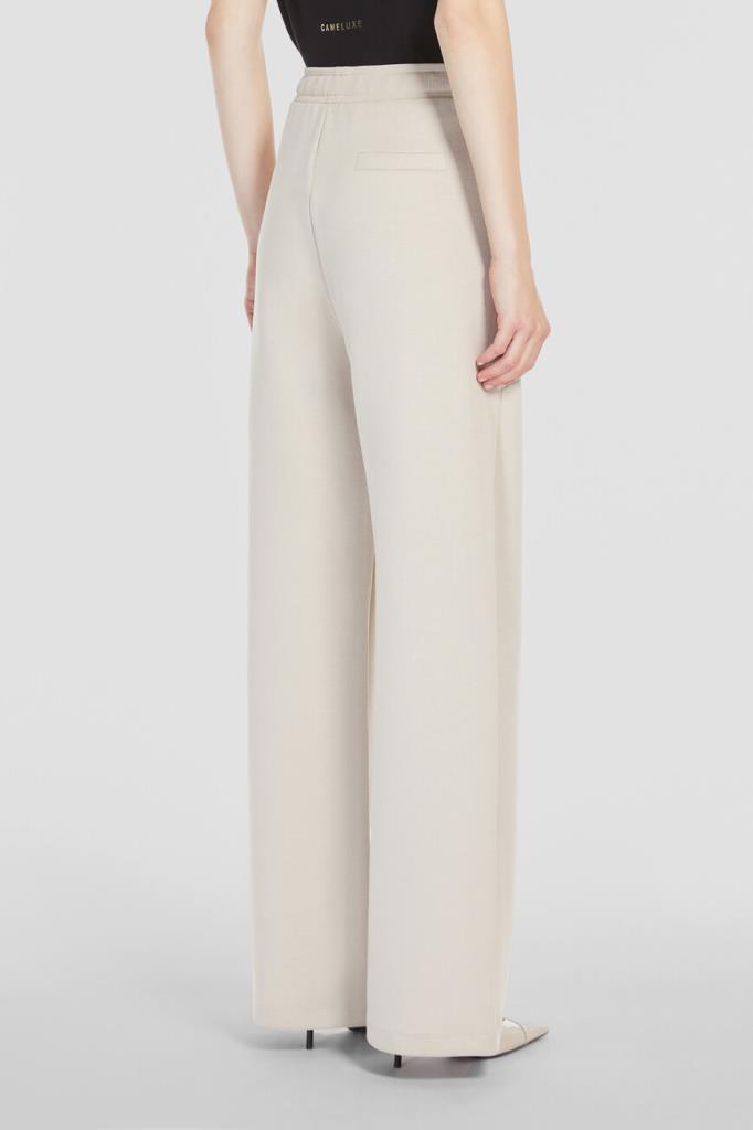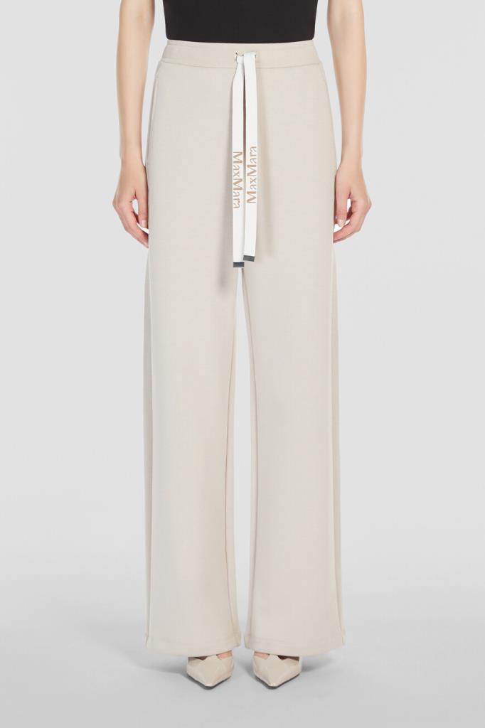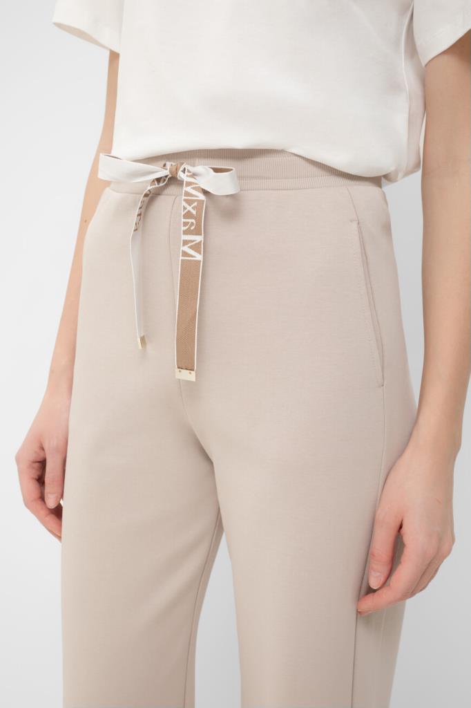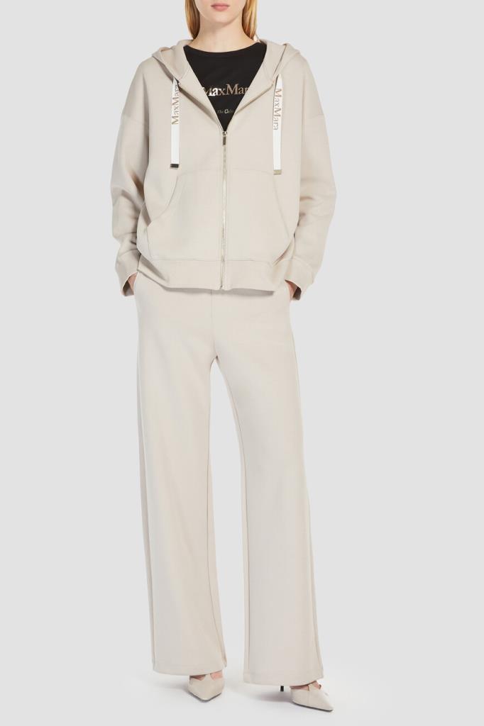 Брюки Max Mara из мягкого и приятного на ощупь трикотажа выполнены в бежевом оттенке. Свободный крой и широкие штанины не сковывают движения, а эластичный пояс с фирменной жаккардовой лентой обеспечивает комфортную посадку. Практичные детали: удобные боковые карманы по швам и задний прорезной карман. Эти брюки станут незаменимой вещью в вашем гардеробе; особенно хорошо они смотрятся с толстовкой из той же коллекции бренда.