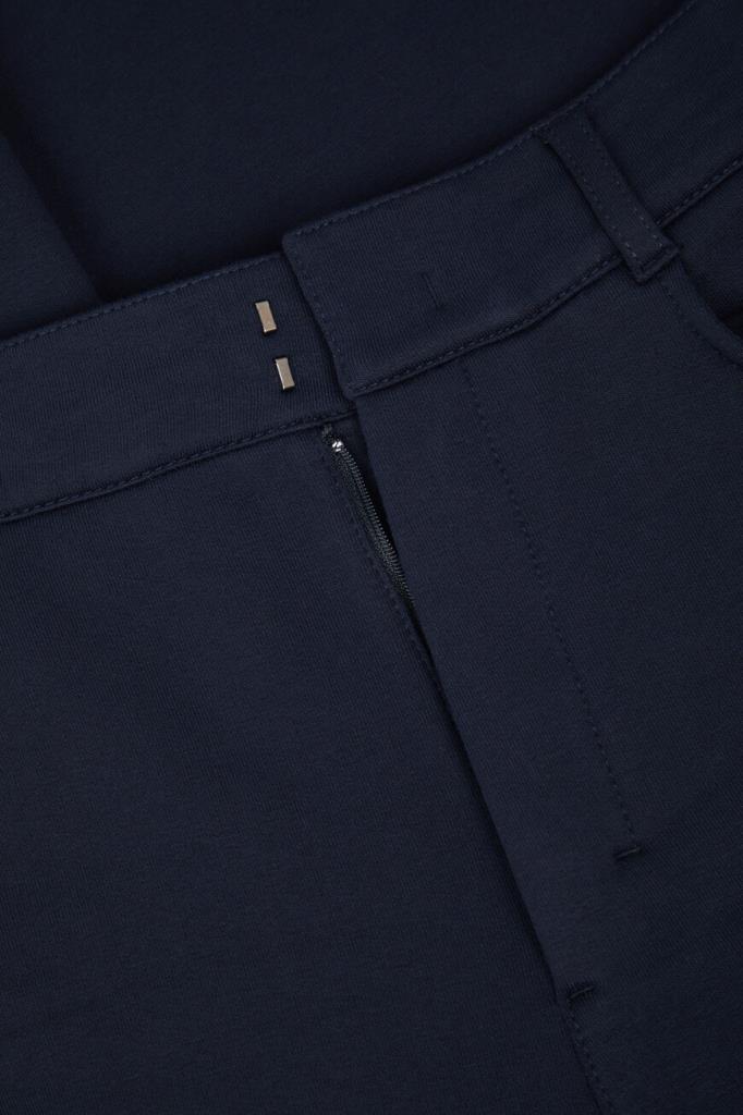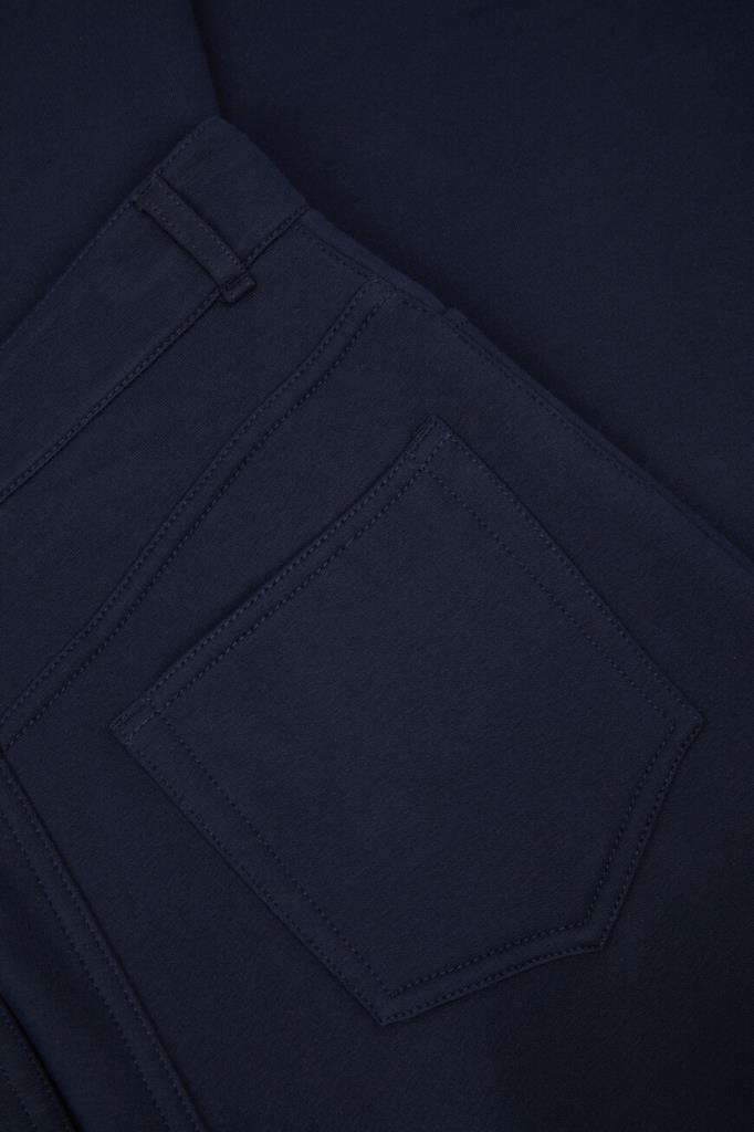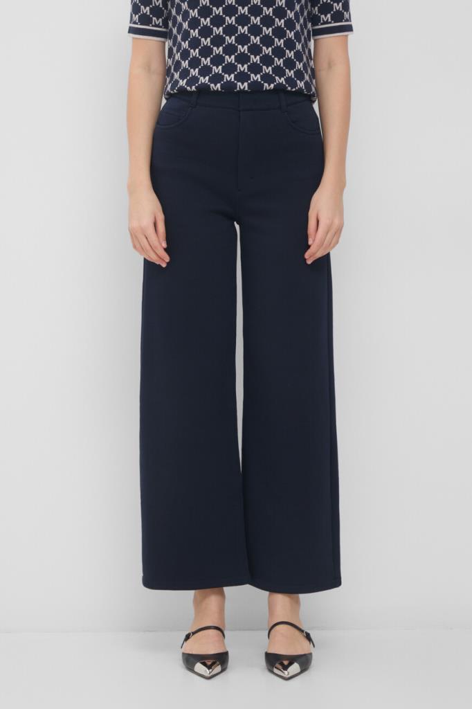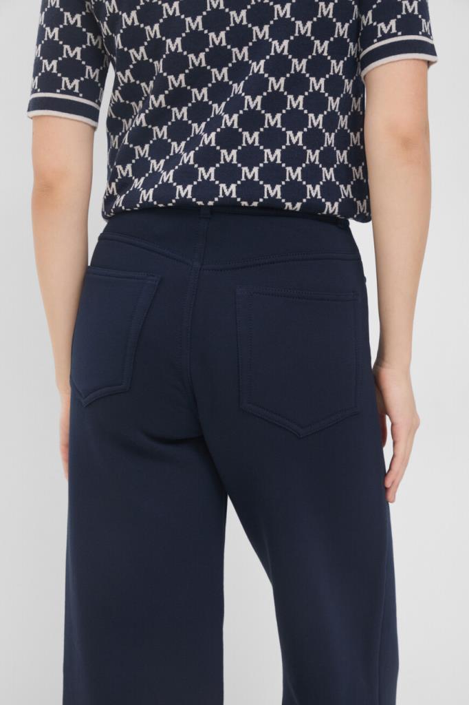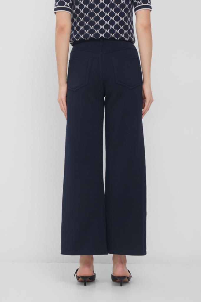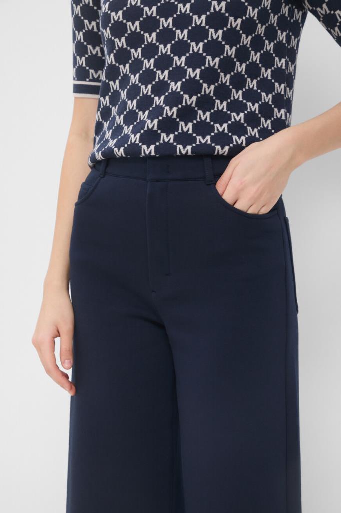 Широкие брюки из эластичного тёмно-синего джерси от Max Mara. Изделие из мягкого флиса на основе хлопка и прочного нейлона с начесом характеризуется объёмным пятикарманным силуэтом и наличием потайной застёжки на молнию и крючки с планкой. Укороченная модель составит превосходный комплект с жаккардовым джемпером из той же линейки.