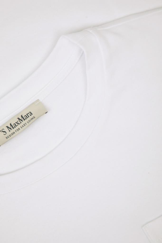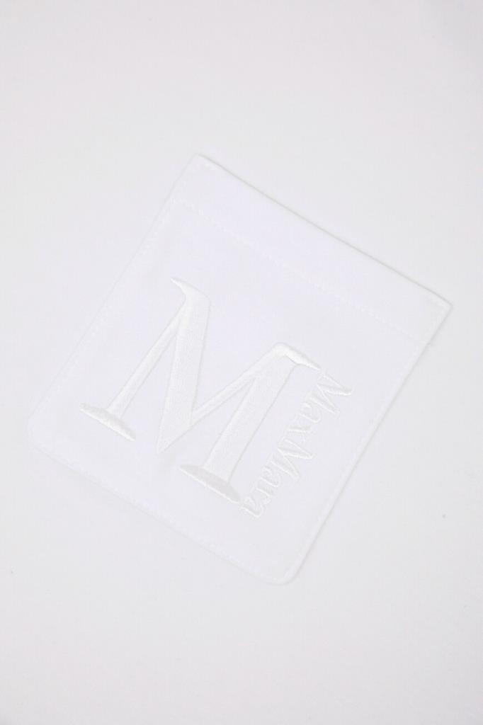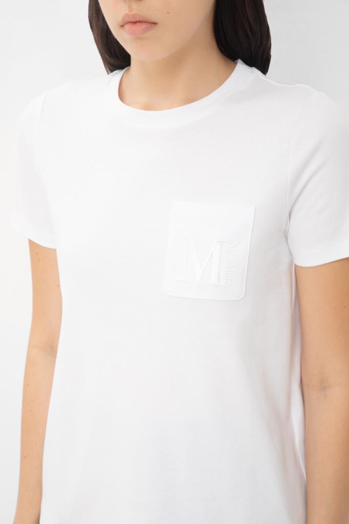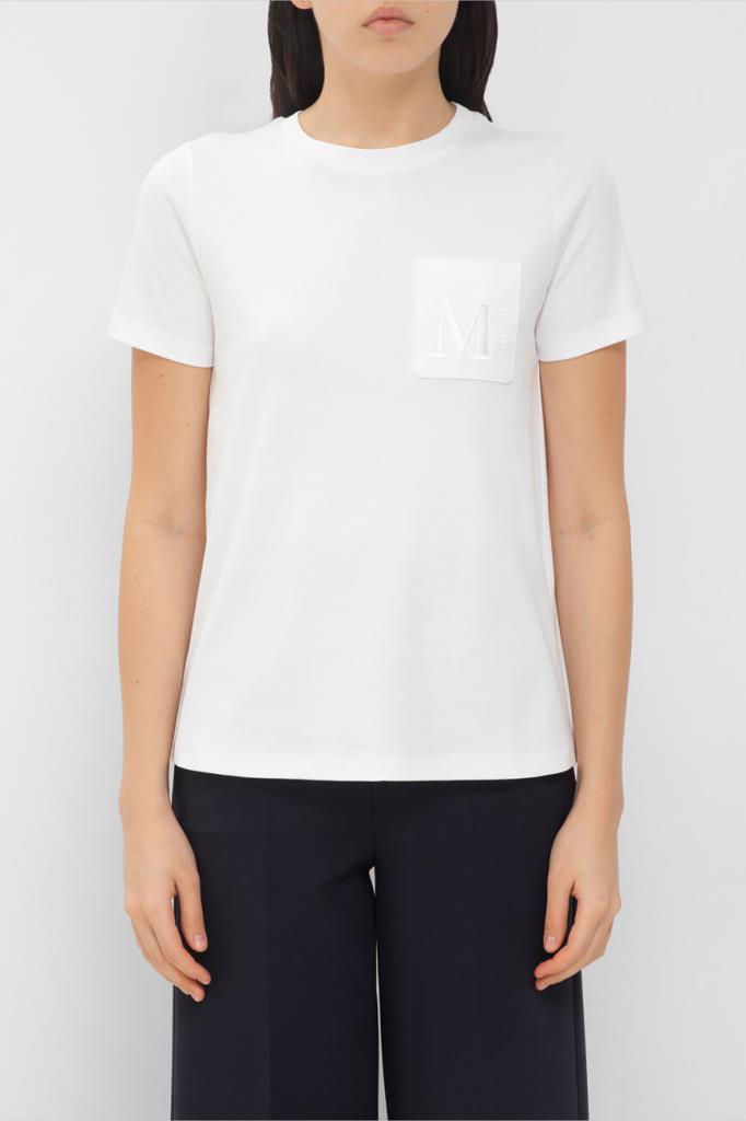 Прямая футболка с вышитой знаковой символикой бренда Max Mara. Изделие выполнено из мягкого хлопкового трикотажа белого базового цвета. Фасон повседневной модели предполагает наличие круглого выреза горловины и нагрудного накладного кармана слева. На небольшом кармане размещены крупная литера «M» и тональная надпись-логотип.