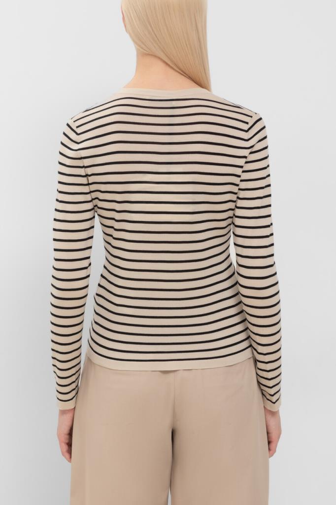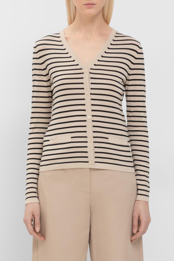 Кардиган Max Mara в чёрную полоску – образец высокого качества и внимания к деталям. Для создания модели бежевого оттенка выбрана тонкая, легкая пряжа из чистой шерсти virgin, которая приятна на ощупь и обеспечивает комфорт в течение всего дня. Изящный V-образный вырез, прорезные карманы и отделка делают изделие идеальным дополнением к вашему гардеробу.