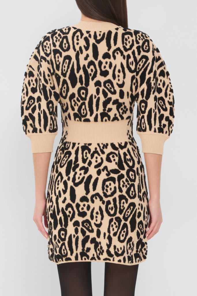 Платье Max Mara с жаккардовым узором и выразительной махровой отделкой. Дикий анималистичный принт придает силуэту особую остроту, а свободный фасон и спущенные плечи позволяют чувствовать себя комфортно и двигаться без ограничений. Эластичные вставки в рубчик на горловине, манжетах и линии талии деликатно подчеркнут фигуру, добавив в образ женственности.