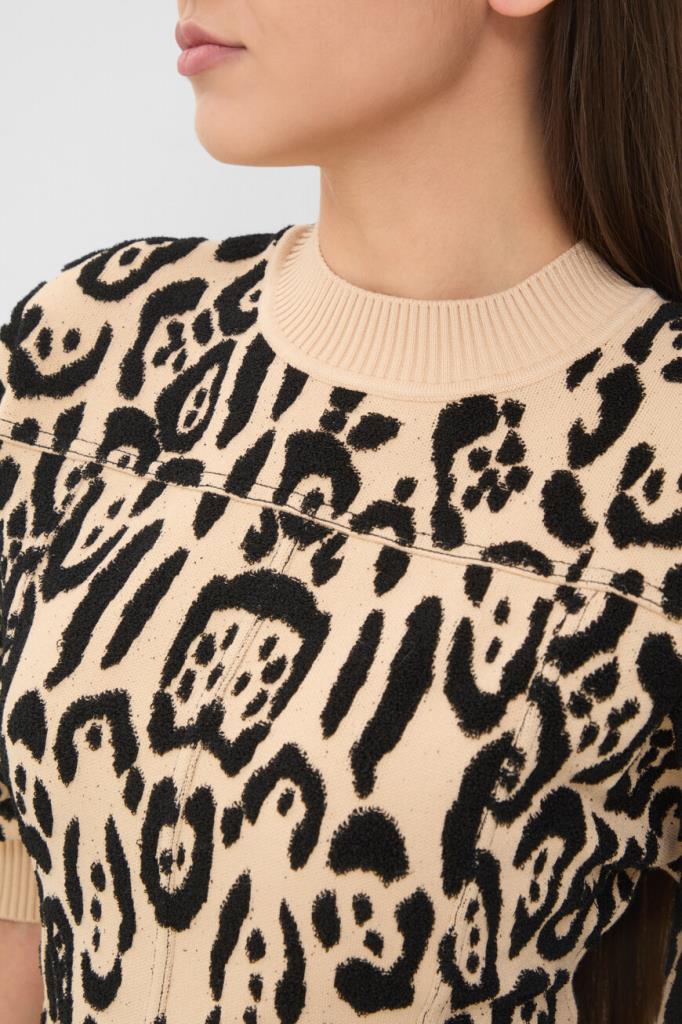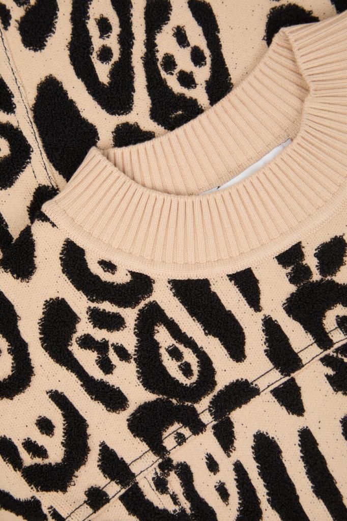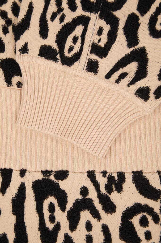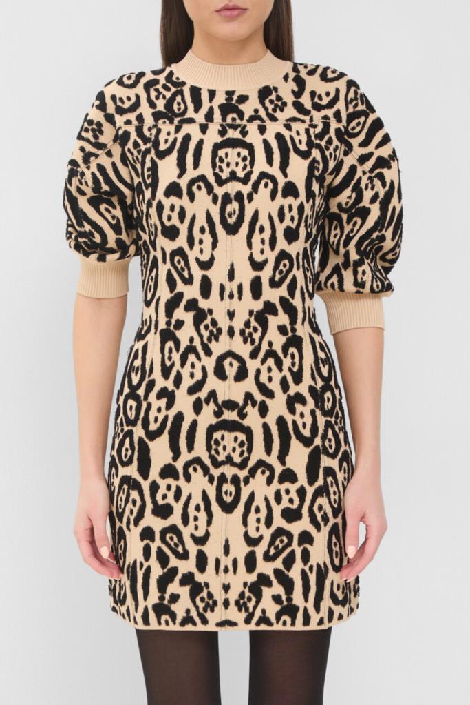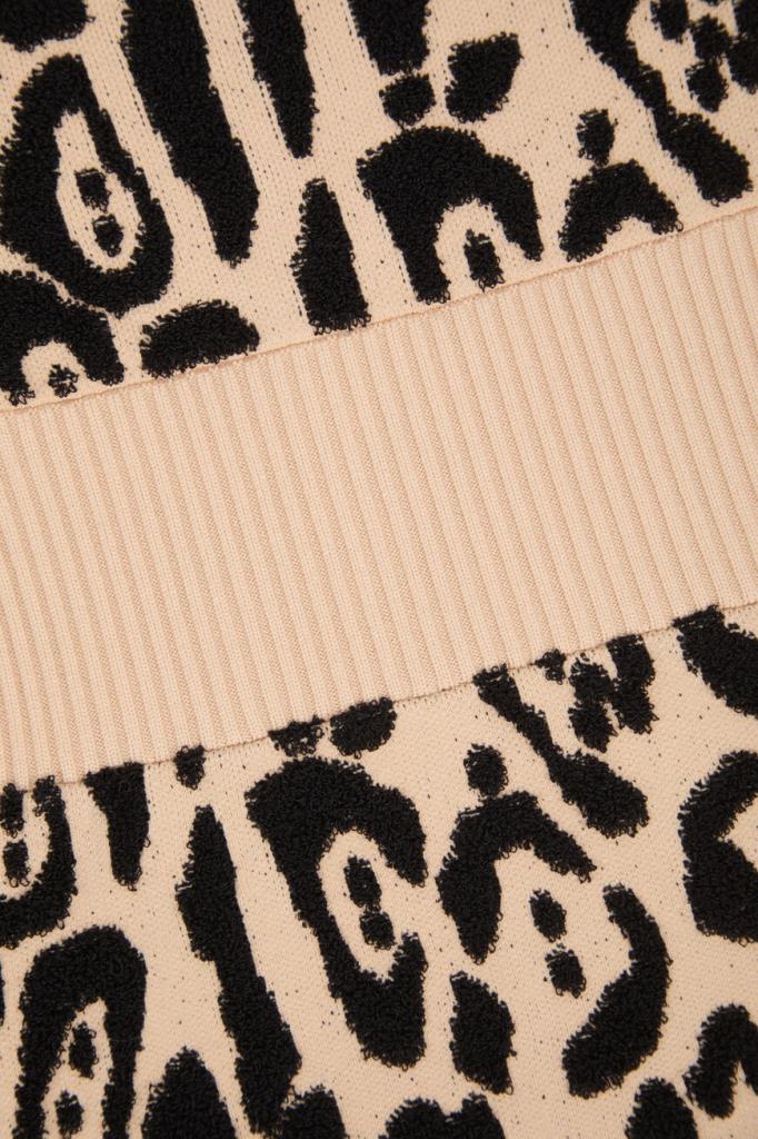 Платье Max Mara с жаккардовым узором и выразительной махровой отделкой. Дикий анималистичный принт придает силуэту особую остроту, а свободный фасон и спущенные плечи позволяют чувствовать себя комфортно и двигаться без ограничений. Эластичные вставки в рубчик на горловине, манжетах и линии талии деликатно подчеркнут фигуру, добавив в образ женственности.