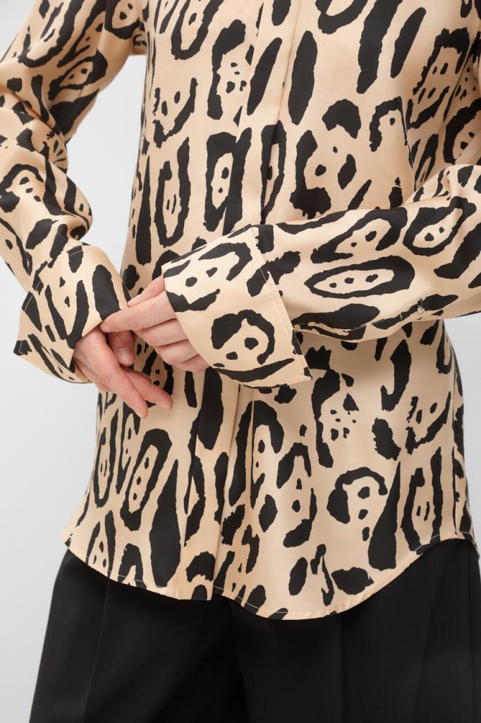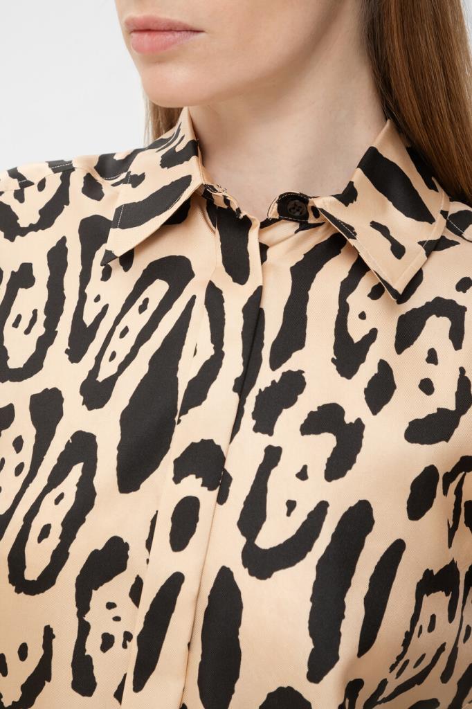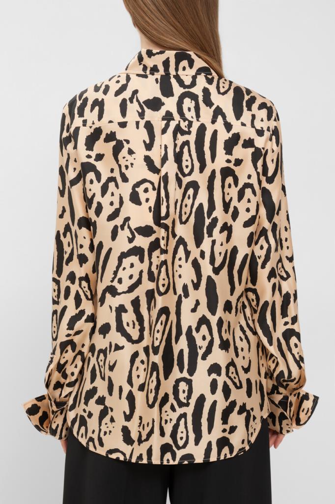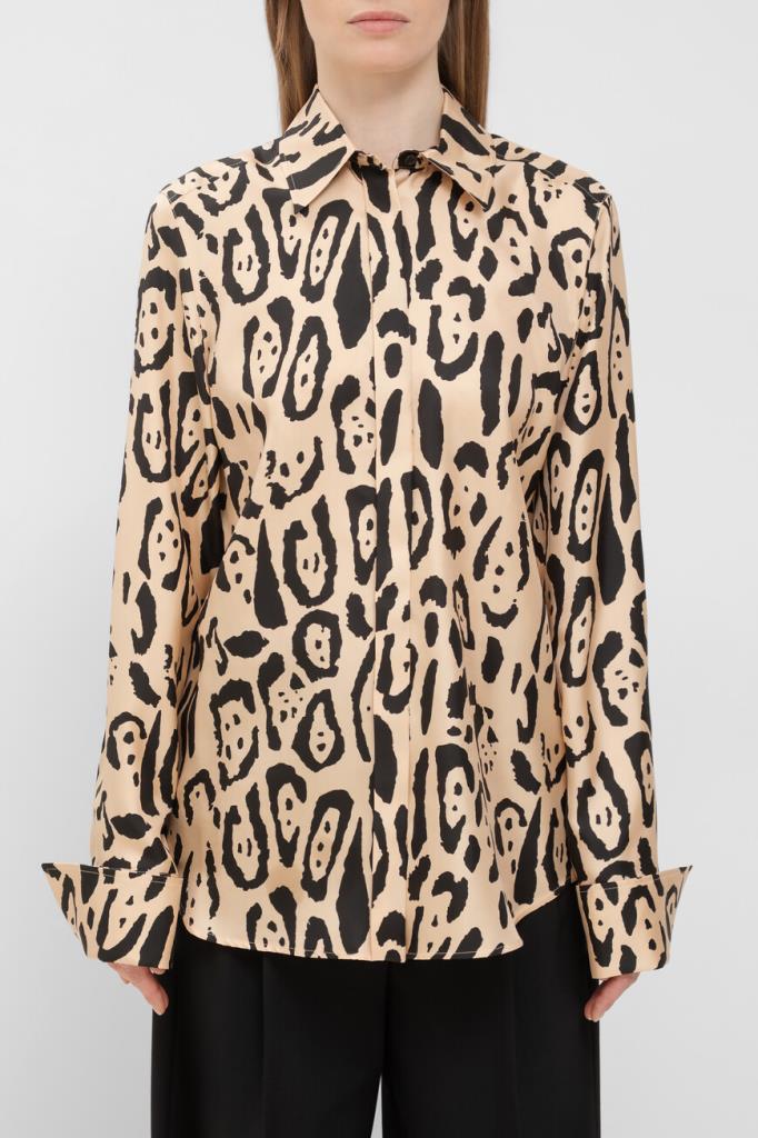Приталенная рубашка Max Mara из чистого шелкового твила с анималистичным принтом. Дизайнеры бренда воплотили в модели настоящую роскошь и вневременную элегантность. Кокетка сзади и манжеты на две пуговицы с подворотами создают классический силуэт. Детали строчки на конструктивных швах подчеркивают высокое качество исполнения. Эта модель станет идеальным дополнением к вашему гардеробу и подойдет для создания элегантных образов.