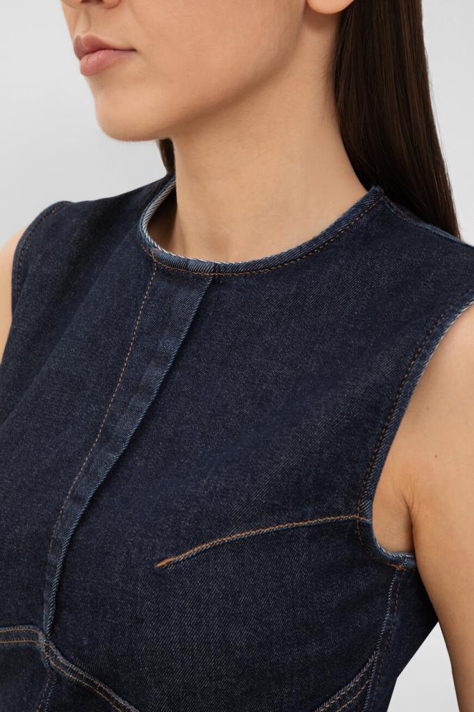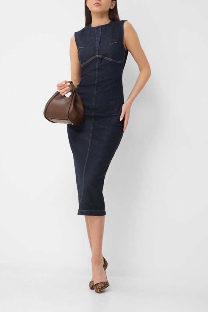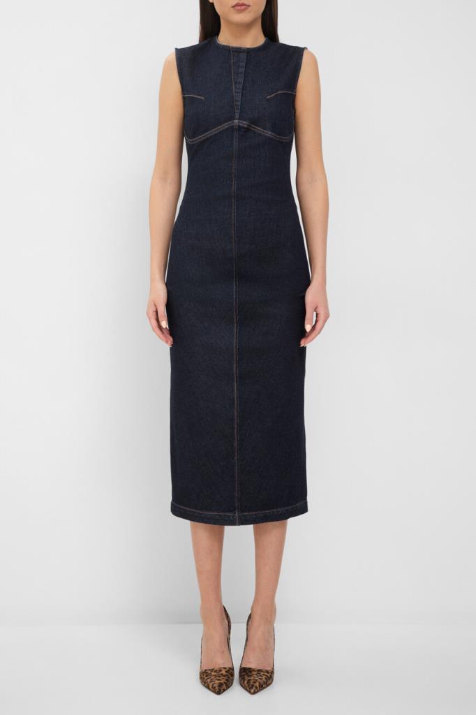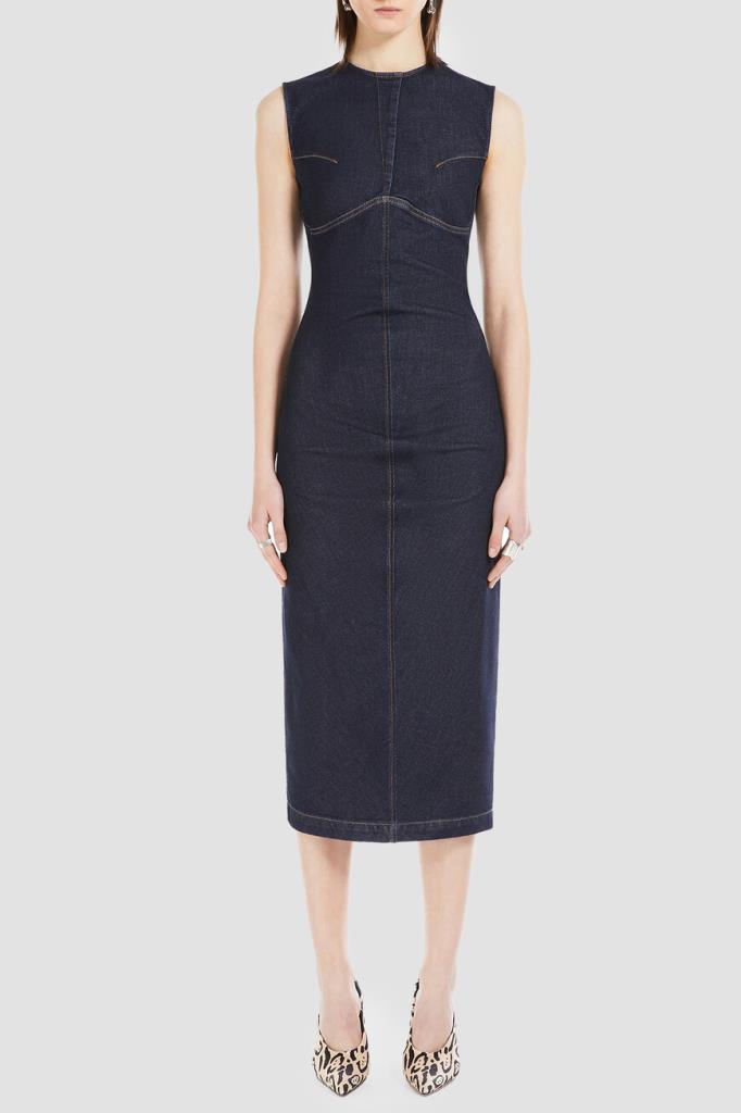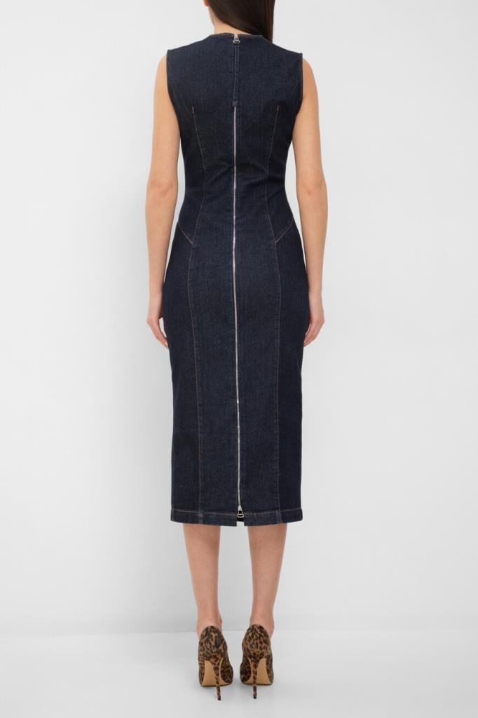 Платье Max Mara без рукавов – современная интерпретация классического футляра. Спиральная конструкция и суперэластичный деним с темной обработкой создают элегантный силуэт. Центральные швы и фигурные боковые детали подчеркивают фигуру, а открытая металлическая молния и строчка на швах добавляют изысканные детали. Платье станет идеальным выбором для повседневных образов и особых случаев.