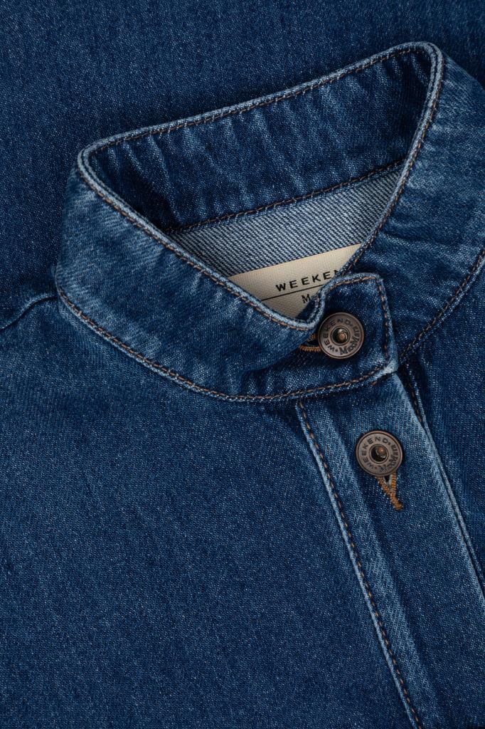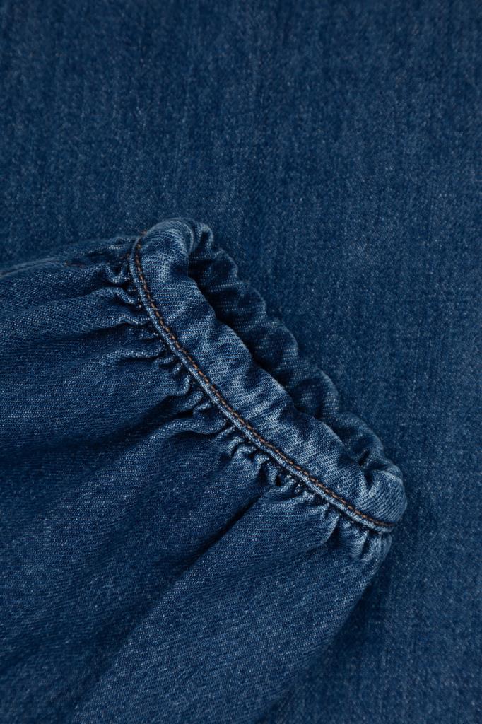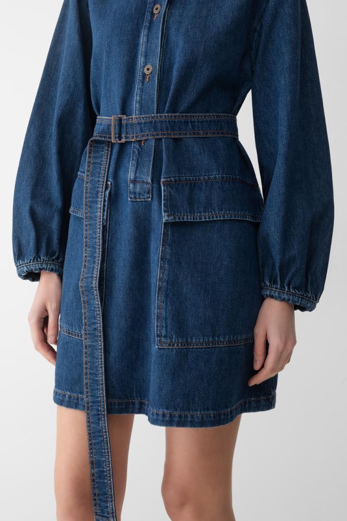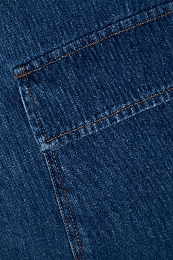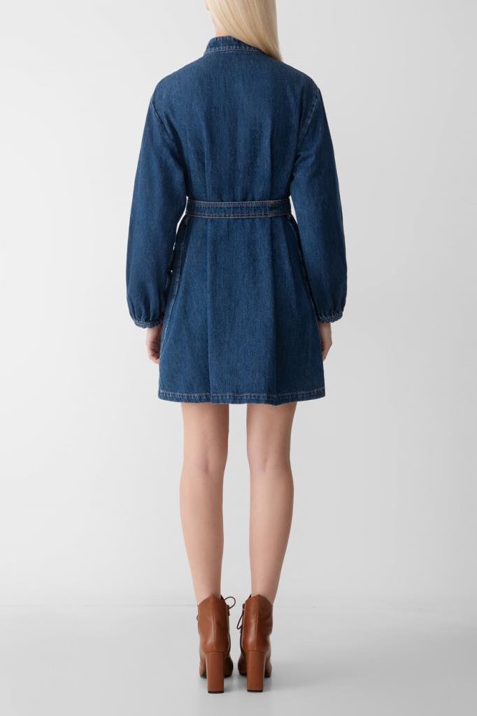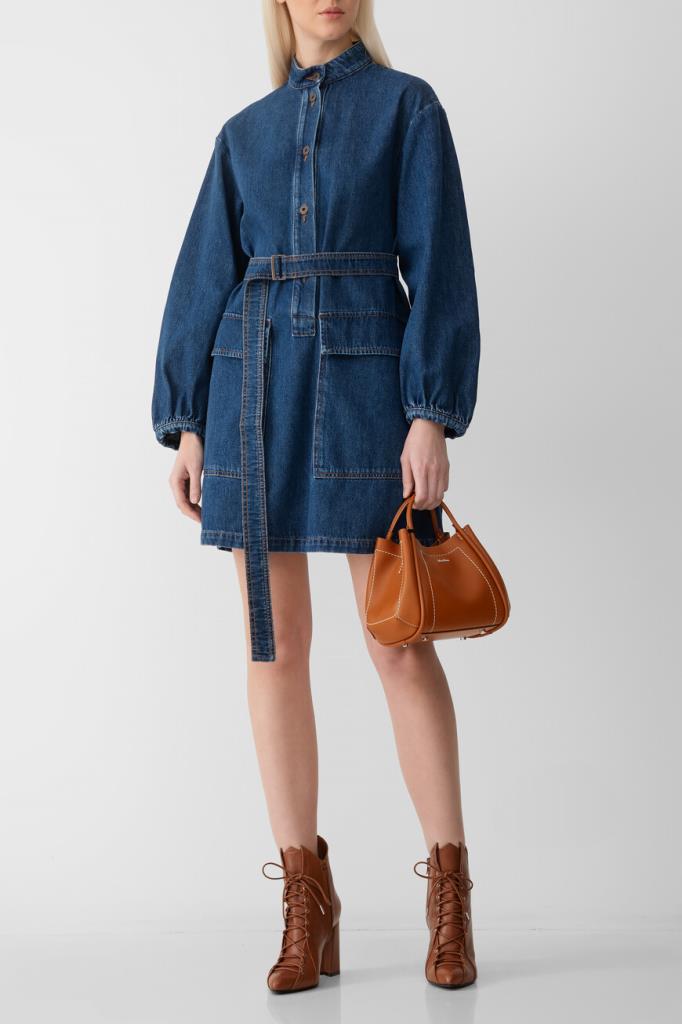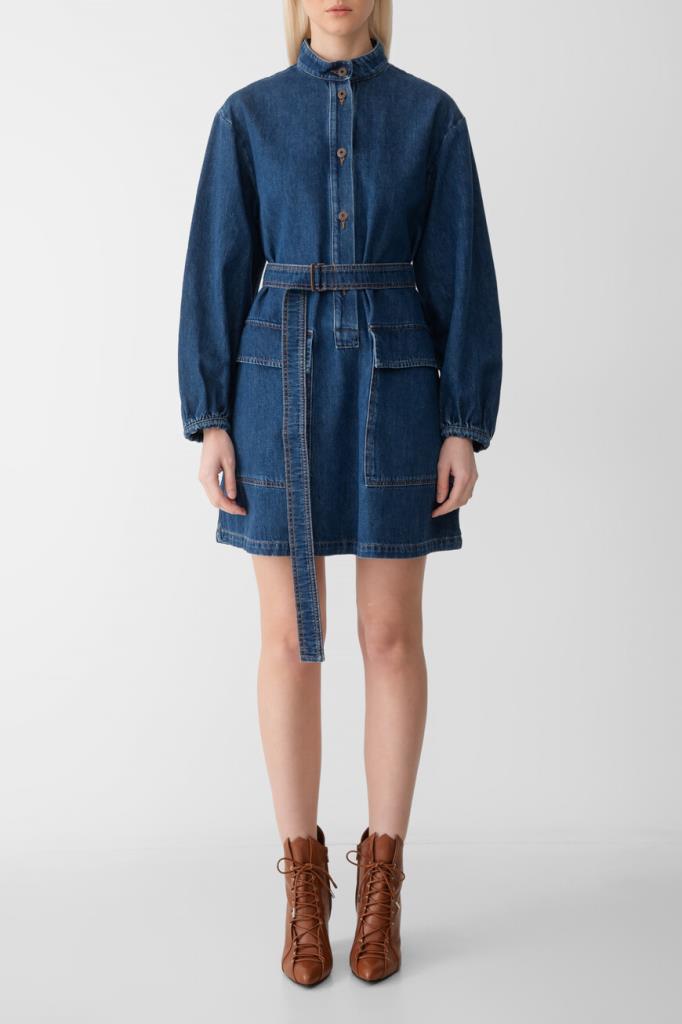 Платье Max Mara свободного кроя из органического хлопкового денима. Модель дополнена невысоким воротником-стойкой и длинными рукавами с присборенными манжетами, которые создают элегантный образ. Пояс с двойной металлической пряжкой подчеркивает талию, а большие накладные карманы с клапанами добавляют практичности. Застежка на пуговицы-гвоздики до талии обеспечивает удобную посадку. Короткое платье изготовлено из натуральных волокон, выращенных в соответствии со стандартами органического земледелия, и обработано с использованием экологически чистых технологий.