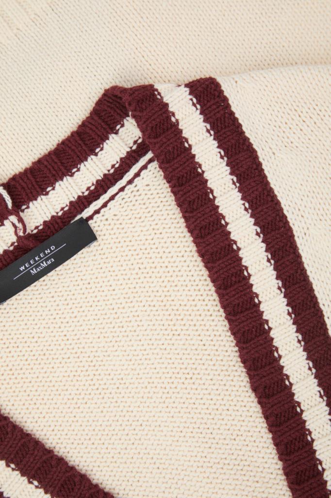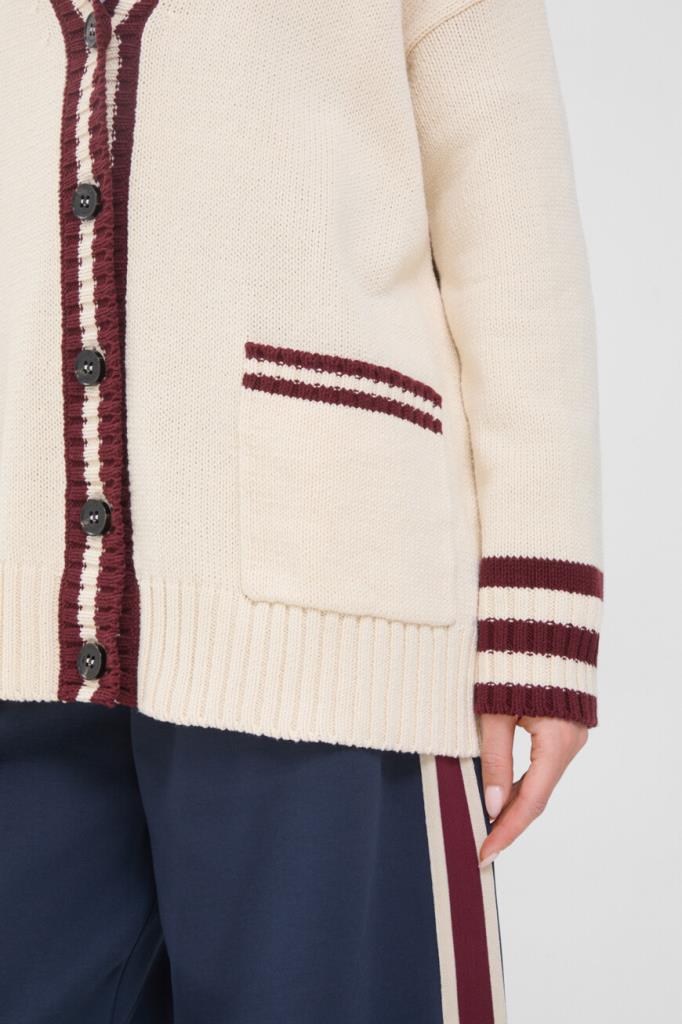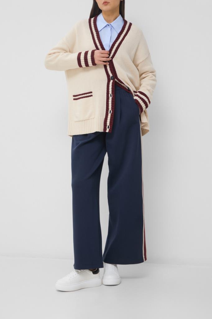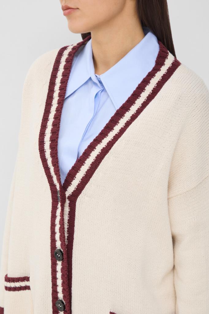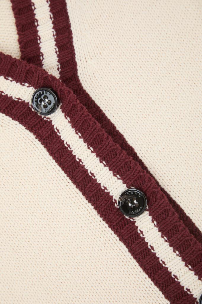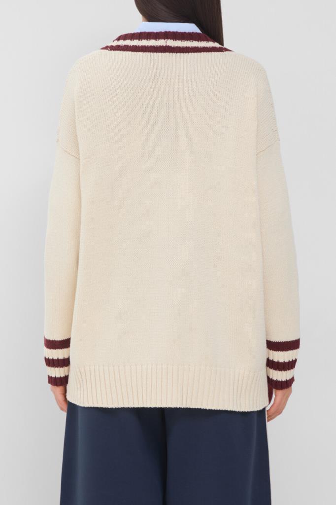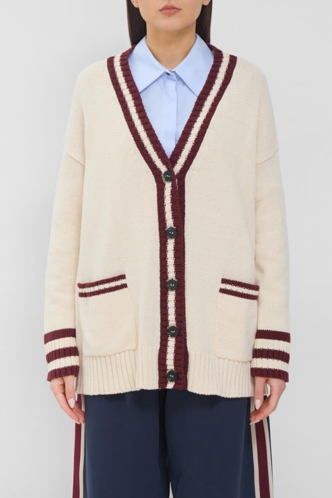 Кардиган Max Mara из мягкой хлопковой пряжи. Отделка в рубчик и полосатый узор привносят модели особый шарм. Силуэт оверсайз, спущенные плечи и V-образный вырез горловины создают расслабленный и элегантный образ. Практичности изделию добавляют длинные рукава и накладные карманы. Модель также имеет застежку на пуговицы, имитирующие рог.