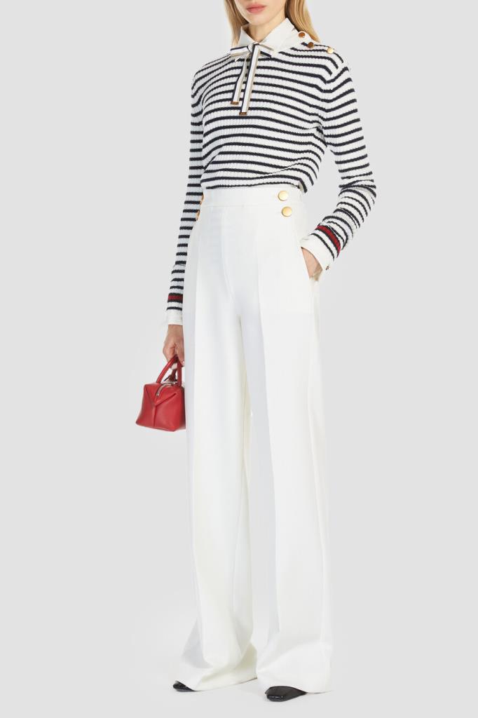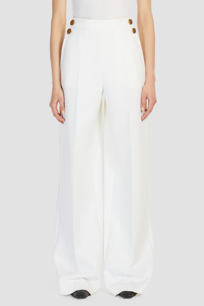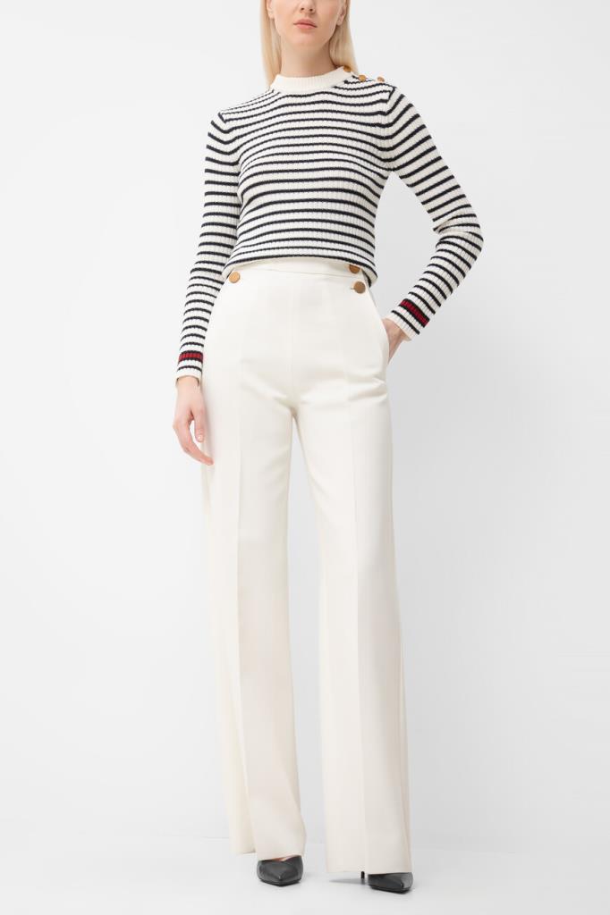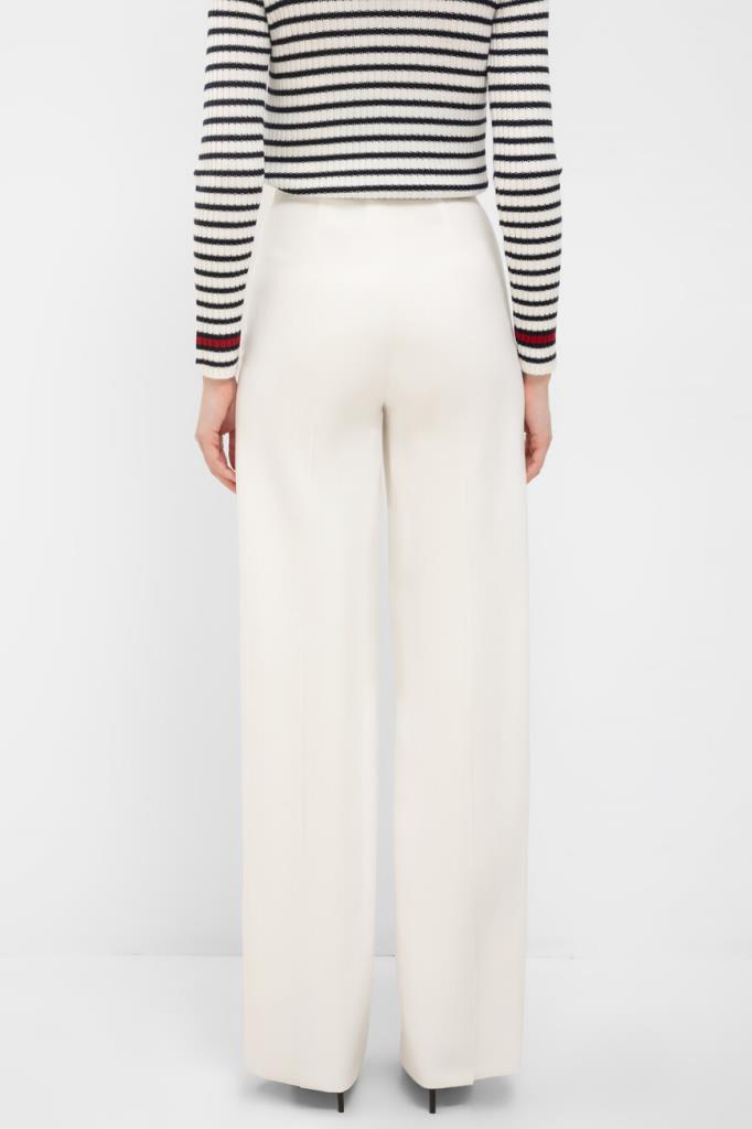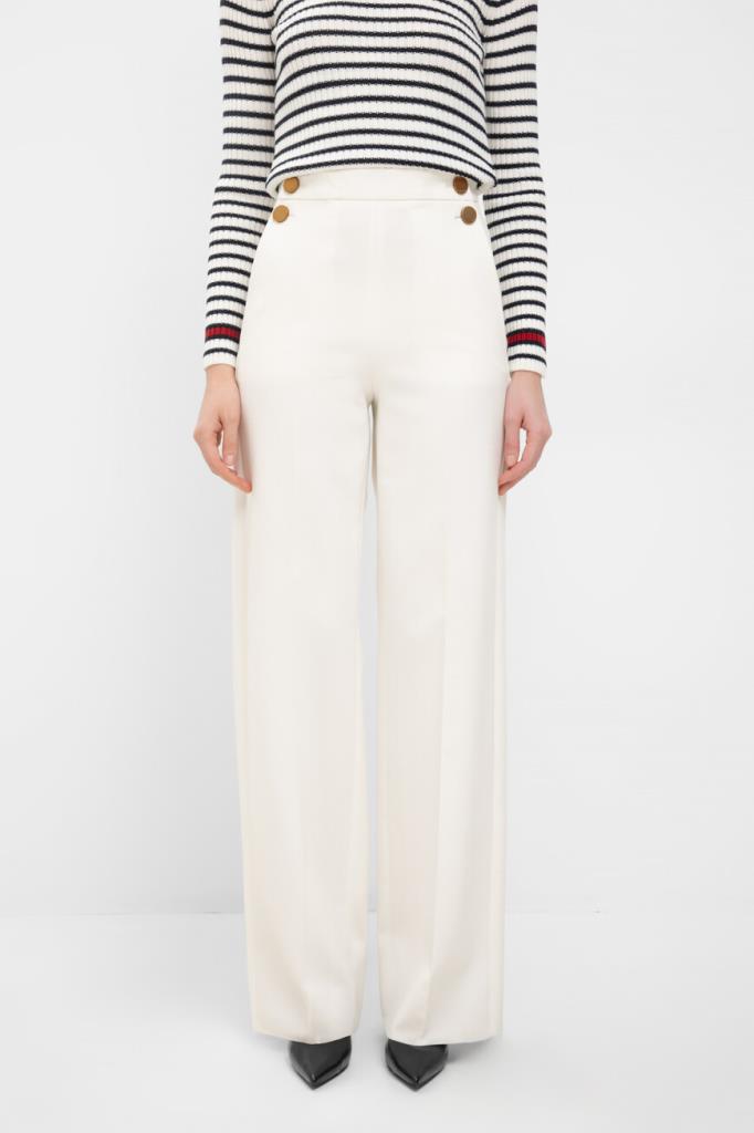 Белоснежные брюки Max Mara выполнены из эластичного шерстяного полотна. Материал двойного плетения обеспечивает непревзойденный комфорт и идеальную посадку. Широкие штанины со стрелками создают элегантный силуэт, а застежка в морском стиле с металлическими пуговицами добавляет оригинальности. Боковые карманы и молния подчеркивают внимание к деталям. Это идеальный выбор для создания изысканных образов.