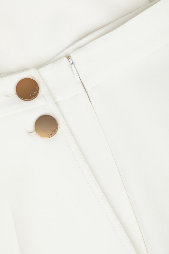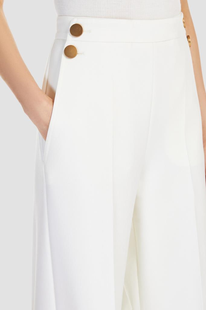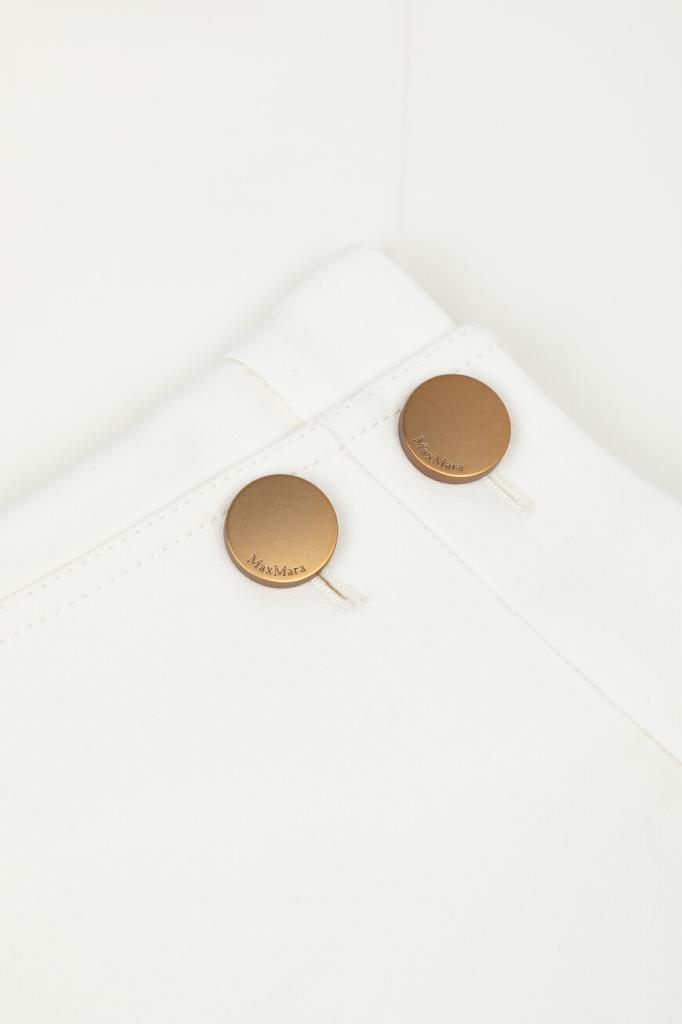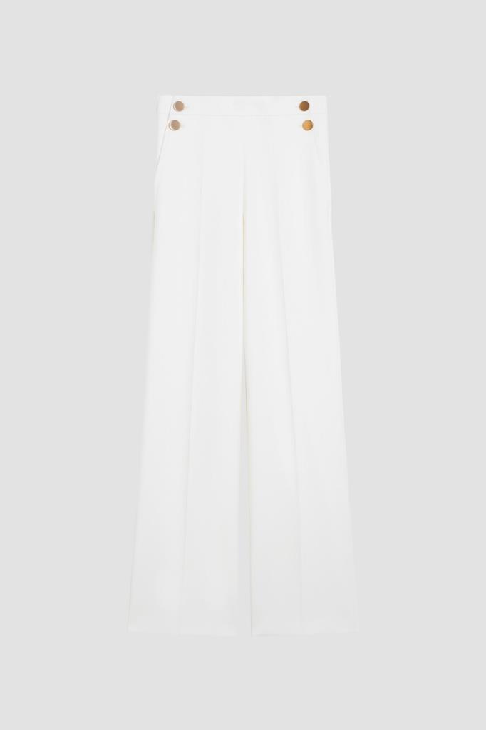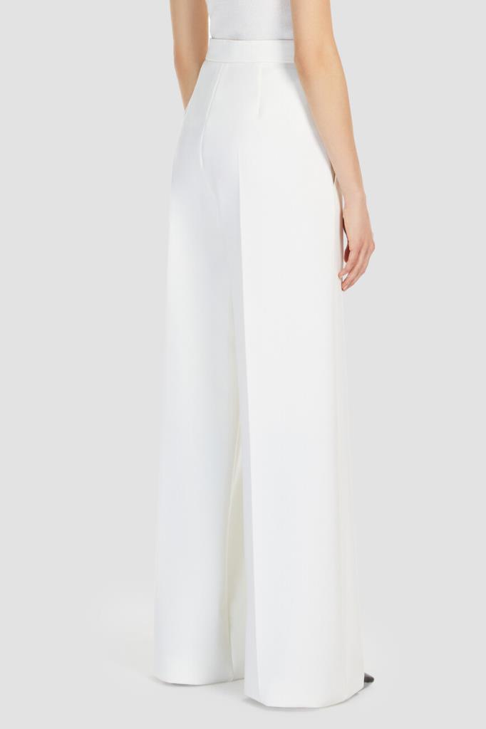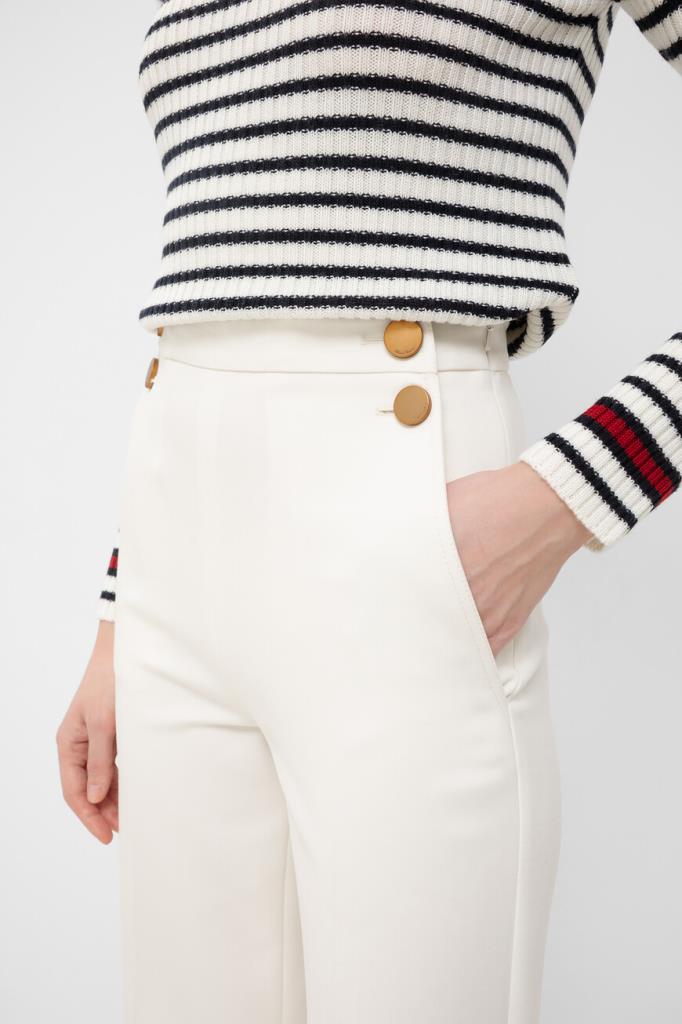 Белоснежные брюки Max Mara выполнены из эластичного шерстяного полотна. Материал двойного плетения обеспечивает непревзойденный комфорт и идеальную посадку. Широкие штанины со стрелками создают элегантный силуэт, а застежка в морском стиле с металлическими пуговицами добавляет оригинальности. Боковые карманы и молния подчеркивают внимание к деталям. Это идеальный выбор для создания изысканных образов.