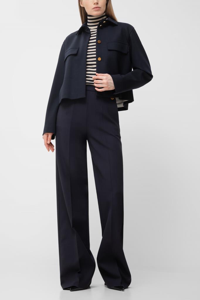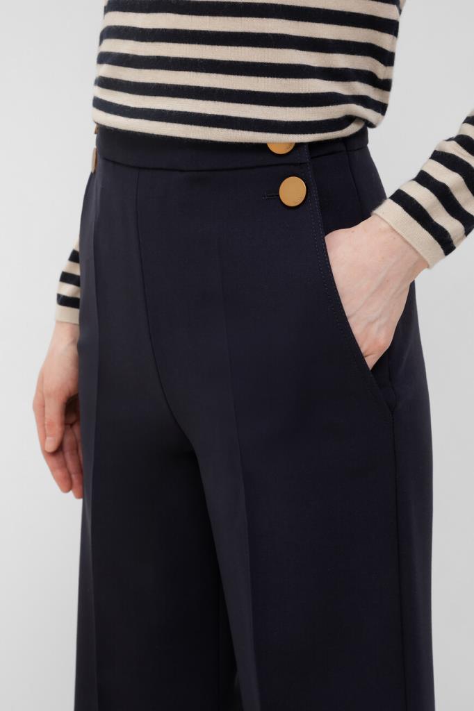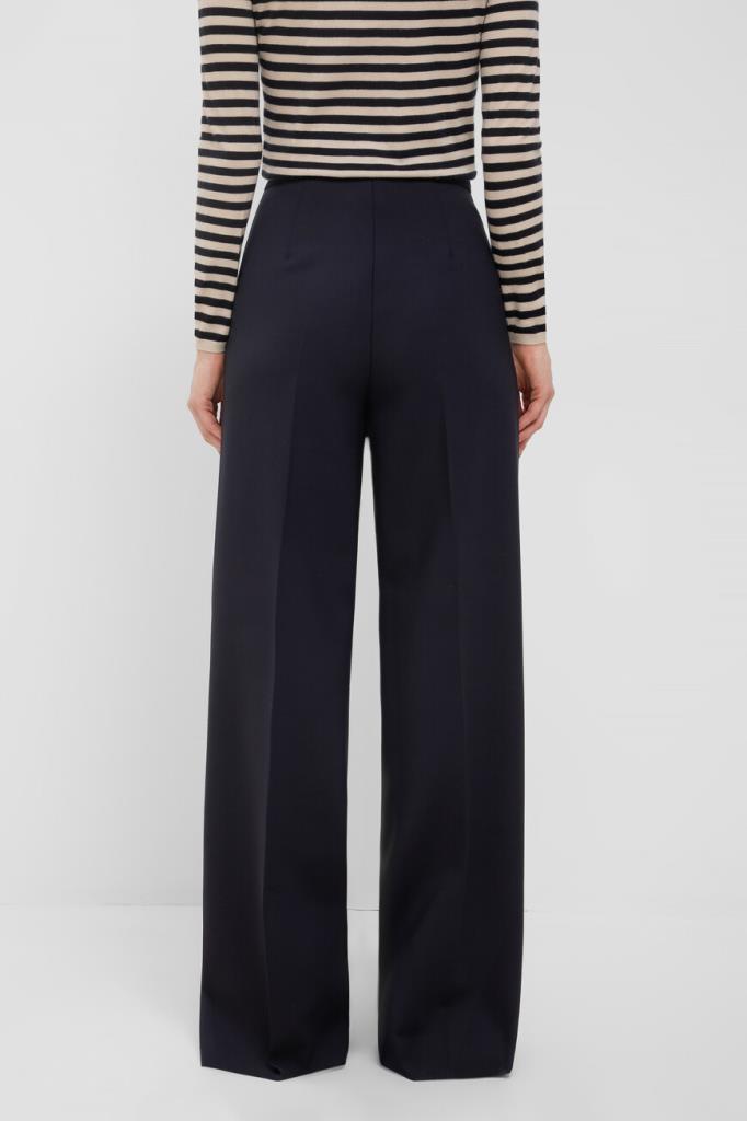 Брюки Max Mara в темно-синем оттенке. Изделие выполнено из эластичного шерстяного полотна двойного плетения, которое обеспечивает непревзойденный комфорт и идеальную посадку. Широкие штанины со стрелками создают элегантный силуэт, а застежка в морском стиле с металлическими пуговицами добавляет оригинальности. Боковые карманы подчеркивают внимание к деталям.