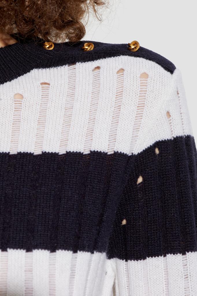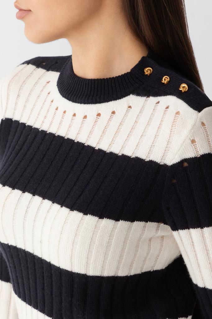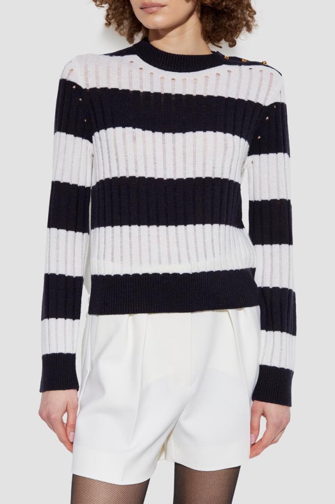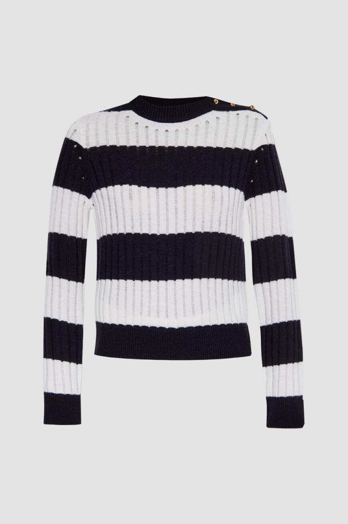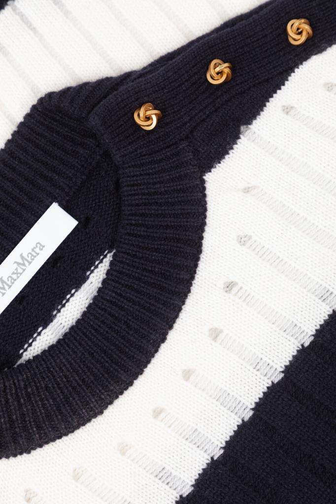 Свитер Max Mara в широкую горизонтальную полоску. Модель сочетает в себе классический дизайн и современный стиль. Смесь шерсти и кашемира обеспечивает непревзойденный комфорт и тепло. Золотистые фигурные пуговицы-«узлы» на левом плече добавляют нотку роскоши, а ребристые манжеты и подол обеспечивают идеальную посадку. Это изделие – незаменимое дополнение к вашему гардеробу.