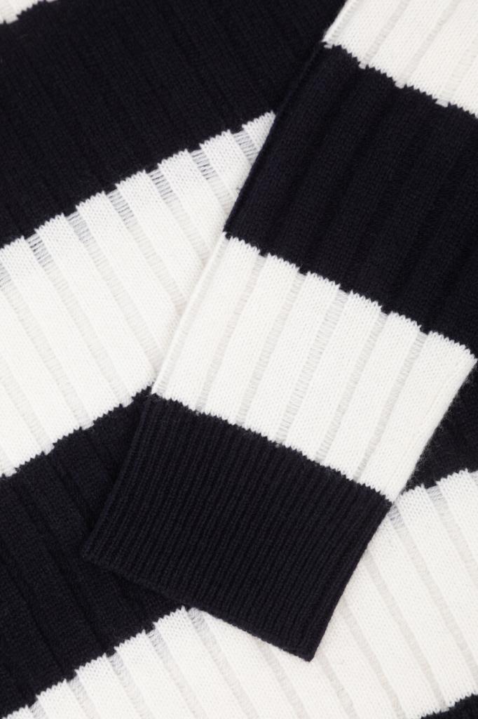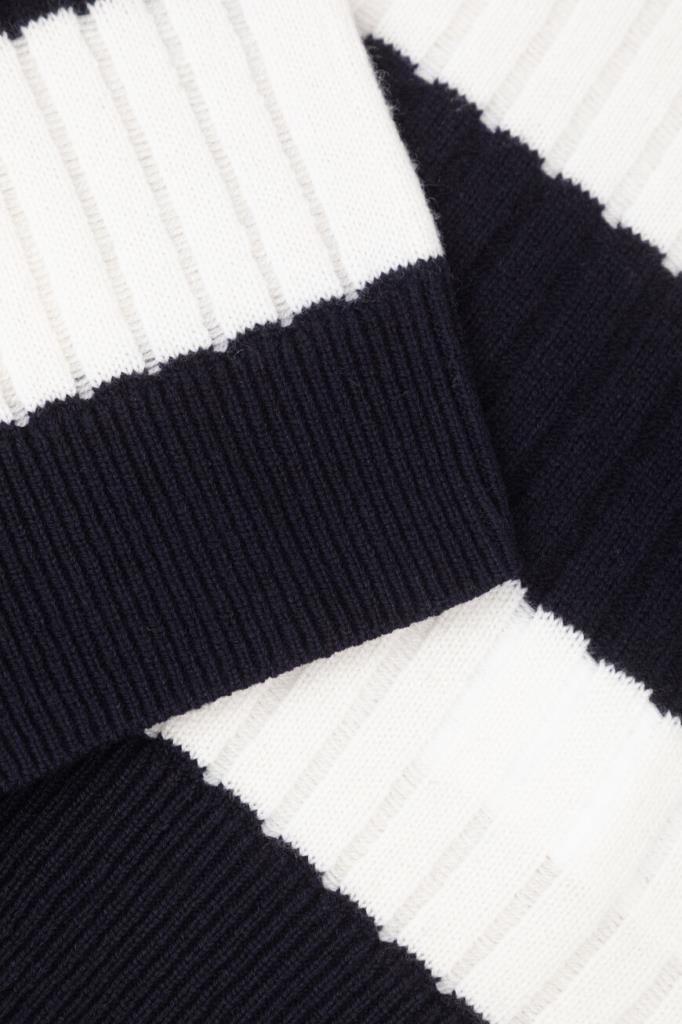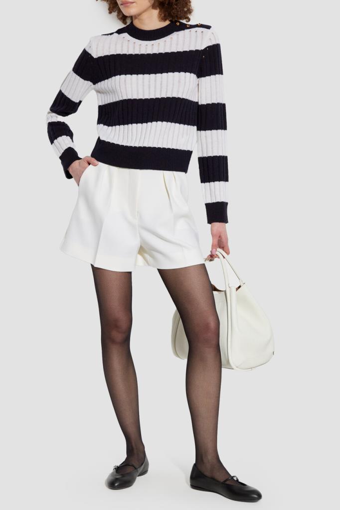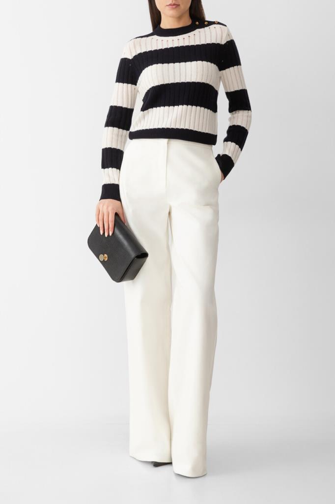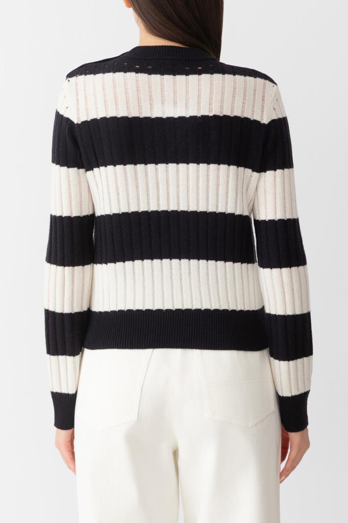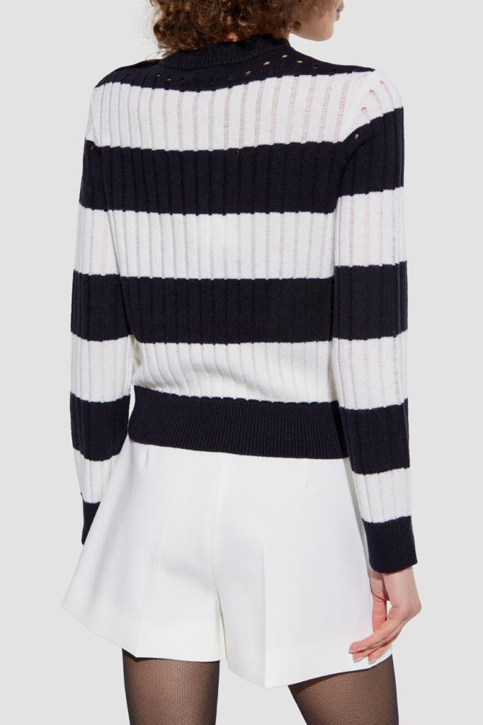 Свитер Max Mara в широкую горизонтальную полоску. Модель сочетает в себе классический дизайн и современный стиль. Смесь шерсти и кашемира обеспечивает непревзойденный комфорт и тепло. Золотистые фигурные пуговицы-«узлы» на левом плече добавляют нотку роскоши, а ребристые манжеты и подол обеспечивают идеальную посадку. Это изделие – незаменимое дополнение к вашему гардеробу.