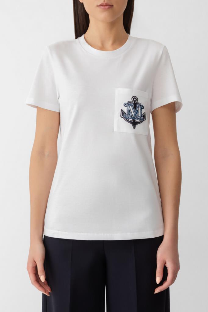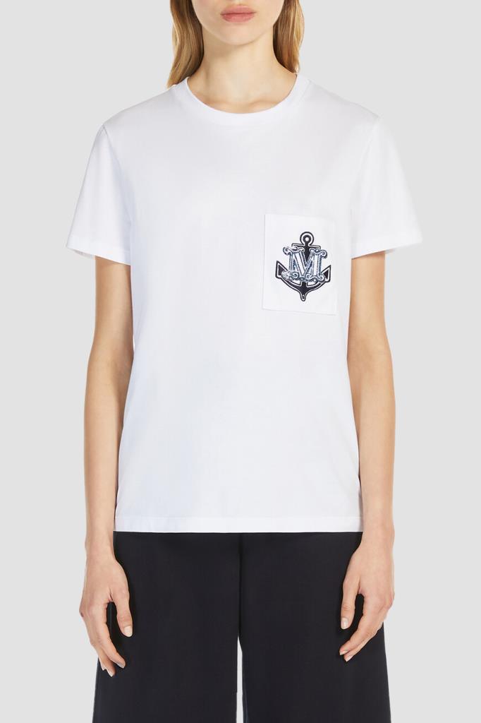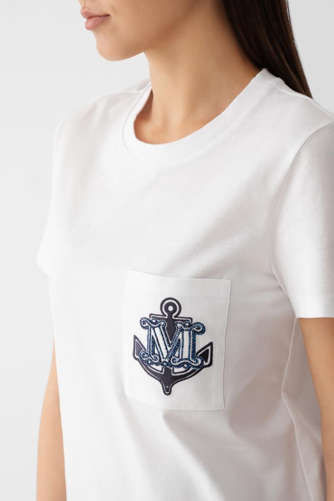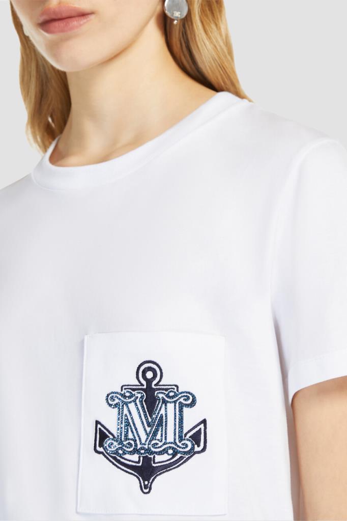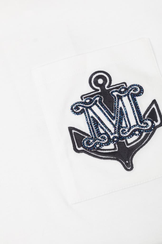 Футболка Max Mara из хлопкового джерси станет надежным спутником в повседневных делах. Классический силуэт, круглый вырез горловины и короткие рукава делают модель универсальной. Синяя вышивка монограммы "M" и морская аппликация с россыпью из страз на ней добавляют особого шарма.