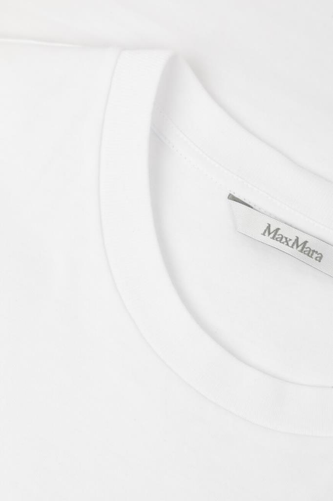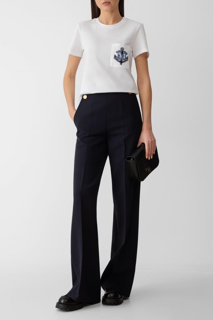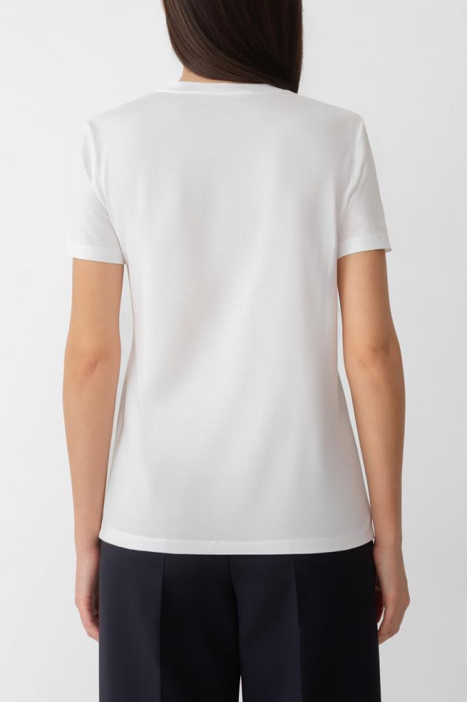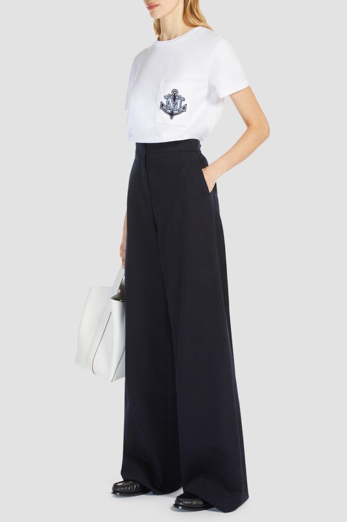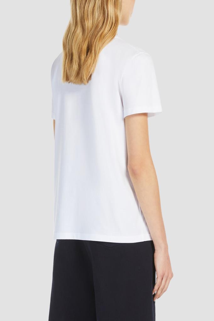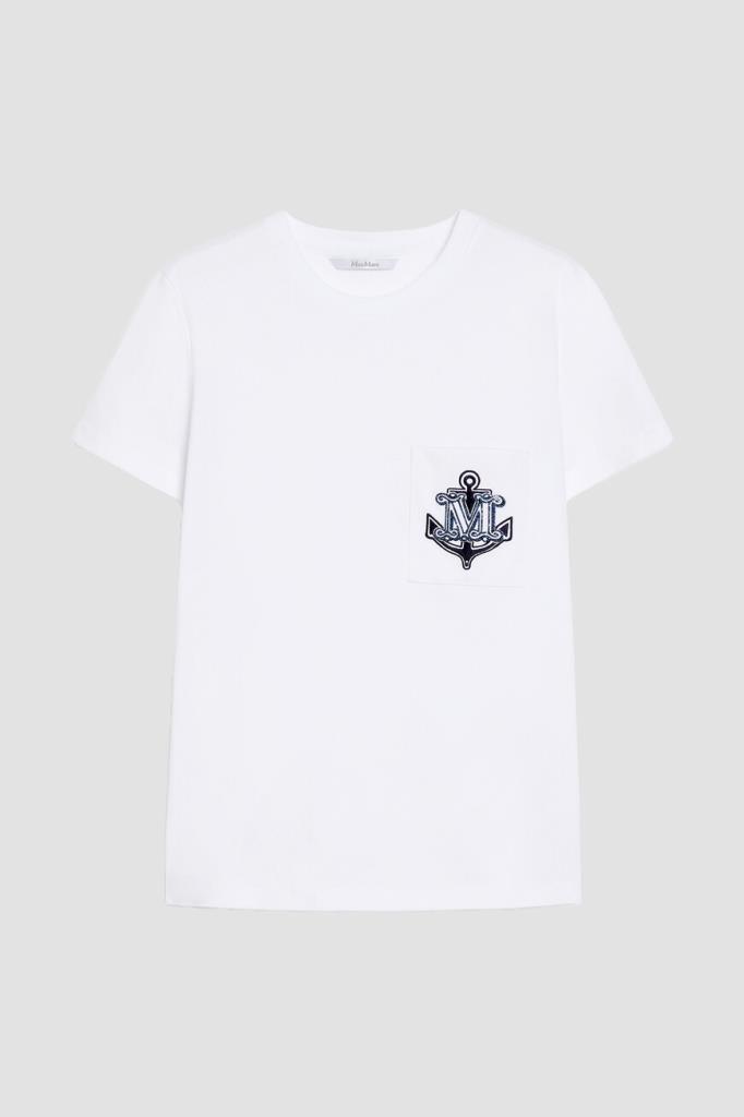 Футболка Max Mara из хлопкового джерси станет надежным спутником в повседневных делах. Классический силуэт, круглый вырез горловины и короткие рукава делают модель универсальной. Синяя вышивка монограммы "M" и морская аппликация с россыпью из страз на ней добавляют особого шарма.