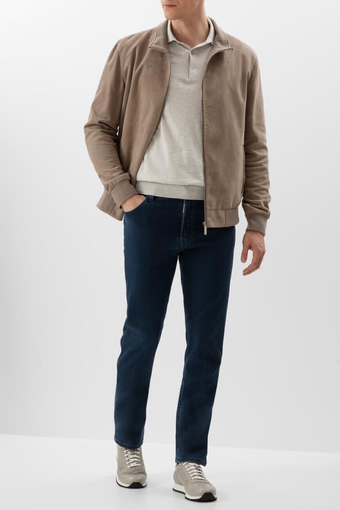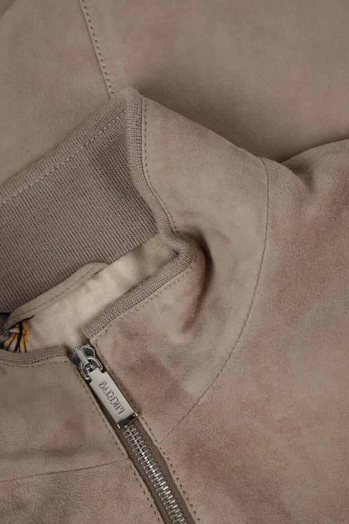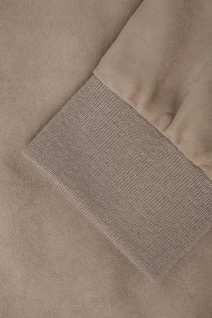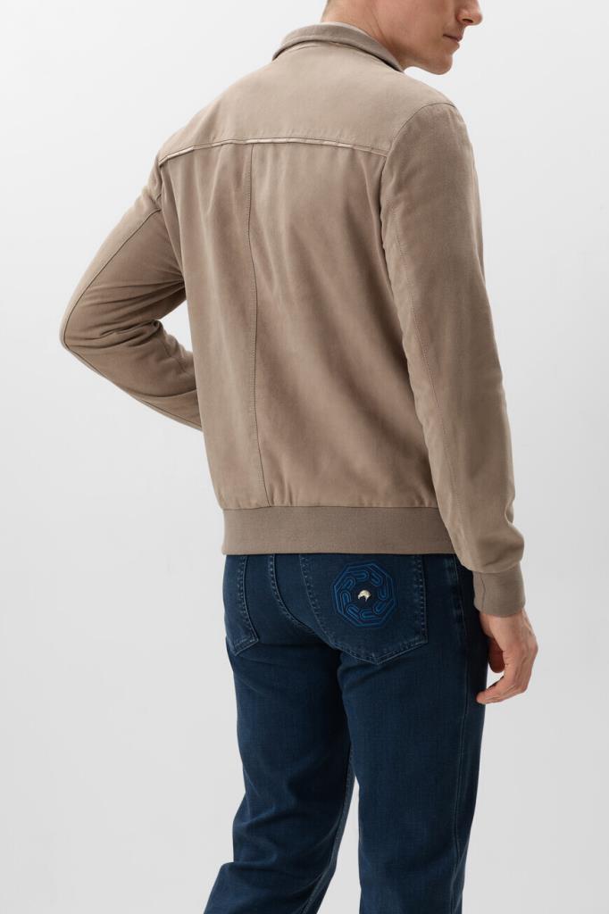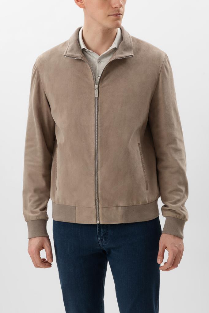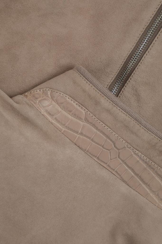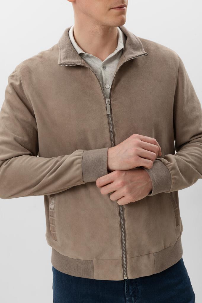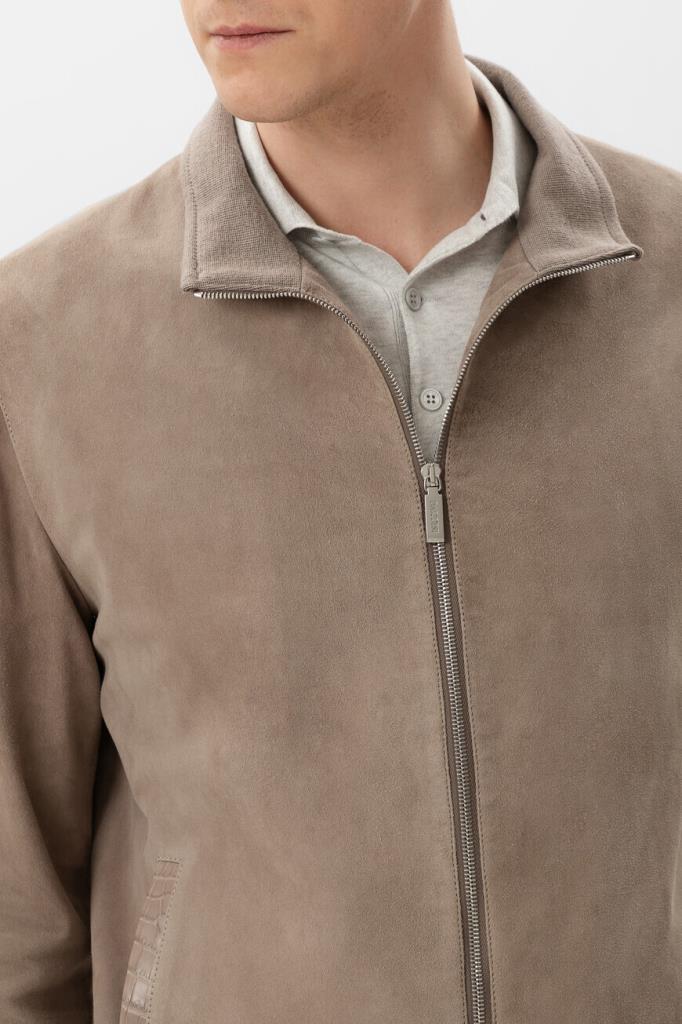 Куртка прямого силуэта от Bardini. Фасон изделия из мягкой бархатистой замши бежевого оттенка предполагает два прорезных кармана по бокам и застёжку на серебристую молнию с брендированным металлическим пуллером. Декором выступает отделка из фактурной кожи крокодила в тон сзади на воротнике, карманах и спинке.