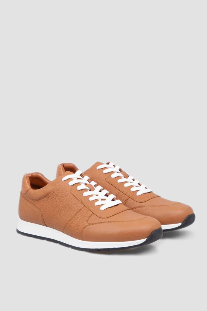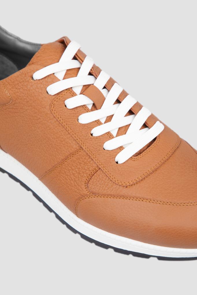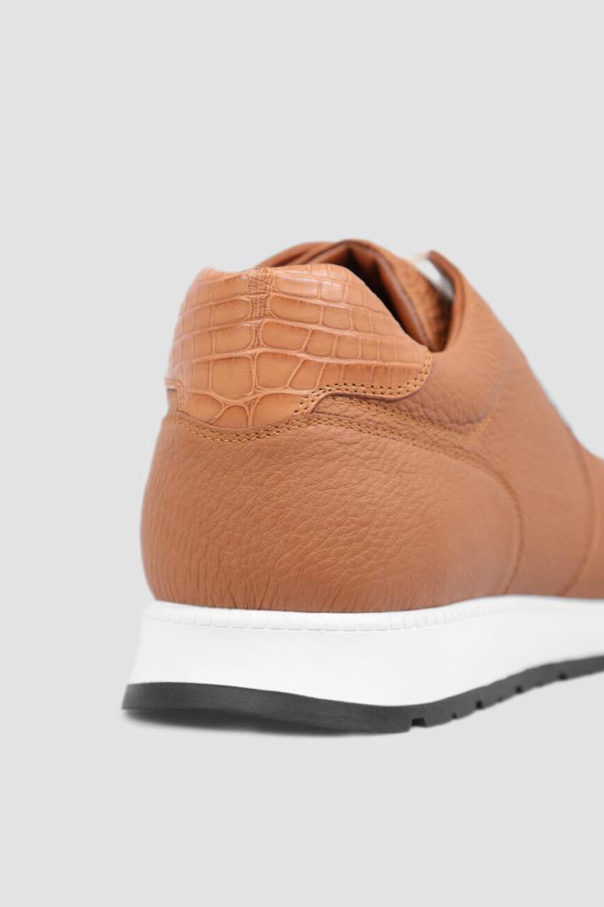Кожаные кроссовки Bardini с закруглённым мысом. Удобная пара обуви окрашена в нейтральный коричневый оттенок и дополнена вставкой из фактурной кожи нильского крокодила на заднике в тон. Изделие ручной работы интересно характерной зернистой текстурой и закрытым типом шнуровки.